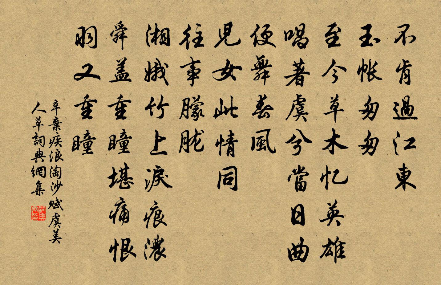 2、不肯句:司馬遷《史記·項羽本紀》:“於是項王乃欲東渡烏江。烏江亭長艤船待,謂項王曰:‘江東雖小,地方千里,眾數十萬人,亦足王也。願大王急渡。今獨臣有船,漢軍至,無以渡。’項王笑曰:‘天之亡我,我何渡為!且籍與江東子弟八千人渡江而西,今無一人還,縱江東父兄憐而王我,我何面目見之?縱彼不言,籍獨不愧於心乎?’乃謂亭長曰:‘吾知公長者。吾騎此馬五歲,所當無敵,嘗一日行千里,不忍殺之,以賜公。’乃令騎皆下馬步行,持短兵接戰。獨籍所殺漢軍數百人。項王身亦被十餘創,顧見漢騎司馬呂馬童,曰:‘若非吾故人乎?’馬童面之,指王翳曰:‘此項王也。’項王乃曰:‘吾聞漢購我頭千金,邑萬戶,吾為若德。’乃自刎而死。”