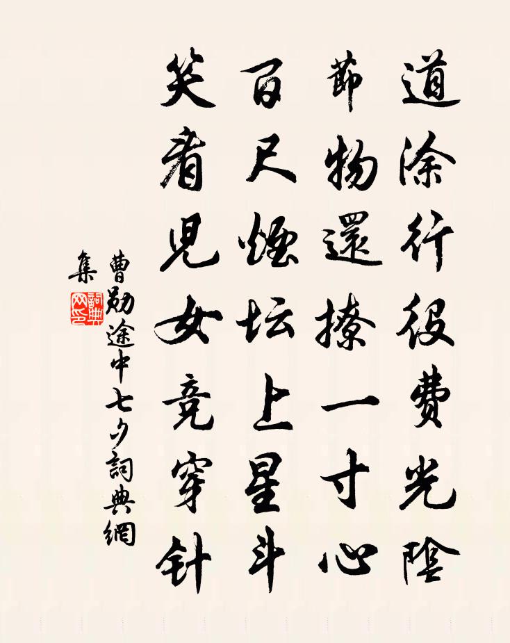 詩詞名句歷史字典書法欣賞書法字典國語詞典說文解字康熙字典古漢語字典標 題 作 者 詩 句 途中七夕作者:曹勛 朝代:宋代途中七夕原文道塗行役費光陰,節物還撩一寸心。百尺煙壇上星斗,笑看兒女競穿針。詩詞問答問:途中七夕的作者是誰?答:曹勛問:途中七夕寫於哪個朝代?答:宋代曹勛途中七夕書法欣賞途中七夕書法作品詩詞推薦清明胡仲參〔宋代〕杯酒濃澆壠上春,東風吹起紙灰塵。可堪腸斷中原路,草掩芒丘不見人。簡俞尉趙蕃〔宋代〕世人往往嗜甘言,正味多嫌橄欖嚴。寄我要須並海物,花豬頓頓飯難厭。贈天台陳道人何夢桂〔宋代〕山中老希夷,長抱白雲睡。睡覺呼蹇驢,悠然出山去。道上忽相逢,為問天下事。長笑不復言,不言有深意。蒼生聞喜宴和御詩杜范〔宋代〕清朝策士屬新元,四海英髦意氣軒。自是冕旒崇直道,亦令韋布效忠言。鹿苹初洽君恩重,鳳藻俄頒帝語溫。此日次韻謝臨川梁知縣寄詩項安世〔宋代〕友散萍分浪,師亡木拱阡。年深多棄井,道遠欠加鞭。不寐思同社,何時共一廛。瑟琴希舊曲,雲淡覓前川。鶴危稹〔宋代〕楚楚雪衣明,煙霞徑里行。不管陶令野,有節伯夷清。一見消塵慮,相親長道情。秋見著梧葉,時作九皋聲。木蘭花/玉樓春佚名〔宋代〕東風昨夜吹春晝。陡覺去年梅蕊舊。誰人能解把長繩,系得烏飛並兔走。清香瀲灩杯中酒。新眼苗條江上柳。尊前宮詞張公庠〔宋代〕月華浮動上階棱,侍宴歸來掩繡屏。子夜酒醒蘭燭暗,碧紗窗外度流螢。志仁監薄示五言十五韻夸徐潭之勝次韻一首劉克莊〔宋代〕嵐翠屏環墅,溪光煉抹坤。尚書華棟改,先輩釣磯存。久臥漳濱疾,誰招楚澤魂。昔慚葵衛足,今喜葉歸根。自志問寐龍樓曉尹直卿〔宋代〕父母人皆有,儀刑自冕旒。問安趨燕寐,拂曉過龍樓。鶴駕嚴晨衛,雞人徹夜籌。茲闈天語接,飛棟月華收。萬姓次月山少監客京韻黃庚〔宋代〕匹馬攙春入帝京,秋深猶未問歸程。一書不及因風寄,千里空教共月明。霄漢已隨黃鵠舉,家山應負白鷗盟。便須蕃方為紀游之詩未就知府寺簿先生寵示佳句敢趙蕃〔宋代〕茲因謀道來,不為看山新。看山雖雲新,圖畫猶昔人。虛亭十日留,欲出凡幾巡。隔江樹差差,俯檻波粼粼。終藉昌甫前詩見簡方和去未達間再於岩叟處見後詩陳文蔚〔宋代〕章泉相去每相思,多謝交情不見遺。繾綣方賡前日句,聯翩又讀後來詩。梅方迎臘多投好,菊已凌霜不入時。大抵題清芬閣吳說〔宋代〕乃祖飛英標萬古,後來奕葉盛三吳。傳家孫達吾何慊,配食子陵德不孤。秀句至今輝簡表,故山從昔鎖松梧。他年和祖擇之詠震山岩彭徵君釣台章友直〔宋代〕岩因更號震山居,台上猶存舊釣磯。一派滄浪真隱處,澄清尚可濯塵衣。贈尋賢相士姚勉〔宋代〕三載須尋一狀元,難尋卻是狀元賢。近時橫浦梅溪老,方是人中第一仙。紙鳶顧逢〔宋代〕只是憑風力,飛騰自不知。轉來高處去,肯顧此身危。雲外搖雙翼,空中寄一絲。每愁吹斷後,欲覓意何之。家鶴乾隆〔清代〕家鶴唳松蔭,聲淒故不揚,野雁叫洲渚,春宇隨翱翔。胡為凌雲姿,遜彼棲蘆行,由來受羈束,只為飽稻粱。垂飛戲謝富相公惠班筍三首邵雍〔宋代〕應物功夫出世間,豈容人可強躋攀。我儂自是不知量,增塿須求比泰山。和靜照詩韻釋大觀〔宋代〕日轂升邊不計程,轉頭已是隔重溟。更遭尊者相勾引,瀑搗飛梁夢未醒。名句推薦裳裳者華,其葉湑兮。佚名《裳裳者華》 夜來南風起,小麥覆隴黃。白居易《觀刈麥》 當年得意如芳草。日日春風好。辛棄疾《虞美人·賦虞美人草》 男兒少為客,不辨是他鄉。李流芳《黃河夜泊》 立身之道何窮,只得一敬字,便事事皆整。王永彬《圍爐夜話·第一六三則》 大風起兮雲飛揚。威加海內兮歸故鄉。劉邦《大風歌》 禮尚往來。往而不來,非禮也;來而不往,亦非禮也。戴聖《禮記·曲禮上》 綠竹含新粉,紅蓮落故衣。王維《山居即事》 出必告,反必面。居有常,業無變。李毓秀《弟子規·入則孝》 蓬頭稚子學垂綸,側坐莓苔草映身。胡令能《小兒垂釣》