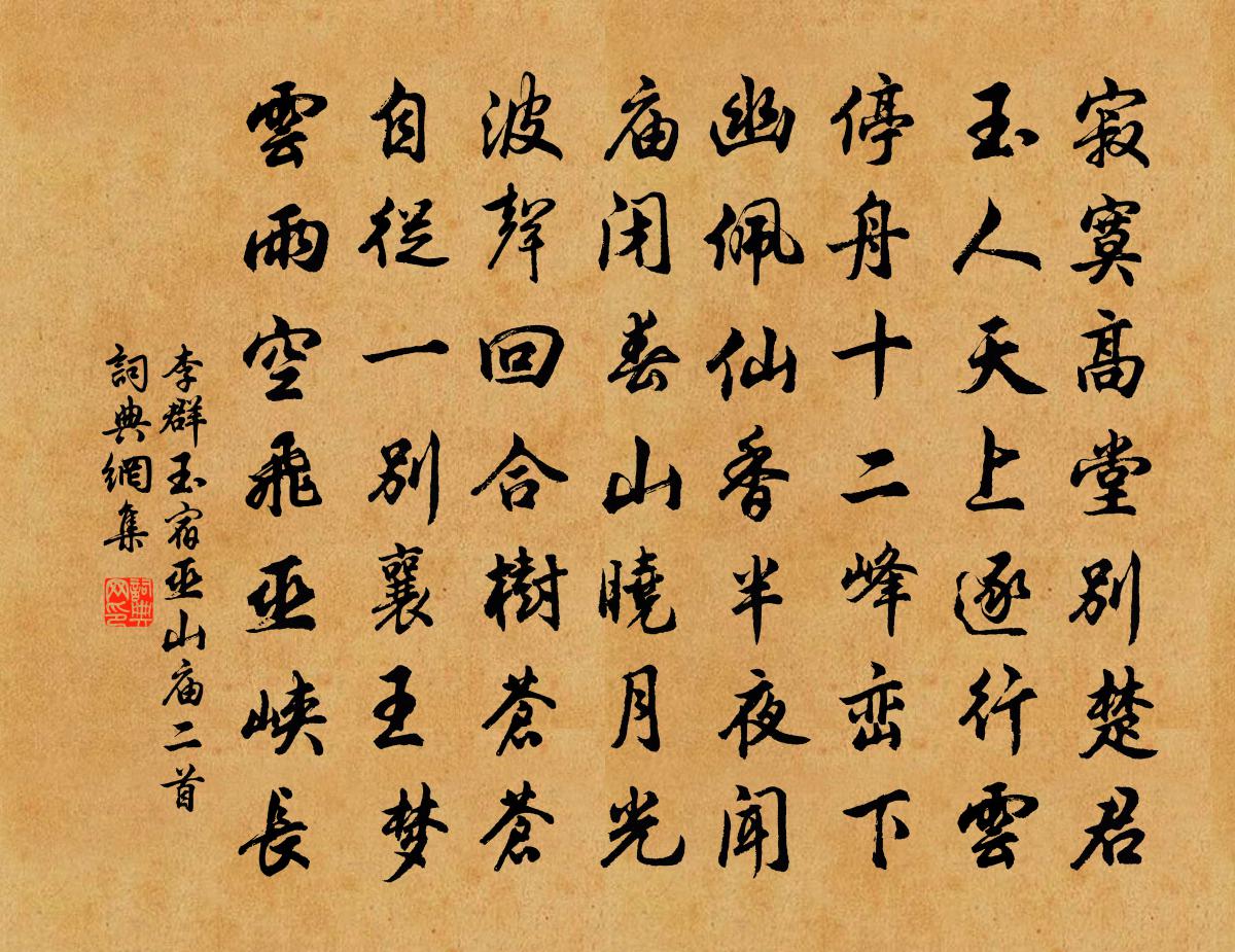 詩詞名句歷史字典書法欣賞書法字典國語詞典說文解字康熙字典古漢語字典標 題 作 者 詩 句 宿巫山廟二首作者:李群玉 朝代:唐代宿巫山廟二首原文寂寞高堂別楚君,玉人天上逐行雲。停舟十二峰巒下,幽佩仙香半夜聞。廟閉春山曉月光,波聲回合樹蒼蒼。自從一別襄王夢,雲雨空飛巫峽長。詩詞問答問:宿巫山廟二首的作者是誰?答:李群玉問:宿巫山廟二首寫於哪個朝代?答:唐代李群玉宿巫山廟二首書法欣賞宿巫山廟二首書法作品注釋全唐詩:卷570-61詩詞推薦過惠崇舊居宋祁〔宋代〕人往名長在,欽風歷故居。社殘蓮即老,園廢柰仍疏。麈憶清談外,雲經合座餘。裴回視齋壁,行草暗殘書。頌古六首釋鹹傑〔宋代〕賢聖法來未曾殺,而今斷這一刀休。果然葛怛胸中落,笑殺靈山老比丘。題尼大德院李洞〔唐代〕雲鬟早歲斷金刀,戒律曾持五百條。台上燈紅蓮葉密,眉間毫白黛痕銷。繡成佛國銀為地,畫出王城雪覆橋。清淨頌古十八首釋師一〔宋代〕不是風兮不是旛,碧天雲靜月團團。幾多乞巧痴男女,猶向床頭瓮里看。宮詞楊皇后〔宋代〕家傅筆法學光堯,聖草真行說兩朝。天從自然成一體,謾夸虎步與龍跳。頌古八首釋雲〔宋代〕家人卦變作明夷,爻象分明不待推。無動無謀終吉慶,有求有用即迍危。滿江紅佚名〔宋代〕雪壓梅敧,寫不就、歲寒清絕。正閬苑、五分里過了,三分臘月。教授以憶梅韻賦雪詩蕃同之五首趙蕃〔宋代〕窮巷朝仍擁,寒廳午未開。人誰送酒直,鴉為致薪材。已倦除頭垢,寧能拭硯埃。高情蒙枉記,好句數能來。蝶戀花佚名〔宋代〕環取其終始不絕。兼致彩絲一絇,文竹茶合碾子一枚。此數物不足見珍,意者欲君子如玉之潔,鄙志如環不解。淚奉酬天平馬十二僕射暇日言懷見寄之作韓愈〔唐代〕天平篇什外,政事亦無雙。威令加徐土,儒風被魯邦。清為公論重,寬得士心降。歲晏偏相憶,長謠坐北窗。與李專美韓昭裔〔唐代〕昭裔登庸汝未登,鳳池雞樹冷如冰。何如且作宣徽使,免被人呼粥飯僧。永遇樂 夜宿燕子樓,夢盼盼,因作此詞蘇軾〔宋代〕明月如霜,好風如水,清景無限。曲港跳魚,圓荷瀉露,寂寞無人見。紞如三鼓,鏗然一葉,黯黯夢雲驚斷。夜茫暑雨項安世〔宋代〕屋下黃流可榜舟,屋頭青瓦更鳴溝。江吞平野魚龍樂,雨閉深林鳥雀愁。雲氣守閭圍溽暑,水風排闥薦涼秋。小窗庭草陸游〔宋代〕階前西風搖百草,鬱郁逢秋殊未槁。雪霜要當次第來,恰似人生怕衰老。百草榮悴則有時,人於養生當自知。金丹倣古思邊釋文珦〔宋代〕去年與君別,綠樹聞啼鴂。今年當此時,憶君未歸。音書難寄遠,珠淚濕羅衣。詠貧士 其四陶淵明〔魏晉〕安貧守賤者,自古有黔婁。好爵吾不榮,厚饋吾不酬。一旦壽命盡,弊服仍不周。豈不知其極,非道故無憂。從來隆興書堂自警三十五首陳淳〔宋代〕古人用功處,步步最縝密。胡爾大闊疏,踐履無其實。和卞仲祥仇遠〔宋代〕吾友卞南仲,別我何匆匆。家有六男兒,乃與不死同。阿祥更穎出,亹亹有父風。翰墨既瀟灑,文字猶研窮。西園春日江津游望杜審言〔唐代〕旅客搖邊思,春江弄晚晴。煙銷垂柳弱,霧卷落花輕。飛棹乘空下,回流向日平。鳥啼移幾處,蝶舞亂相迎。忽嘆隴西行謝靈運〔南北朝〕昔在老子。至理成篇。柱小傾大。綆短絕泉。鳥之棲游。林檀是閒。韶樂牢膳。豈伊攸便。胡為乖枉。從表方圓。名句推薦他鄉共酌金花酒,萬里同悲鴻雁天。盧照鄰《九月九日玄武山旅眺》 天地玄黃,宇宙洪荒。周興嗣《千字文·全文》 江帶峨眉雪,川橫三峽流。李白《經亂離後天恩流夜郎憶舊遊書懷贈江夏韋太守良宰》 明月別枝驚鵲,清風半夜鳴蟬。辛棄疾《西江月·夜行黃沙道中》 鷹擊長空,魚翔淺底,萬類霜天競自由。 * 《沁園春·長沙》 回雁峰前路,煙樹正蒼蒼葛長庚《水調歌頭·江上春山遠》 似醉煙景凝,如愁月露泫。崔護《五月水邊柳》 水流花謝兩無情,送盡東風過楚城。崔塗《春夕》 雪中何以贈君別,惟有青青松樹枝。岑參《天山雪歌送蕭治歸京》 危橋屬幽徑,繚繞穿疏林。柳宗元《巽公院五詠·苦竹橋》