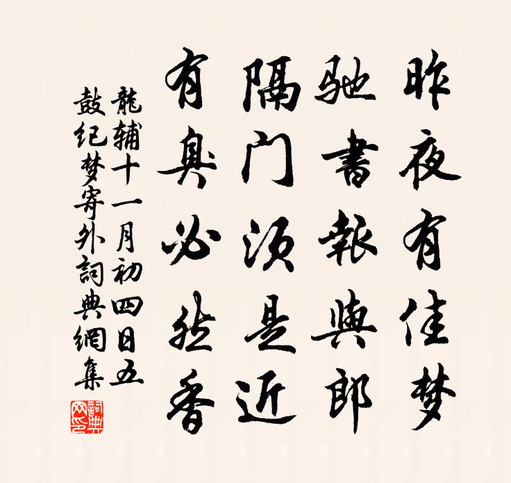 詩詞名句歷史字典書法欣賞書法字典國語詞典說文解字康熙字典古漢語字典標 題 作 者 詩 句 十一月初四日五鼓紀夢寄外作者:龍輔 朝代:宋代十一月初四日五鼓紀夢寄外原文昨夜有佳夢,馳書報與郎。隔門須是近,有臭必然香。詩詞問答問:十一月初四日五鼓紀夢寄外的作者是誰?答:龍輔問:十一月初四日五鼓紀夢寄外寫於哪個朝代?答:宋代龍輔十一月初四日五鼓紀夢寄外書法欣賞十一月初四日五鼓紀夢寄外書法作品詩詞推薦畫觀世音贊方回〔宋代〕□見呻吟,我砭我針。人有此心,即觀世音。秋日(一作落照)耿湋〔唐代〕照耀天山外,飛鴉幾共過。微紅拂秋漢,片白透長波。影促寒汀薄,光殘古木多。金霞與雲氣,散漫復相和。水龍吟(壽婺州守趙岩起右撰孟傳)陳著〔宋代〕玉鰲頭上蓬萊,十分好處饒松壑。無邊風月,陰陰喬木,重重華萼。秋水門庭,淡交簪履,隨宜斟酌。向西風回首秋思陸游〔宋代〕虛極靜篤道乃見,仁至義盡余可憂。名山採藥恐未免,策蹇孰能從我游?題僧文瑩所居壁鄭獬〔宋代〕西湖頻送客,綠波舟楫輕。春入蘿徑靜,浪花翻遠晴。卜運算元 新柳納蘭性德〔清代〕嬌軟不勝垂,瘦怯那禁舞。多事年年二月風,翦出鵝黃縷。一種可憐生,落日和煙雨。蘇小門前長短條,即漸迷行萬年歡蘇氏〔宋代〕日暖霜紅,畫戟門開,錦筵歌振梁塵。正是慈闈熙熙,慶誕佳辰。象服魚軒燦爛,喜高年、福祿長新。承顏處,朱舉葦航適安飲陳起〔宋代〕獻酬無算是杯行,午酌從容至四更。陶母侈於真率約,退思無倦若為情。毛老鬥牛文同〔宋代〕牛牛爾何爭,於此輒斗怒。長鞭鬧兒童,大炬走翁嫗。蒼{狄火換婁} * 子,駭立各四顧。何時解角歸,茅舍江偈頌二十五首釋普岩〔宋代〕斷楊歧正脈,壞臨濟綱宗。赤土塗牛奶,密室不通風。身產身後池,深瘞白雲之中。非父非子,狹路相逢。澗藻溪淮南送司勛李郎中赴闕羅隱〔唐代〕中朝品秩重文章,雙筆依前賜望郎。五夜星辰歸帝座,半年樽俎奉梁王。南都水暖蓮分影,北極天寒雁著行。不必偈頌八十五首釋妙倫〔宋代〕昔年出此門去,步步踏著。今日入此門來,頭頭撞著。畢竟以何為驗,洎合道著。和微之詩二十三首。和我年三首白居易〔唐代〕我年五十七,榮名得幾許。甲乙三道科,蘇杭兩州主。才能本淺薄,心力虛勞苦。可能隨眾人,終老於塵土?我年閒居洪咨夔〔宋代〕暑設青練幕,晴更皂葛巾。家貧猶氣象,人老亦精神。蜂鬧花生計,蛾翾繭化身。靜中觀物變,同是一天真。洛浦善先長老贈詩自方無本惠勤答詩二首劉克莊〔宋代〕安知先長老,不是昔勤公。爾有五七字,今無六一翁。次綱官王簿韻兼簡伯潛二首廖行之〔宋代〕江上晴光照眼濃,十分春色滿城東。客懷何限湘波綠,漕事方殷漢粟紅。雅有詩情添興遠,可無酒力破愁攻。舳艫偈頌一百二十三首釋崇岳〔宋代〕衲僧一拶,缽盂口闊。天下楊岐,望林止渴。聽航船歌十首方回〔宋代〕北來南去雁還飛,四十年間萬事非。惟有航船歌不改,夜深老淚欲沾衣。路傍草方回〔宋代〕野火燎荒原,霜雪日皜皜。牛羊無可噍,眾綠就枯槁。天地心不泯,根芽蟄深杳。春風一披拂,顏色還媚好。如何曲遊春(清明湖上)施岳〔宋代〕畫舸西泠路,占柳陰花影,芳意如織。小楫衝波,度麴塵扇底,粉香簾隙。岸轉斜陽隔。又過盡、別船簫笛。傍斷名句推薦寒夜客來茶當酒,竹爐湯沸火初紅。杜耒《寒夜》 香霧雲鬟濕,清輝玉臂寒。杜甫《月夜》 辭君向天姥,拂石臥秋霜。李白《別儲邕之剡中》 念寒蛩殘夢,歸鴻心事,那聽江村夜笛。吳文英《瑞鶴仙·秋感》 驚回千里夢,已三更。起來獨自繞階行。岳飛《小重山·昨夜寒蛩不住鳴》 落紅不是無情物,化作春泥更護花。龔自珍《己亥雜詩·其五》 風驅急雨灑高城,雲壓輕雷殷地聲。劉基《五月十九日大雨》 岸容待臘將舒柳,山意沖寒欲放梅。杜甫《小至》 二秋葉神媛,七夕望仙妃。任希古《和長孫秘監七夕》 參軍春思亂如雲,白髮題詩愁送春歐陽修《春日西湖寄謝法曹歌》