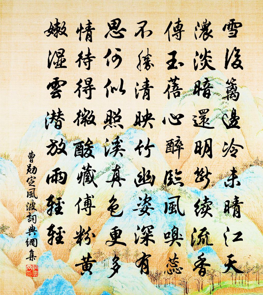 詩詞名句歷史字典書法欣賞書法字典國語詞典說文解字康熙字典古漢語字典標 題 作 者 詩 句 定風波作者:曹勛 朝代:宋代定風波原文雪後籬邊冷未晴。江天濃淡暗還明。斷續流香傳玉蓓。心醉。臨風嗅蕊不勝清。映竹幽姿深有思。何似。照溪真色更多情。待得微酸藏傅粉。黃嫩。濕雲潛放雨輕輕。詩詞問答問:定風波的作者是誰?答:曹勛問:定風波寫於哪個朝代?答:宋代曹勛定風波書法欣賞定風波書法作品詩詞推薦送馮夢授試禮部李新〔宋代〕殷樹蔥籠繡曉暾,馬蹄東去亂冰痕。世收徵詔藏商谷,家有新功刻禹門。太白夜郎初辱顧,馮唐漢殿欲承恩。南山贈別儀上人張耒〔宋代〕師似浮雲觸處閒,倦飛知我未能還。林泉會有相逢日,風月應須乞半山。寧府上房對聯曹雪芹〔清代〕世事洞明皆學問,人情練達即文章。江上懷翠微寺空上人崔塗〔唐代〕旅泛本無定,相逢那可期。空懷白閣夜,未答碧雲詩。暮雨潮生早,春寒雁到遲。所思今不見,鄉國正天涯。建康六感宋劉子翬〔宋代〕寄奴真偉人,落拓龍潛地。據筵呼五木,已有吞世氣。世期值陽九,天綱日淪夫。偏邦可跨州,卑號猶稱帝。匪乘即事陸游〔宋代〕了事如何省事奇,無心始覺有心痴。三更急雨打窗破,正是擁爐危坐時。寒食西湖蔡襄〔宋代〕山前雨氣曉才收,水際內光翠欲流。盡日旌旗停曲岸,滿潭鉦鼓競飛舟。浮來煙島疑相就,引去山禽好自由。歸騎遠遊十首韓元吉〔宋代〕崑崙九萬里,磅礴天地根。其下有玄圃,茲惟眾仙門。翩然兩白鶴,道我前飛翻。問津牽牛星,濯足洪河源。九關和彭城王生悼歌人盼盼賀鑄〔宋代〕東園花下記相逢,倩盼偷回一笑濃。書簏尚緘香豆蔻,鏡奩初失玉芙蓉。歌闌燕子樓前月,魂斷鳳皇原上鍾。寄語二十一日雨趙蕃〔宋代〕疾風吹倒庭前樹,更有飛來雨如注。終朝畏暑自脫巾,亟起收書不能屨。前山雲重如潑墨,坐想溪流高數尺。是間寄柳舍人宗元賈島〔唐代〕格與功俱造,何人意不降。一宵三夢柳,孤泊九秋江。擢第名重列,沖天字幾雙。誓為仙者仆,側執馭風幢。靈照女贊釋心月〔宋代〕盡道家貧賣笊籬,潑天富貴許誰知。風前斂手一轉語,未必丹霞識得伊。別元質李流謙〔宋代〕遠夢燈頻照,覉懷酒重傾。啼烏翻夕露,歸雁占秋晴。此地豐魚稻,如君好弟兄。語離亦怊悵,松檟獨關情。自警陸游〔宋代〕少年不自量,妄意慕管葛;晚節雖知難,猶覬終一豁。悲哉老病馬,解縱誰復秣?既辭箠轡勞,始愛原野闊。飲澗送程楚翁遠遊謝枋得〔宋代〕近日人傳庾嶺梅,南枝落盡北枝開。長安舊日元無此,儘是江南人送來。舟次九山黃庚〔宋代〕水雲盡處列奇峰,螺髻參差杳靄中。江岸維舟看不了,煙嵐分碧入疏蓬。送趙吏部釋善珍〔宋代〕撫槎泝銀潢,手探支機石。天孫繭瓮絲,擬補袞五色。星斗光離離,欲見無羽翼。舊恩倘可報,殺身奚足惜。再次韻四首陳造〔宋代〕公朝已後茹茅連,幕府偷閒亦所天。寵辱肯為差別觀,道人隨寓只怡然。不同吟邵雍〔宋代〕求者不得,辭者不能。二者相去,其遠幾程。中谷有蓷佚名〔先秦〕中谷有蓷,暵其乾矣。有女仳離,嘅其嘆矣。嘅其嘆矣,遇人之艱難矣!中谷有蓷,暵其修矣。有女仳離,條其嘯名句推薦行到小溪深處,有黃鸝千百。秦觀《好事近·夢中作》 嘆息聊自思,此生豈我情。王績《石竹詠》 楓樹夜猿愁自斷,女蘿山鬼語相邀李商隱《楚宮》 巧匠目意中繩,然必先以規矩為度韓非及後人《韓非子·有度》 故大人之務,將在於眾賢而已。墨子《墨子·08章 尚賢(上)》 居高聲自遠,非是藉秋風。虞世南《蟬》 且看欲盡花經眼,莫厭傷多酒入唇。杜甫《曲江二首》 絕頂茅庵里,老衲正孤吟。納蘭性德《水調歌頭·題西山秋爽圖》 昨日入城市,歸來淚滿巾。張俞《蠶婦》 馬者,所以命形也;白者,所以命色也。公孫龍《公孫龍子·白馬論》