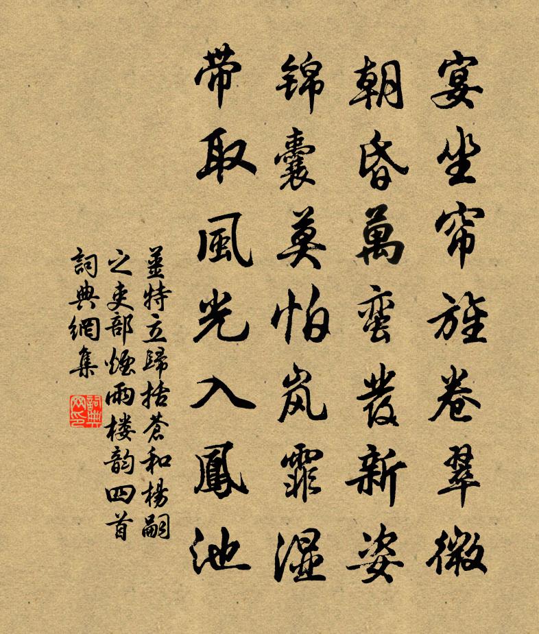 詩詞名句歷史字典書法欣賞書法字典國語詞典說文解字康熙字典古漢語字典標 題 作 者 詩 句 歸括蒼和楊嗣之吏部煙雨樓韻四首作者:姜特立 朝代:宋代原文宴坐簾旌卷翠微,朝昏萬蠻發新姿。錦囊莫怕嵐霏濕,帶取風光入鳳池。詩詞問答問:《歸括蒼和楊嗣之吏部煙雨樓韻四首》的作者是誰?答:姜特立問:該詩寫於哪個朝代?答:宋代書法欣賞歸括蒼和楊嗣之吏部煙雨樓韻四首書法作品詩詞推薦蘭陵王李曾伯〔宋代〕甚天色。苦問桃紅李白。伊祈氏,沙際才歸,依約春回曉煙濕。老寒猶煞忒。景物。中年慣識。天應遣,雨洗風梳贈天隱李君瑞一首劉克莊〔宋代〕唱名納祿尤崖異,誓墓休官更崛奇。先輩翔而皆集矣,廣文得此欲逃之。聖門豈不高曾皙,列傳何為首伯夷。虎帥次韻楊君金送酒黃庭堅〔宋代〕扶衰卻老世無方,惟有君家酒未嘗。秋入園林花老眼,茗搜文字響枯腸。醡頭夜雨排檐滴,杯麵春風繞鼻香。不待佛惠寺阮閱〔宋代〕細雨斜風入亂山,濕雲堆里見東關。一筇來訪林間寺,杜寺數聲春又還。蔡忠惠祀歌洛陽橋佚名〔宋代〕一望五里排琨瑤,行人不憂滄海潮。沖衝來往乘仙飈,蔡公作成去還朝,玉虹依舊橫青霄。考之溱洧功何遼,乍涼陸游〔宋代〕涼風蘇病骨,搖落起詩情。一病輒數日,幾詩終此生?招呼丹灶客,結束玉霄行。預想溪橋路,三更待月明。次韻虞退夫除夕七絕句魏了翁〔宋代〕幾度將心安處安,有時中夜起長嘆。年來識得安心法,否泰元從隨蟲看。題永福黃生行卷劉克莊〔宋代〕廢詩二十餘年矣,忽讀來詩眼暫明。處士梅曾如許瘦,化人酒莫過於清。蛩鳴競起為唐體,牛耳誰堪主夏盟。事闊挽太平趙倅三首劉宰〔宋代〕當年垂橐叩天閽,自笑唯餘舌尚存。下榻勤君延孺子,加餐愧我異王孫。歸歟益軫門闌舊,至止頻承笑語溫。一日和田家趙希逢〔宋代〕布衫裁就短平腰,兩兩三三步小橋。粗態撩人在何處,山花鬢畔露村嬌。點絳唇(德茂生朝作)李流謙〔宋代〕一翦秋光,阿誰洗得無纖滓。冰盤徹底。人也清如此。萬里歸來,著個斑衣戲。慈顏喜。問君不醉。更遣何人醉。憶雲之元稹〔唐代〕為魚實愛泉,食辛寧避蓼。人生既相合,不復論窕窕。滄海良有窮,白日非長皎。何事一人心,各在四方表。泛若偈頌七十八首釋正覺〔宋代〕去時不出戶,來時不入門。清癯山有骨,閒澹雲無根。歸家奉祖禰,了事還兒孫。雲水通方士,相期報佛恩。敕賜寧王池宴張九齡〔唐代〕賢王有池館,明主賜春遊。淑氣林間發,恩光水上浮。徒慚和鼎地,終謝巨川舟。皇澤空如此,輕生莫可酬。冷坐仇遠〔宋代〕冷官宜靜坐,借屋近荒村。無酒可延客,未昏先閉門。水明知月上,木落見梅尊。滿目淒涼者,相逢不必言。古風五十九首李白〔唐代〕其一大雅久不作。吾衰竟誰陳?王風委蔓草。戰國多荊榛。龍虎相啖食。兵戈逮狂秦。正聲何微茫。哀怨起騷人。訪古寺老僧不遇書壁文同〔宋代〕寂寂復寂寂,門前苔蘚積。巾缽定何之,禪房封屈膝。蛛絲網窗戶,蝸涎篆牆壁。欲去重遲留,空中望歸錫。獨登南樓兼懷嚴聖幾俞若晦章甫〔宋代〕晝景微微斂,陰雲稍稍低。炎涼催旅燕,風雨聽鳴雞。獨立江樓上,想思浙水西。詩情兼酒伴,何日手重攜。晝臥口占二首張耒〔宋代〕人事日益遠,秋居何颯然。苔隨牆半雨,葉放樹中天。皇祐觀享明堂六首佚名〔宋代〕我將我享,辟我中助。獻終豆入,禮成樂具。飾駕上游,升為高釐。神保聿歸,介北景祚。名句推薦疾雷不及塞耳,疾霆不暇掩目。劉安及其門客《淮南子·兵略訓》 素富貴,行乎富貴;素貧賤,行乎貧賤;素夷狄,行乎夷狄;素患難,行乎患難。君子無入而不自得焉。子思《中庸·第十四章》 今日暫同芳菊酒,明朝應作斷蓬飛。王之渙《九日送別》 盡教春思亂如雲,莫管世情輕似絮晏幾道《玉樓春·雕鞍好為鶯花住》 記得別伊時,桃花柳萬絲。納蘭性德《菩薩蠻·新寒中酒敲窗雨》 日暮飛鴉集,滿山蕎麥花。溫庭筠《題盧處士山居 / 處士盧岵山居》 舉頭紅日近,回首白雲低。寇準《詠華山》 易其田疇,薄其稅斂,民可使富也。孟子《孟子·盡心章句上·第二十三節》 黃河曲里沙為岸,白馬津邊柳向城。高適《夜別韋司士》 想邊鴻孤唳,砌蛩私語。王沂孫《掃花游·秋聲》
