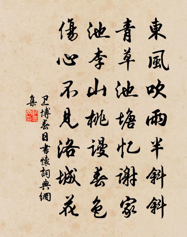 詩詞名句歷史字典書法欣賞書法字典國語詞典說文解字康熙字典古漢語字典標 題 作 者 詩 句 春日書懷作者:衛博 朝代:宋代春日書懷原文東風吹雨半斜斜,青草池塘憶謝家。池李山桃謾春色,傷心不見洛城花。詩詞問答問:春日書懷的作者是誰?答:衛博問:春日書懷寫於哪個朝代?答:宋代衛博春日書懷書法欣賞春日書懷書法作品詩詞推薦初夏晚興張嵲〔宋代〕微月破幽樹,草露生夕涼。夏木紛已成,時禽暮歸翔。閒花自白紅,無人領幽芳。晚沐岸輕幘,披衣暫倘佯。外徇西江月 四苦王哲〔元代〕堪嘆生老病死,世間大病洪*。傷嗟戇鹵強添和。怎免輪迴這個。獨我搖頭不管,時臨還與他麽。玉花叢里睹瓊科紹熙壬子勸耕妙勝四首陳造〔宋代〕勝日乘閒覺半仙,笑摩老眼向風煙。平章春事禽能語,媚嫵韶光柳未眠。呈徑畈徐左司劉黻〔宋代〕五載相違一日過,巷無車跡有樵歌。因嗟世上深危證,合住山中養太和。蔓草不知春事去,梅花曾識歲寒多。予今雲間閣留題壁間張垓〔宋代〕清江一曲抱村流,古柏千莖繞徑幽。天畔峰巒俱秀峙,壁間珠玉爛凝眸。遙觀細菊重岩下,共作攜壺九口游。回首憶秦娥張元乾〔宋代〕桃花萼。雨肥紅綻東風惡。東風惡。長亭無寐,短書難托。征衫辜負深閨約。禁菸時候春羅薄。春羅薄。多應消瘦偈釋自清〔宋代〕糞箕扛去轎抬回,優缽曇花向日開。但願老僧高著眼,管教平地一聲雷。示施又新同舍蘇籀〔宋代〕華發些些似不公,辰申齪齪有何庸。力拋羈紲片時適,談謔槃筵一笑烘。山剎汲壺茶可點,匠人礲斲事方叢。麥秋晝權德輿〔唐代〕孤舟漾曖景,獨鶴下秋空。安流日正晝,淨綠天無風。浣溪沙劉一止〔宋代〕曾向蓬萊得姓名。坐中省識是飛瓊。琵琶翻作步虛聲。一自當時收撥後,世間弦索不堪聽。夢回淒斷月朧明。題義門胡氏華林書院李巽〔宋代〕孝義門風累世修,帝恩旌表耀南州。藏書不特延多士,貢幣仍聞亞列侯。高閣聲寒慈竹雨,小池香老瑞蓮秋。人來挽湯丞相三首吳芾〔宋代〕遊刃有餘地,孤忠不愧天。兩朝資弼亮,四海賴陶甄。身後浮言洶,生前素履全。他時公論定,史筆看流傳。蜂蟻李石〔宋代〕乳蜂十蟻圍,小蜂兩翼弱。三蟻制蜂首,四蟻曳蜂腳。三蟻相後前,捍圉行且卻。蜂母正憑怒,有蠆無敢作。相視贈衡山令裴說〔唐代〕君吟十二載,辛苦必能官。造化猶難隱,生靈豈易謾。猿跳高岳靜,魚擺大江寬。與我為同道,相留夜話闌。春旱忽兩五絕劉克莊〔宋代〕周匝荒原遍,延緣斷港通。馬鬃渠有力,龍骨爾何功。寒食日雲表〔唐代〕寒食悲看郭外春,野田無處不傷神。平原累累添新冢,半是去年來哭人。南鄉子(和謝潛庵蔣山)王奕〔宋代〕搔首倚薰風。一幅畫圖塵土中。鶴怨猿驚人去也,潛龍。誰絞香車起蟄松。歲月去熙豐。世味人情自淡濃。春去春寄茅山何威儀二首陸龜蒙〔唐代〕大小三峰次九華,靈蹤今盡屬何家。漢時仙上雲巔鶴,蜀地春開洞底花。閒傍積嵐尋瀑眼,便凌殘雪探芝芽。年來望江南/憶江南趙時行〔宋代〕霜月濕,人睡矮篷秋。驚覺夜深兒女夢,漁歌風起白苹洲。別岸又潮頭。頌古一百首釋智愚〔宋代〕收放隨時雖有淮,出門入戶恐難論。長安路子君須到,莫向深村草里蹲。名句推薦今夜鄜州月,閨中只獨看。杜甫《月夜》 殘杏枝頭花幾許。啼紅正恨清明雨。趙令畤《蝶戀花·欲減羅衣寒未去》 茶性儉,不宜廣,廣則其味黯澹。陸羽《茶經·五之煮》 病骨支離紗帽寬,孤臣萬里客江乾。陸游《病起書懷》 上林苑裡花徒發,細柳營前葉漫新。杜審言《春日京中有懷》 魯女東窗下,海榴世所稀。李白《詠鄰女東窗海石榴》 此去經年,應是良辰好景虛設。柳永《雨霖鈴·寒蟬淒切》 遠去不逢青海馬,力窮難拔蜀山蛇。李商隱《詠史二首·其二》 雨中百草秋爛死,階下決明顏色鮮。杜甫《秋雨嘆三首》 細雨斜風作曉寒。淡煙疏柳媚晴灘。蘇軾《浣溪沙·元豐七年十二月二十四日從泗州劉倩叔游南山》