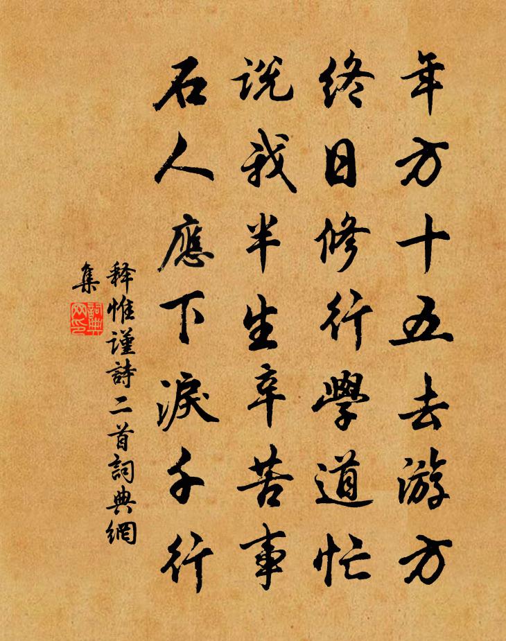詩詞名句歷史字典書法欣賞書法字典國語詞典說文解字康熙字典古漢語字典標 題 作 者 詩 句 詩二首作者:釋惟謹 朝代:宋代詩二首原文年方十五去遊方,終日修行學道忙。說我半生辛苦事,石人應下淚千行。詩詞問答問:詩二首的作者是誰?答:釋惟謹問:詩二首寫於哪個朝代?答:宋代釋惟謹詩二首書法欣賞詩二首書法作品詩詞推薦揚州雜詩林泳〔宋代〕落日吟詩望戍樓,煙花空憶古揚州。開明橋下千家市,但見朝朝掛髑髏。君莫非(此後九首和李餘)元稹〔唐代〕鳥不解走,獸不解飛。兩不相解,那得相譏。犬不飲露,蟬不啖肥。以蟬易犬,蟬死犬飢。燕在梁棟,鼠在階基。留別白居易〔唐代〕秋涼卷朝簟,春暖撤夜衾。雖是無情物,欲別尚沉吟。況與有情別,別隨情淺深。二年歡笑意,一旦東西心。獨留和太學趙鴻博士歸蔡中李頻〔唐代〕得祿從高第,還鄉見後生。田園休問主,詞賦已垂名。掃壁前題出,開窗舊景清。遙知賢太守,致席日邀迎。識字行洪咨夔〔宋代〕識字不用多,識多反為累。結交何用深,交深或中棄。紫微有君房,郎將得賓王。胸無半點墨,七襄亦成章。票姚書近況寄蜀中道舊陸游〔宋代〕遺事復遺榮,空齋一榻橫。宿酲投未正,新句鍛初成。山崦傳梅信,天窗送雪聲。戲題勻碧紙,遣鶴報青城。同將作韋二少監贈水部李郎中張籍〔唐代〕舊年同是水曹郎,各罷魚符自楚鄉。重著青衫承詔命,齊趨紫殿異班行。別來同說經過事,老去相傳補養方。憶得詠破扇唐怡〔唐代〕輪如明月盡,羅似薄雲穿。無由重掩笑,分在秋風前。東歸望華山吳融〔唐代〕碧蓮重疊在青冥,落日垂鞭緩客程。不奈春煙籠暗淡,可堪秋雨洗分明。南邊已放三千馬,北面猶標百二城。只怕題杭州孤山寺張祜〔唐代〕樓台聳碧岑,一逕入湖心。不雨山長潤,無雲水自陰。斷橋荒蘚澀,空院落花深。猶憶西窗月,鐘聲在北林。是夕微雨趙蕃〔宋代〕臘雪財覆地,春雨不溜瓦。天公務塞責,人意自嫌寡。豈惟田未耕,況是麥在野。安得三日霖,滂沱遍天下。桂吳泳〔宋代〕團團玉葉振天芳,清澈瓊樓午夜光。元是小山分鐘去,移來西蜀作甘棠。頌古三十三首釋師觀〔宋代〕一著高一著,一步闊一步。五百年間生,指出這條路。這條路,十聖三賢皆罔措。頌證道歌證道歌釋印肅〔宋代〕一顆圓光非內外,鎮海明珠今尚在。仰山不敢自埋藏,問著靈知當不昧。皂角林釋行海〔宋代〕皂角林邊殺氣新,淒涼偏感北征人。我來認作將軍樹,汲靜當年打女真。送曹資深受代還京兼簡劉養正晁說之〔宋代〕韓王孫子何楚楚,不用根源論魏武。讀書射獵固自如,劇談大笑能爾汝。為君相遇在東州,與我中分萬斛愁。我歸舟中誦陶詩及諸葛傳王遂〔宋代〕隆中氣象接莘磻,心術精微日月寒。學到聖賢無盡處,一毫人力不容安。和子瞻學士游祖塔院釋來復〔宋代〕金沙泉涌雪濤香,灑作醍醐大地涼。倒侵九天河影白,遙通百穀海聲長。僧來汲月歸靈石,人到尋源宿上方。欲著寄史處士伍喬〔唐代〕長羨閒居一水湄,吟情高古有誰知。石樓待月橫琴久,漁浦經風下釣遲。僻塢落花多掩徑,舊山殘燒幾侵籬。松門縣齋韋應物〔唐代〕仲春時景好,草木漸舒榮。公門且無事,微雨園林清。決決水泉動,忻忻眾鳥鳴。閒齋始延矚,東作興庶氓。即事名句推薦春風得意馬蹄疾,一日看盡長安花。孟郊《登科後》 沉憂能傷人,綠鬢成霜蓬。李白《怨歌行》 行水得其理,漂石折舟;用民得其性,則令行如流。孫臏《孫臏兵法·奇正》 夭夭園桃,無子空長。曹丕《煌煌京洛行》 花開紅樹亂鶯啼,草長平湖白鷺飛。徐元傑《湖上》 專勝者未必克,挾疑者未必敗。范曄《後漢書·列傳·烏桓鮮卑列傳》 秋鬢含霜白,衰顏倚酒紅。尹式《別宋常侍》 綺席凝塵,香閨掩霧。晏殊《踏莎行·碧海無波》 山中何所有,嶺上多白雲。陶弘景《詔問山中何所有賦詩以答》 一種青山秋草里,路人唯拜漢文陵許渾《途經秦始皇墓》