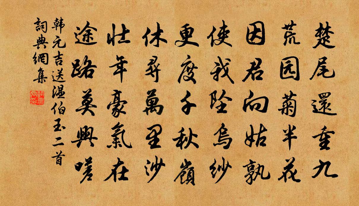 詩詞名句歷史字典書法欣賞書法字典國語詞典說文解字康熙字典古漢語字典標 題 作 者 詩 句 送溫伯玉二首作者:韓元吉 朝代:宋代送溫伯玉二首原文楚尾還重九,荒園菊半花。因君向姑孰,使我墜烏紗。更度千秋嶺,休尋萬里沙。壯年豪氣在,途路莫興嗟。詩詞問答問:送溫伯玉二首的作者是誰?答:韓元吉問:送溫伯玉二首寫於哪個朝代?答:宋代問:韓元吉的名句有哪些?答:韓元吉名句大全韓元吉送溫伯玉二首書法欣賞送溫伯玉二首書法作品詩詞推薦十一月十三日與幾先自竹西來訪慶老不見獨與蘇軾〔宋代〕卷卷長廊走黃葉,席簾垂地香菸歇。主人待來終不來,火紅銷盡灰如雪。無逸用前韻見謝複次韻三首傅察〔宋代〕鵬飛初不礙蒿蓬,自擬歸休慕仲翁。況有仙姿標洞府,泠然禦寇已乘風。挽少師相國李公張元乾〔宋代〕望表公師位,身兼將相權。三朝更出入,一德奉周旋。盍為蒼生起,曾扶大廈顛。何知老賓客,擁篲掃新阡。社日雨黎廷瑞〔宋代〕今社來無涯,古社喚不回。社公亦世情,兒劇良可咍。新水豈不佳,舊雨令人懷。離離芳草生,澹澹桃花開。吾聾點絳唇(富季申生日)李彌遜〔宋代〕花信爭先,暗將春意傳桃李。壽卿同醉。綠野連珠履。麟閣丹青,眷注耆英裔。眉間喜。日邊飛騎。來促東山起。古意呈補闕喬知之沈佺期〔唐代〕盧家少婦鬱金香,海燕雙棲玳瑁梁。九月寒砧催木葉,十年征戍憶遼陽。白狼河北音書斷,丹鳳城南秋夜長。誰為下第出京黃滔〔唐代〕還失禮官求,花時出雍州。一生為遠客,幾處未曾游。故疾江南雨,單衣薊北秋。茫茫數年事,今日淚俱流。和淨因有作王安石〔宋代〕朝紅一片墮窗塵,禪客翛然感此辰。更覺城中芳意少,不如山野早知春。頌古十六首釋道寧〔宋代〕春去復春來,桃花依舊開。東風浩浩曾無間,剛地靈雲道不猜。幽居雜題陸游〔宋代〕獨往成初志,安居謝世紛。名書硬黃紙,古硯熨焦紋。雨作占琴薦,風來散鷺群。豈無朝市事,塞耳未曾聞。聞春雷司空曙〔唐代〕水國春雷早,闐闐若眾車。自憐遷逐者,猶滯蟄藏餘。蓬瀛台韓元吉〔宋代〕雨余天定澹澄瀛,及此秋郊一日晴。軒蓋翩翩度林影,笙簫隱隱雜溪聲。風隨廣席歌呼轉,雲滿高台步武生。記取夏日南軒陳深〔宋代〕羔水軒窗宜夏居,夜涼如水似和初。科頭枕石臥明月,仰面迎風看太虛。延平舟中胡仲弓〔宋代〕雙槳去夷猶,延平津上州。英雄三盡劍,今古一潭秋。市近人爭渡,山回水急流。前頭風浪惡,莫放釣魚舟。偈頌四十一首釋慧暉〔宋代〕殺氣到來黃葉秋,梧桐老冷隨河流。人間天上無分曉,從古至今誰得酬。恁么辯得,尚帶滯留。別得一路,正絕蹤春詞毛滂〔宋代〕截肪初見昭華玉,刀出昆吾寶籀開。天助君王敷大喜,安排春色探先來。紅葉楊萬里〔宋代〕詩人滿腹著清愁,吐作千詩未肯休。寫遍壁間無去處,卻將紅葉強題秋。自嘆張鎡〔宋代〕居士年來更覺痴,竹梢雲過望移時。曉窗倦櫛猶思夢,夜榻忘眠尚改詩。匹馬未能隨李廣,一丘端欲效元規。客談偈頌一百二十三首釋祖欽〔宋代〕去歲元宵節,無油不點燈。今歲元宵節,有月照危層。送居厚弟二首劉克莊〔宋代〕昨日傳修覲,明朝說祝厘。予歸寧悻悻,子去亦遲遲。已草引年疏,重吟聽雨詩。如何無一字,端的報來期。名句推薦總是愁媒,欲訴誰消遣蘇軾《蝶戀花·蝶懶鶯慵春過半》 白日來深殿,青雲滿後塵杜甫《寄李十二白二十韻》 虎踞龍蟠何處是,只有興亡滿目。辛棄疾《念奴嬌·登建康賞心亭呈史致道留守》 巧笑東鄰女伴,採桑徑里逢迎。晏殊《破陣子·春景》 竹竿有甘苦,我愛抱苦節。孟郊《苦寒吟》 綠萼添妝融寶炬,縞仙扶醉跨殘虹曹雪芹《詠紅梅花得“紅”字》 合意客來心不厭,知音人聽話偏長。馮夢龍《警世通言·卷一》 葉落當歸根,雲沉久必起。錢嶫《憫黎詠》 心事孤山春夢在,到思量、猶斷詩魂吳文英《極相思·題陳藏一水月梅扇》 攜扙來追柳外涼,畫橋南畔倚胡床。秦觀《納涼》