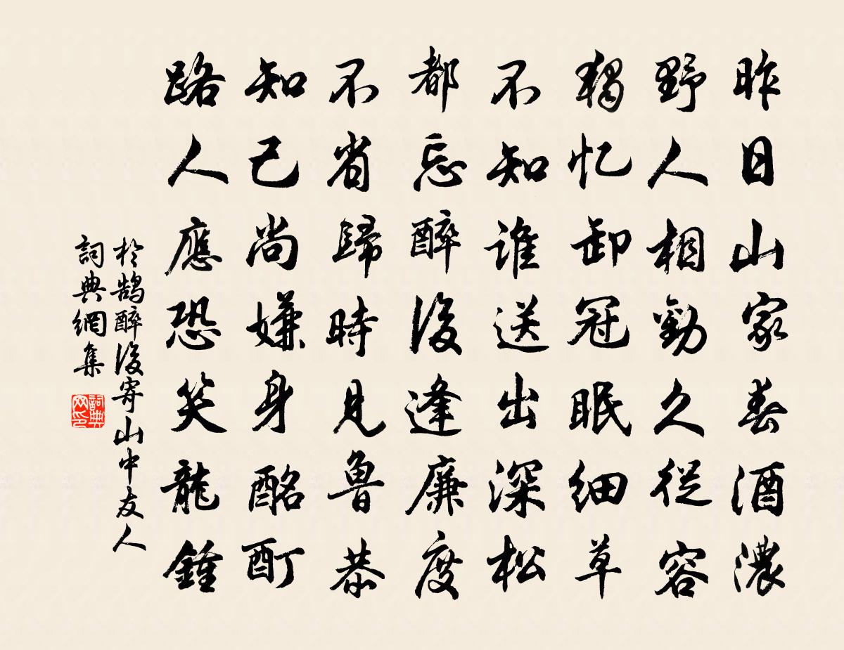 詩詞名句歷史字典書法欣賞書法字典國語詞典說文解字康熙字典古漢語字典標 題 作 者 詩 句 醉後寄山中友人作者:於鵠 朝代:唐代醉後寄山中友人原文昨日山家春酒濃,野人相勸久從容。獨憶卸冠眠細草,不知誰送出深松。都忘醉後逢廉度,不省歸時見魯恭。知己尚嫌身酩酊,路人應恐笑龍鍾。詩詞問答問:醉後寄山中友人的作者是誰?答:於鵠問:醉後寄山中友人寫於哪個朝代?答:唐代問:醉後寄山中友人是什麼體裁?答:七古於鵠醉後寄山中友人書法欣賞醉後寄山中友人書法作品注釋全唐詩:卷310-34詩詞推薦七月附米舟之浙中作陳造〔宋代〕白蟲散如蛆,黑蟲聚如蟻。循緣仍咂齧,欲寐復九起。吾舟玉為粒,生此果何理。神奇作臭腐,秋暑況如燬。人生謁金門佚名〔宋代〕歸未卜。頻倒金驅纖玉。明月綃窗停剪燭。搦愁題蠹綠。秋水娟娟魚目。腰素幾分銷縮。接得雲箋無意讀。雕鞍何思越人·紫府東風放夜時賀鑄〔宋代〕紫府東風放夜時。步蓮穠李伴人歸。五更鐘動笙歌散,十里月明燈火稀。香苒苒,夢依依。天涯寒盡減春衣。鳳凰春暮思平泉雜詠二十首鸂鶒李德裕〔唐代〕清沚雙鸂鶒,前年海上雛。今來戀洲嶼,思若在江湖。欲起搖荷蓋,閒飛濺水珠。不能常泛泛,惟作逐波鳧。漢宮春(蠟梅)張先〔宋代〕紅粉苔牆。透新春訊息,梅粉先芳。奇葩異卉,漢家宮額塗黃。何人鬥巧,運紫檀、翦出蜂房。應為是、中央正色偈傾一百三十三首釋法薰〔宋代〕一日日,一時時,口如鼻,眼似眉。左搓芒繩縛鬼子,倒將蒿箭射須彌。狼三則蒲松齡〔清代〕其一 有屠人貨肉歸,日已暮,欻一狼來,瞰擔上肉,似甚垂涎,隨尾行數里。屠懼,示之以刃,少卻;及走,宮詞張公庠〔宋代〕晨光初動閣門開,百辟匆匆避路回。千步畫廊敲杖子,朱衣雙引相公來。夢遊山水奇麗處有古宮觀云云台觀也陸游〔宋代〕神遊忽到雲台宮,太華彩翠明秋空。曲廊下闞白蓮沼,小閣正對青蘿峰。林間突兀見古碣,雲外縹緲聞疏鍾。褐衣虎丁謂〔宋代〕雄文彰炳變,麟史載於菟。莫負編須勇,須懷履尾虞。恥將豺共棄,忍與兕為徒。嘯谷非威怒,風從懾萬夫。默坐鄧深〔宋代〕默坐形如槁,清閒智養恬。飛蟲黏密網,斗雀墮虛檐。卻暑寧須扇,留香略下簾。無人撓清思,至夜待明蟾。種蘭陳陶〔唐代〕種蘭幽谷底,四遠聞馨香。春風長養深,枝葉趁人長。智水潤其根,仁鋤護其芳。蒿藜不生地,惡鳥弓已藏。椒桂陳{左糹右聿}男求厥父輓詩二首蘇籀〔宋代〕閫室良規範,萱堂子職修。儀形儼惇碩,積習肖風流。疇曩鄉鄰援,悽涼川逝愁。太丘純豈弟,慈愛理能周。以孟夏唱酬陳子高詩寄季承並借窮愁志及其兄趙蕃〔宋代〕東湖共款竹多竿,妙果同登塔幾盤。沖雨衝風總幽事,一談一笑盡詩端。隨人似我空為計,出語如君當不刊。派後念奴嬌(酬王城山)劉辰翁〔宋代〕兩丸日月,細看來、也是樊籠中物。點點山河經過了,拔幟幾番殘壁。白是沙堤,蒼然吳楚,一片成氈雪。此時把賦向伯共五老小山六言五絕胡寅〔宋代〕文簡風流未泯,公孫節氣誰班。當與皋夔佐舜,莫尋黃綺商山。好事近·簾外五更風納蘭性德〔清代〕簾外五更風,消受曉寒時節。剛剩秋衾一半,擁透簾殘月。爭教清淚不成冰?好處便輕別。擬把傷離情緒,待曉寒小山叢桂曾協〔宋代〕暗綠團團樹,浮蒼淺淺山。不須吟些些,幽韻已班班。句王曙〔宋代〕千山送客東西路,一樹照人南北枝。寄六湖陳如晦趙汝騰〔宋代〕琴劍前時為我來,志同道合味悠哉。每憐一水馬頭險,惜放斯人鷁首回。魯語手箋應畢卷,汾亭指授想多材。不知名句推薦和氏之璧,不飾以五采;隋侯之珠,不飾以銀黃。其質至美,物不足以飾之。韓非及後人《韓非子·解老》 泰山嵯峨夏雲在,疑是白波漲東海。李白《早秋單父南樓酬竇公衡》 微陽下喬木,遠色隱秋山。馬戴《落日悵望》 余亦赴京國,何當獻凱還。孟浩然《送陳七赴西軍》 心似雙絲網,中有千千結。張先《千秋歲·數聲鶗鴂》 心無備慮,不可以應卒。墨子《墨子·05章 七患》 雨洗娟娟淨,風吹細細香。杜甫《嚴鄭公宅同詠竹》 仁暴者,皆亡國者也。韓非及後人《韓非子·八說》 竹徑通幽處,禪房花木深。常建《題破山寺後禪院》 斜髻嬌娥夜臥遲,梨花風靜鳥栖枝。唐寅《美人對月》