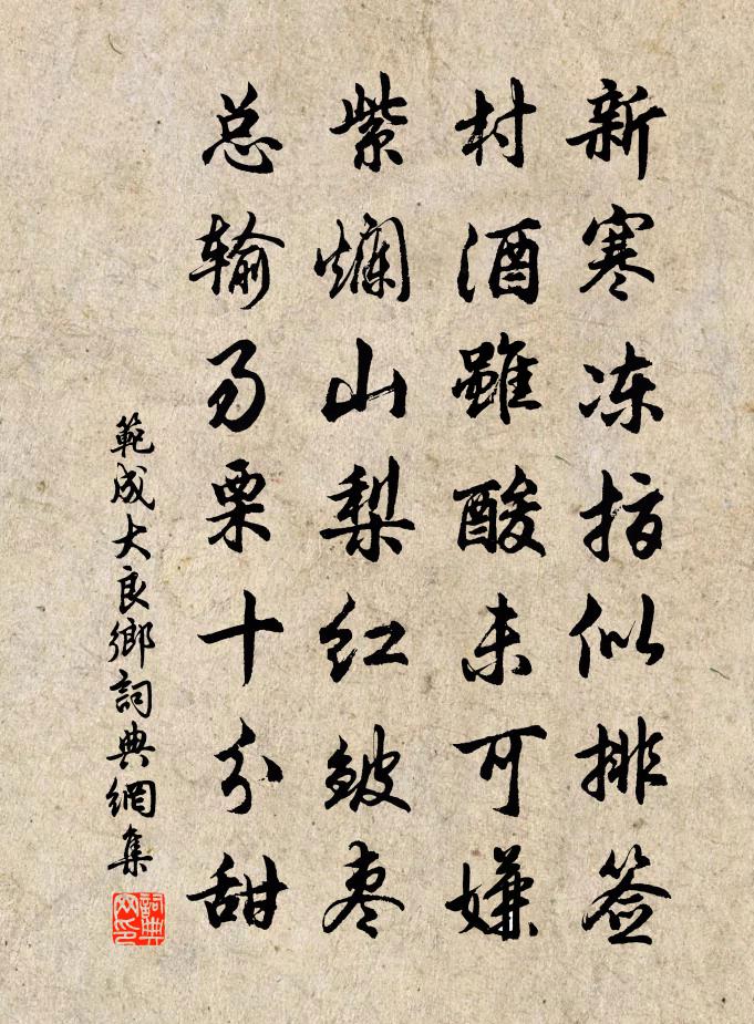詩詞名句歷史字典書法欣賞書法字典國語詞典說文解字康熙字典古漢語字典標 題 作 者 詩 句 良鄉作者:范成大 朝代:宋代良鄉原文新寒凍指似排簽,村酒雖酸未可嫌。紫爛山梨紅皺棗,總輸易栗十分甜。詩詞問答問:良鄉的作者是誰?答:范成大問:良鄉寫於哪個朝代?答:宋代問:范成大的名句有哪些?答:范成大名句大全范成大良鄉書法欣賞良鄉書法作品詩詞推薦步月鄧剡〔宋代〕皓月流華光,微霄曖虛碧。空庭四無人,及此美□夕。霏微弄香霧,淡盪舒玉色。離離花影斜,梢梢蘭露滴。頹然游虎邱余伯皋〔宋代〕才出閶門望虎邱,馬行沖雨上扁舟。綠楊碧草沿溪岸,白水青苗滿稻疇。雲霧黯然方潤溽,山林蕞爾自清幽。吳王少年游(黃鐘)周邦彥〔宋代〕南都石黛掃晴山。衣薄耐朝寒。一夕東風,海棠花謝,樓上捲簾看。而今麗日明如洗,南陌暖雕鞍。舊賞園林,喜亮禪人持缽求頌釋正覺〔宋代〕家林一錫飛,炊處青煙微。嚴默起禪板,虛通轉化機。溪寒秋染色,月冷夜流輝。莫學西山亮,此行宜早歸。剔銀燈(仙呂調)柳永〔宋代〕何事春工用意。繡畫出、萬紅千翠。艷杏夭桃,垂楊芳草,各斗雨膏煙膩。如斯佳致。早晚是、讀書天氣。漸漸園偈十三首釋慧空〔宋代〕雪峰禪,無星子,只見升堂打鼓。賺得大眾上來,近日山中有虎。長至令晨,顛言倒語。見劉後村先生吳龍翰〔宋代〕天錄臞仙后代孫,巍科幾世屬名門。千年絕學追先聖,四海真儒仰後村。直向天邊扶日月,只從筆底轉乾坤。年來七月二十四日以久不雨出禱磻溪是日宿虢縣二蘇軾〔宋代〕所建也夜久不寐見壁有前縣令趙薦留名有懷其人龕燈明滅欲三更,欹枕無人夢自驚。深谷留風終夜響,亂山銜月半畫堂春郝子直〔宋代〕華堂當日誕今辰。慶門人降西真。一杯千歲祝遐齡。莫厭頻斟。不願頭白還黑,不願齒落重生。但容艷只如今。壽將游太平宮小詩呈趙季茂岳珂〔宋代〕聖治峰前松檜寒,舊遊從此解歸鞍。著身泉石無心客,主掌雲山正額官。老去隱居居紫府,新來雜壓壓黃冠。門東和胡戢七首晁補之〔宋代〕千首清詩競夜長,真成蝴蝶為春忙。莫教流落人間少,雷電它時下取將。丁未除夕前二日休假感懷陸游〔宋代〕掛冠神武莫躊躇,家具何妨載鹿車。怨謗相乘真市虎,技能已盡似黔驢。黃金散後猶耽酒,白髮生來更愛書。新歲前調(為丁明仲紀夢)楊冠卿〔宋代〕歸夢迢迢。分明曾見,舞遍雲韶。解道相思,愁寬金釧,瘦損宮腰。覺來情緒無聊。正戍角、聲翻麗譙。楚塞山長立春日晨起對積雪張九齡〔唐代〕忽對林亭雪,瑤華處處開。今年迎氣始,昨夜伴春回。玉潤窗前竹,花繁院裡梅。東郊齋祭所,應見五神來。水龍吟·甲辰歲壽韓南辛棄疾〔宋代〕渡江天馬南來,幾人真是經綸手。長安父老,新亭風景,可憐依舊。夷甫諸人,神州沉陸,幾曾回首。算平戎萬里病中王銍〔宋代〕久知身是幻,況復病相侵。古寺松篁瘦,山空雨雪深。定知書不達,豈有客相尋。伴我殘燈火,應知夜夜心。山頭鹿陸游〔宋代〕呦呦山頭鹿,毛角自媚好,渴飲澗底泉,飢齧林間草。漢家方和親,將軍灞陵老。天寒弓力勁,木落霜氣早。短衣壬辰寒食王安石〔宋代〕客思似楊柳,春風千萬條。更傾寒食淚,欲漲冶城潮。巾發雪爭出,鏡顏朱早雕。未知軒冕樂,但欲老漁樵。華亭吳江道中偶作十絕朱長文〔唐代〕白日歸來皆有意,平生事了最為難。可鄰萬頃煙波色,只屬天隨醉眼看。記二首兒四日雷二異高斯得〔宋代〕鹹淳七年正二月,天災人異何稠疊。細推厥咎端有繇,孤臣未言先泣血。日當丙子月當寅,湖州崑山有妖孽。曹家名句推薦戍客望邊邑,思歸多苦顏。李白《關山月》 翠輦不來金殿閉,宮鶯銜出上陽花雍陶《天津橋望春》 古人今人若流水,共看明月皆如此。李白《把酒問月·故人賈淳令予問之》 紫菊宜新壽,丹萸辟舊邪。趙彥昭《奉和九日幸臨渭亭登高應制》 綠竹半含籜,新梢才出牆。杜甫《嚴鄭公宅同詠竹》 津橋春水浸紅霞,煙柳風絲拂岸斜。雍陶《天津橋望春》 江山如有待,花柳自無私。杜甫《後游》 風力雖尚勁,然徒步則汗出浹背。袁宏道《滿井遊記》 柳葉隨歌皺,梨花與淚傾。黃庭堅《南歌子·槐綠低窗暗》 日下壁而沉彩,月上軒而飛光。江淹《別賦》