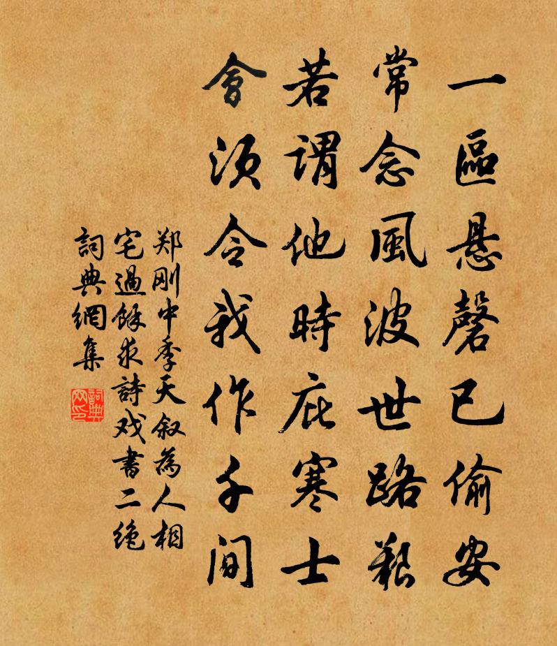 詩詞名句歷史字典書法欣賞書法字典國語詞典說文解字康熙字典古漢語字典標 題 作 者 詩 句 季天敘為人相宅過余求詩戲書二絕作者:鄭剛中 朝代:宋代原文一區懸磬已偷安,常念風波世路艱。若謂他時庇寒士,會須令我作千間。詩詞問答問:《季天敘為人相宅過余求詩戲書二絕》的作者是誰?答:鄭剛中問:該詩寫於哪個朝代?答:宋代書法欣賞季天敘為人相宅過余求詩戲書二絕書法作品詩詞推薦無為軍林逋〔宋代〕掩映軍城隔水鄉,人煙景物共蒼蒼。酒家樓閣搖風旆,茶客舟船簇雨檣。殘笛遠砧聞野墅,老苔寒檜看僧房。狎鷗次韻和集賢李學士寒食即事之什楊億〔宋代〕九逵初旭滿輜軿,寒食東風二月天。陌上墊巾誰傲睨,江邊解佩自嬋娟。新粧幾處登牆見,深醉何人籍草眠。豪俠西齋小松二首元稹〔唐代〕松樹短於我,清風亦已多。況乃枝上雪,動搖微月波。幽姿得閒地,詎感歲蹉跎。但恐廈終構,藉君當奈何。簇簇頌古二十一首釋心月〔宋代〕兄難兄,弟難弟。馬祖真,只這是。燭影搖紅·賦德清縣圃古紅梅吳文英〔宋代〕莓鎖虹梁,稽山祠下當時見。橫斜無分照溪光,珠網空凝遍。姑射青春對面。駕飛虬、羅浮路遠。千年春在,新月菩薩蠻佚名〔宋代〕柳橋花塢南城陌。朱顏綠髮長安客。雨後小池台。尋常載酒來。馬頭今日路。卻望城西去。斜日下汀洲。斷雲和淚朝中措陳亮〔宋代〕蓼花風淡水雲纖。倚閣卷重簾。索寞敗荷翠減,蕭疏晚□紅添。魂銷天末,眉橫遠岫,斜掛新蟾。誰信故人千里,約結晁說之〔宋代〕約結無奇恨眼開,偷閒黎杖亦悠哉。曉風不讓青山遠,暮靄難禁明月來。關外關中渾浪漫,雲南雲北舊徘徊。自憐奉和隨王殿下詩 六謝朓〔南北朝〕念深沖照廣。業闡清化玄。端儀穆金殿。敷教藻瓊莚。船湛輕帷藹。磬轉芳風旋。卷轡棲道樹。方津棹法舷。歸興次韻伯庸待制上京寓直書事因以為寄柳貫〔元代〕舉頭涼影動明河,問訊仙人八月槎。斗下孤光懸太白,雲間長御挾纖阿。《霓裳》催按新聲遍,鳳詔需承曲宴多。秋日登岳陽樓晴望張碧〔唐代〕三秋倚練飛金盞,洞庭波定平如剗。天高雲卷綠羅低,一點君山礙人眼。漫漫萬頃鋪琉璃,煙波闊遠無鳥飛。西南和吳秀才二絕王炎〔宋代〕世人相馬苦嫌瘦,誰識龍媒氣逸群。歸傍青燈對賢聖,漢庭射策待方聞。仆持節朔庭自燕山向北部落以三分為率南人居曹勛〔宋代〕聞道南使歸,路從城中去。豈如車上瓶,猶掛歸去路。引首恐過盡,馬疾忽無處。吞聲送百感,南望淚如雨。送黃任道歌王令〔宋代〕吾門之達兮,爾可款以入兮。進之不時兮,吾豈不爾待兮。何後未至兮,前已過之。來猶有望兮,去何勝追。俯吾梅花張問陶〔清代〕野鶴閒雲寄此生,暗香真到十分清。轉憐桃李無顏色,獨抱冰霜有性情。贈我詩難應束手,笑他人俗也知名。開遲金陵陳月觀同年三首黎廷瑞〔宋代〕深衣社裡強婆娑,悞了東臯雨一蓑。麟也可為宣父泣,鳳兮須信接輿歌。懷金暫樂憂方大,投璧能全碎已多。此去偶成陳某〔宋代〕城南春深草亂飛,門前流水沒漁磯。百年此地踏青客,今歲從軍猶未歸。鶯啼序(壽胡存齊)趙文〔宋代〕初荷一番沃雨,錦雲紅尚卷。隘華屋、賦客吟仙,候望南極天遠。還報導、飄然紫氣,山奇水勝都行偏。卻歸來領挽南康冷知軍孫應時〔宋代〕禮樂三千字,聲名五十秋。士元才展驥,李廣不封侯。香火猶強健,笙歌足燕休。如何早仙去,寒日慘山丘。夜讀夷堅放卷偶成洪咨夔〔宋代〕斂卷驚嗟語幻嚨,搔頭危坐對明缸。梧桐細語秋傳信,絡緯長鳴月上窗。濁酒不多雙耳熱。妙香無盡寸心降。家山名句推薦知而弗為,莫如勿知;親而弗信,莫如勿親。佚名《孔子家語·子路初見》 日照新妝水底明,風飄香袂空中舉。李白《採蓮曲》 孝子之有深愛者,必有和氣;有和氣者,必有愉色;有愉色者,必有婉容。戴聖《禮記·祭義》 鵝湖山下稻粱肥,豚柵雞棲半掩扉。王駕《社日》 投我以木瓜,報之以瓊琚。佚名《木瓜》 古今多少事,都付笑談中。楊慎《臨江仙·滾滾長江東逝水》 雲邊雁斷胡天月,隴上羊歸塞草煙。溫庭筠《蘇武廟》 沙上並禽池上暝。雲破月來花弄影。張先《天仙子·水調數聲持酒聽》 岸雨過城頭,黃鸝上戍樓。岑參《武威春暮聞宇文判官西使還已到晉昌》 醉別江樓橘柚香,江風引雨入舟涼。王昌齡《送魏二》