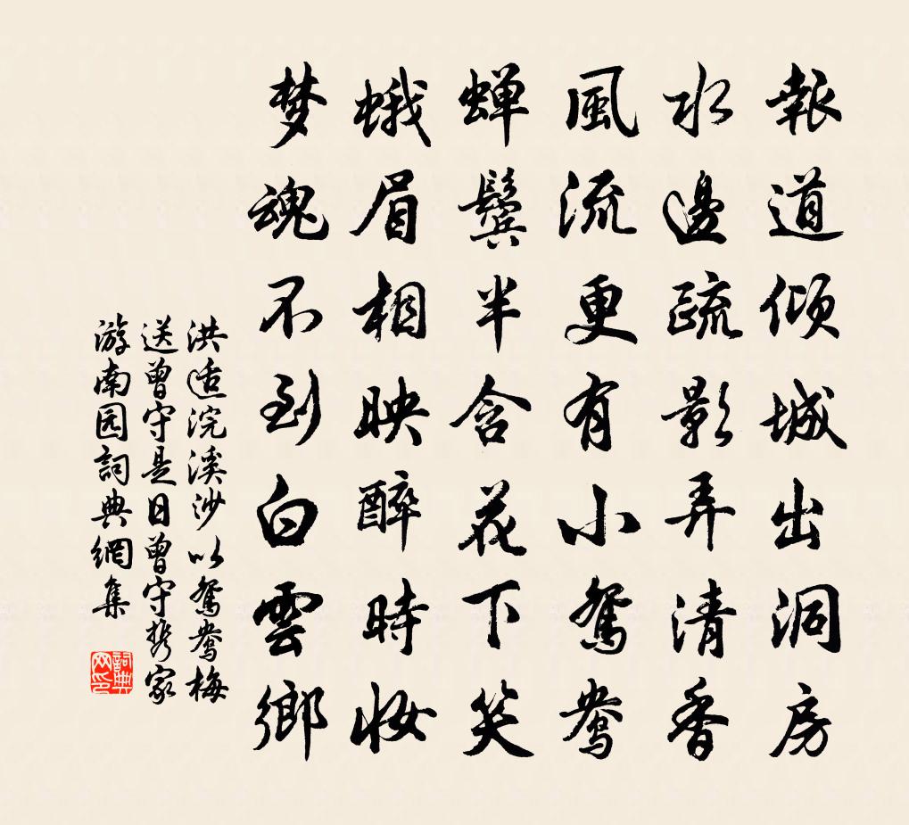 詩詞名句歷史字典書法欣賞書法字典國語詞典說文解字康熙字典古漢語字典標 題 作 者 詩 句 浣溪沙(以鴛鴦梅送曾守,是日,曾守攜家游南園)作者:洪适 朝代:宋代原文報導傾城出洞房。水邊疏影弄清香。風流更有小鴛鴦。蟬鬢半含花下笑,蛾眉相映醉時妝。夢魂不到白雲鄉。詩詞問答問:《浣溪沙(以鴛鴦梅送曾守,是日,曾守攜家游南園)》的作者是誰?答:洪适問:該詩寫於哪個朝代?答:宋代問:該詩是什麼體裁?答:詞書法欣賞浣溪沙(以鴛鴦梅送曾守,是日,曾守攜家游南園)書法作品詩詞推薦次韻夢得見示之什洪邁〔宋代〕居楚求齊音,美惡不同土。諠豗俗物華,鮮復有佳處。時從玉璧人,商略窮萬古。詩如粟牛戲,誤得摩頂許。望道句朱翌〔宋代〕水篆行科斗,林妝囀畫眉。句劉誼〔宋代〕銅柱將軍嗟不見,鐵胎丞相鎮長存。夏夜餞裴行軍赴朝命武元衡〔唐代〕三年同看錦城花,銀燭連宵照綺霞。報國從來先意氣,臨岐不用重咨嗟。和柳子玉官舍十首土榻黃庶〔宋代〕床前一尺二尺泉,床後三枝五枝樹。眠閒圖似在家山,夢魂不使東南去。呈姚顯叔奉親送死極孝戴復古〔宋代〕雁去多年缺寄音,扁舟無復到山陰。臥牛崗上經過少,下馬陵前感慨深。細讀文公千字誄,足知孝子一生心。無才次韻宗郎中師仁見示古風喻良能〔宋代〕平生癖瘀詩,業債餘清淨。但已心孔開,敢夸筆鋒勁。疾書或欹斜,所向必雅正。顧慚非晉人,出語那韻勝。亦好生查子(壽陳宰妻)李漳〔宋代〕家承閥閱高,人擅閨房秀。嫁得伯鸞夫,直是齊眉偶。榴花著子時,萱草宜男候。一笑捧觥船,共祝人常壽。和簡叔孫應時〔宋代〕落日銜山山更青,間雲斂盡綠煙橫。危亭獨倚闌乾遍,又聽疏鍾第一聲。送鄭十學士戩通理越州石延年〔宋代〕宸命陪分竹,仙資貴珥彤。入辭中殿閟,出貳左廉雄。過楚前封近,還吳舊叢空。江山復清思,蓴膾起高風。海闊念古宋庠〔宋代〕賢哉邴曼容,出處知所據。官餘六百石,輒自移疾去。富貴非不懷,殆辱亦先慮。嗟我材下中,叨恩最蕃庶。堯庭較藝將畢和禹玉梅堯臣〔宋代〕窗前高樹有棲鵲,記取明朝飛向東。家布望春門外住,身居華省信難通。夜聞相府催張牓,曉聽都堂議奏中。龍閣即事員興宗〔宋代〕我本不即世,世網以維之。維之意何傷,俯仰百念衰。清真寓天壤,誠盡復誰欺。情忘物自遣,深虞未忘時。平生詠毀天樞李休烈〔唐代〕天門街上倒天樞,火急先須卸火珠。計合一條麻線挽,何勞兩縣索人夫。奉和幸安樂公主山莊應制馬懷素〔唐代〕主家台沼勝平陽,帝幸歡娛樂未央。掩映雕窗交極浦,參差繡戶繞回塘。泉聲百處傳歌曲,樹影千重對舞行。聖酒又得雲字(一作張繼詩,題作留別)皇甫冉〔唐代〕何事千年遇聖君,坐令雙鬢老如雲。南行更入深山淺,岐路悠悠水自分。和尤伯華廣德使君怡亭對雨劉宰〔宋代〕之子胸中不外營,軒亭水到自渠成。詞章妙處窺騷雅,師友平生祗弟兄。元凱一門兼眾美,夷齊千古擅雙清。新詩池蓮四詠分韻葉劉子翬〔宋代〕郁烈香浮雨,團欒綠蔭波,近堤千葉亂,知有畫船過。展上公曾極〔宋代〕浩劫循環無始終,年年玉李杲春空。初成未占茲山頂,古老唯傳展上公。奉酬楊少監見寄退居遣興之什李建中〔宋代〕賢哲道相扶,經綸本近侍。風雲如有會,霄漢寧無志。月窟桂抱林,粉闈丹漆地。一何華組束,而謂浮名遂。堆積名句推薦佳人重勸千長壽。柏葉椒花芬翠袖。毛滂《玉樓春·己卯歲元日》 落日胡塵未斷,西風塞馬空肥。辛棄疾《木蘭花慢·席上送張仲固帥興元》 因可勢,求易道。韓非及後人《韓非子·觀行》 九日明朝酒香,一年好景橙黃。張可久《滿庭芳·客中九日》 文章憎命達,魑魅喜人過。杜甫《天末懷李白》 幸遇三杯酒好,況逢一朵花新。朱敦儒《西江月·世事短如春夢》 紫萸一枝傳賜,夢誰到、漢家陵。姚雲文《紫萸香慢·近重陽》 是無貓邪,是不會蓄貓也。樂鈞《世無良貓》 凡兵有四機:一曰氣機,二曰地機,三曰事機,四曰力機。吳起《吳子·論將》 一年之計在於春,一日之計在於寅。佚名《增廣賢文·上集》