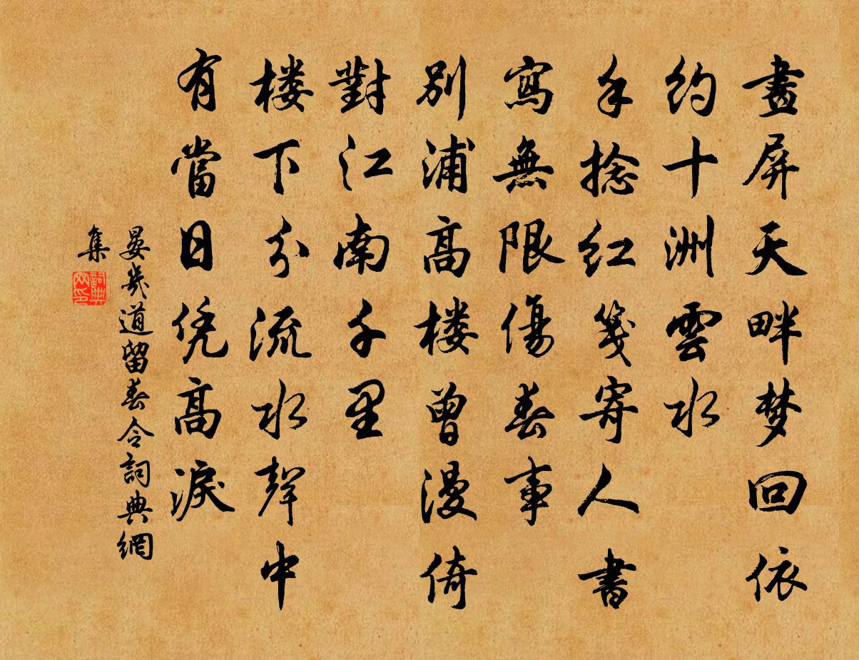 畫屏天畔,夢回依約,十洲雲水。手捻紅箋寄人書,寫無限、傷春事。