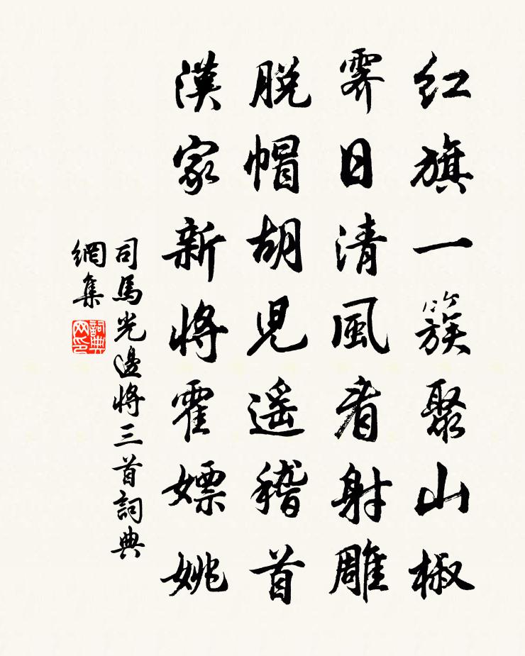 詩詞名句歷史字典書法欣賞書法字典國語詞典說文解字康熙字典古漢語字典標 題 作 者 詩 句 邊將三首作者:司馬光 朝代:宋代邊將三首原文紅旗一簇聚山椒,霽日清風看射鵰。脫帽胡兒遙稽首,漢家新將霍嫖姚。詩詞問答問:邊將三首的作者是誰?答:司馬光問:邊將三首寫於哪個朝代?答:宋代問:司馬光的名句有哪些?答:司馬光名句大全司馬光邊將三首書法欣賞邊將三首書法作品詩詞推薦浴罷范成大〔宋代〕西城落日半輪明,浴罷衣裳一倍輕。玉宇風來歸鳥急,火雲銷盡綠雲生。病驄馬羅隱〔唐代〕櫪上病驄蹄褭褭,江邊廢宅路迢迢。自經梅雨長垂耳,乍食菰漿欲折腰。金絡銜頭光未滅,玉花毛色瘦來焦。曾聽譏賈平章佚名〔宋代〕戎馬掀天動地來,襄陽城下哭聲哀。平章束手全無策,卻把科場惱秀才。觀徐復州家書畫七首趙蕃〔宋代〕萬竹陰中屋數間,幾回剝啄叩柴關。忽開短紙霜雪乾,如對照人冰玉顏。武陵觀火詩劉禹錫〔唐代〕楚鄉祝融分,炎火常為虞。是時直突煙,發自晨炊徒。盲風扇其威,白晝曛陽烏。操綆不暇汲,循牆還避逾。怒如尋石瓮寺上方賈島〔唐代〕野寺入時春雪後,崎嶇得到此房前。老僧不出迎朝客,已住上方三十年。龜堂雜題陸游〔宋代〕龜堂端是無能者,妄想元無一事成。最後數年尤可笑,飽餐甘寢送浮生。秋岸杜牧〔唐代〕河岸微退落,柳影微雕疏。船上聽呼稚,堤南趁漉魚。數帆旗去疾,一艇箭回初。曾入相思夢,因憑附遠書。詠龜郭印〔宋代〕泥塗曳尾行,自適幽閒性。不食本無營,畏人長縮頸。緬思風雨秋,污池亂蛙黽。爾亦水中族,胡為獨沈靜。異質題曾氏山園十一詠吟風橋張栻〔宋代〕橋邊風月佳,俯仰有餘思。無忘履冰心,方識吟風意。八陣磧蘇轍〔宋代〕漲江吹八陣,江落陣如故。我來苦寒後,平沙如匹素。乘高望遺蹟,磊磊六十四。遙指如布棋,就視不知處。世稱句釋曉瑩〔宋代〕悠悠落日懸。濠樂趙蕃〔宋代〕韓悲沮洳居,賈嘆尋常瀆。何似老莊周,逍遙一篇足。送介甫行畿縣王令〔宋代〕廄牧三年厭苦頻,況令持斧似行春。民氓墮窳懷寬政,吏士因循倚近親。被水田疇思貨種,經冬鰥寡待周貧。想今題淨眾壺隱釋紹嵩〔宋代〕古院無僧住,含情更惘然。綠苔欺破閣,白鳥沒飛煙。壺隱遲遲日,筒分細細泉。欄乾聊小憑,取次綴詩篇。夏日山居好十首舒岳祥〔宋代〕夏日山居好,茅檐水餅香。蕉衫身儉潔,紗帽頂清涼。潤葉桑藏井,新梢筍過牆。莫言炎熱苦,勝處苦寒鄉。離福嚴黃庭堅〔宋代〕山下三日晴,山上三日雨。不見祝融峰,還泝瀟湘去。江南三台詞四首王建〔唐代〕揚州橋邊少婦,長安城裡商人。二年不得訊息,各自拜鬼求神。青草湖邊草色,飛猿嶺上猿聲。萬里湘江客到,有送曾耆英持胡端殿書謁張袁州四首趙蕃〔宋代〕君知龍門不易陟,頗欲乞書南郡胡。一幅斜行半年得,費君趼足幾工夫。賦意未暢復拾前韻之餘者作廣坐隱辭戴表元〔宋代〕我作坐隱辭,客來問我坐隱方。開門進客還復坐,為客歷落言其詳。隱朝市,我不能沖塵冒暑走遑遑。隱江湖,我名句推薦落日熔金,暮雲合璧,人在何處。李清照《永遇樂·落日熔金》 獨立雕欄,誰憐枉度華年。王沂孫《高陽台·殘萼梅酸》 雲間連下榻,天上接行杯。李白《與夏十二登岳陽樓》 送子軍中飲,家書醉里題。岑參《磧西頭送李判官入京》 何處合成愁。吳文英《唐多令·惜別》 樹樹皆秋色,山山唯落暉。王績《野望》 笑拈芳草不知名,乍凌波、斷橋西堍。吳文英《西子妝慢·湖上清明薄游》 柳花深巷午雞聲,桑葉尖新綠未成。范成大《春日田園雜興》 此心終合雪,去已莫思量。虛中《送遷客》 舊曲梅花唱,新正柏酒傳。孟浩然《歲除夜會樂城張少府宅》