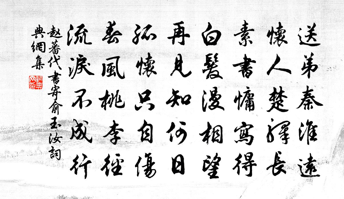 詩詞名句歷史字典書法欣賞書法字典國語詞典說文解字康熙字典古漢語字典標 題 作 者 詩 句 代書寄俞玉汝作者:趙蕃 朝代:宋代代書寄俞玉汝原文送弟秦淮遠,懷人楚驛長。素書慵寫得,白髮漫相望。再見知何日,孤懷只自傷。春風桃李徑,流淚不成行。詩詞問答問:代書寄俞玉汝的作者是誰?答:趙蕃問:代書寄俞玉汝寫於哪個朝代?答:宋代趙蕃代書寄俞玉汝書法欣賞代書寄俞玉汝書法作品詩詞推薦廣陵宴次戲簡幕賓高駢〔唐代〕一曲狂歌酒百分,蛾眉畫出月爭新。將軍醉罷無餘事,亂把花枝折贈人。塞上陸游〔宋代〕塞上今年有事宜,將軍承詔出全師。精金錯落八尺馬,刺繡鮮明五丈旗。上谷飛狐傳號令,蕭關積石列城陴。不應翡翠岩趙嘏〔唐代〕芙蓉幕里千場醉,翡翠岩前半日閒。惆悵晉朝人不到,謝公拋力上東山。臘後楊萬里〔宋代〕待臘驚還過,留年惜欲除。兩才三日有,雪更一冬無。游屐妨緣濘,寒威戀為爐。未須排旅悶,猶足助詩娛。賀新郎(管待楊伯昌子謨勸酒)魏了翁〔宋代〕獨立西風裡。渺無塵、明河掛斗,碧天如洗。鳷鵲樓前迎風處,吹墮乘槎星使。弄札札、機中巧思。織就天孫雲錦望江南楊無咎〔宋代〕鍾陵好,褚襦衤夸聽歡聲。薰入管弦增亮響,喚教羅綺亦光榮。引滿勸金觥。誰信是,元自悟長生。鈴閣才 * 事簡巽老李處權〔宋代〕雨後綠陰無處著,風前黃鳥為誰歌。天為世亂相逢少,子以詩鳴不遇多。行在故人能健否,瘴江逐客奈愁何。典衣試筆釋智圓〔宋代〕城市居無分,山林住有緣。語慚甘似薺,道貴直如弦。兀兀吟終日,羸羸病過年。靜招湖畔鶴,閒泛雪中船。散悶摸魚子馬熙〔元代〕買陂塘旋栽楊柳,參知三島機務。方壺圓嶠千夫力,揮汗已能成雨。鳧立渚。看兩兩胎禽,俯伏紅雲嶼。忘機對語送趙叔靜教授閩中四首陳傅良〔宋代〕烱烱出萬壑,冰壺縣清秋。孰與玉瓚中,穆然養黃流。孤松高半天,蘭芷復過幽。看君最雍容,柰何短自謀。示五峰僧趙師秀〔宋代〕峰形如掌翠相環,頭白山僧引客看。積葉壞來泥徑滑,斜陽移去石橋寒。近聞瀑布尋還遠,易得菖蒲采極難。分我夏侯彥濟武陟尉歐陽修〔宋代〕風煙地接懷,井邑富田垓。河近聞冰坼,山高見雨來。官閒同小隱,酒美足銜杯。好去東籬菊,迎霜正欲開。偈頌七十二首釋祖欽〔宋代〕內紹外紹,有偏有正。失曉老婆逢古鏡。和邢郎中病中重陽強遊樂游原裴夷直〔唐代〕嘉晨令節共陶陶,風景牽情並不勞。曉日整冠蘭室靜,秋原騎馬菊花高。晴光一一呈金剎,詩思浸浸逼水曹。何必使東川漢江上笛元稹〔唐代〕小年為寫游梁賦,最說漢江聞笛愁。今夜聽時在何處,月明西縣驛南樓。春寒·漫脫春衣浣厲鶚〔清代〕漫脫春衣浣酒紅,江南二月最多風。梨花雪後酴醿雪,人在重簾淺夢中。胡夫人輓詩周麟之〔宋代〕舊倚韓康伯,高堂坐累茵。曩先歸厚夜,今又失靈椿。族黨各車會,階庭五鼎陳。季能當大事,無負玉堂人。次沈會宗韻毛滂〔宋代〕故人老蕭散,久客寡諧同。病骨侵山雨,孤帆落渚風。水清應弔影,坐闃想書空。我亦青州闊,經年不一中。夷門行贈秦夷仲晁沖之〔宋代〕君不見夷門客有侯嬴風, * 白晝紅塵中。京兆知名不改捕,倚天長劍著崆峒。同時結交三數公,聯翩走馬幾馬驄緣識宋太宗〔宋代〕津液如泉涌,虛無本不同。源深知冷暖,根盡一時空。名句推薦堂上謀臣尊俎,邊頭將士干戈辛棄疾《西江月其六》 五更鐘動笙歌散,十里月明燈火稀。賀鑄《思越人·紫府東風放夜時》 繁枝容易紛紛落,嫩葉商量細細開。杜甫《江畔獨步尋花七絕句》 春陰垂野草青青,時有幽花一樹明。蘇舜欽《淮中晚泊犢頭》 舉頭西北浮雲,倚天萬里須長劍。辛棄疾《水龍吟·過南劍雙溪樓》 黃塵清水三山下,更變千年如走馬。李賀《夢天》 大人者,不失其赤子之心者也。孟子《孟子·離婁章句下·第十二節》 我當二十不得意,一心愁謝如枯蘭。李賀《開愁歌》 今古河山無定據。納蘭性德《蝶戀花·出塞》 明朝掛帆席,楓葉落紛紛。李白《夜泊牛渚懷古》
