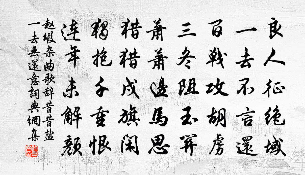 詩詞名句歷史字典書法欣賞書法字典國語詞典說文解字康熙字典古漢語字典標 題 作 者 詩 句 雜曲歌辭。昔昔鹽。一去無還意作者:趙嘏 朝代:唐代原文良人征絕域,一去不言還。百戰攻胡虜,三冬阻玉關。蕭蕭邊馬思,獵獵戍旗閒。獨抱千重恨,連年未解顏。詩詞問答問:《雜曲歌辭。昔昔鹽。一去無還意》的作者是誰?答:趙嘏問:該詩寫於哪個朝代?答:唐代問:趙嘏的名句有哪些?答:趙嘏名句大全書法欣賞雜曲歌辭。昔昔鹽。一去無還意書法作品注釋全唐詩:卷27_21詩詞推薦詠懷古蹟五首·其三杜甫〔唐代〕群山萬壑赴荊門,生長明妃尚有村。一去紫台連朔漠,獨留青冢向黃昏。畫圖省識春風面,環佩空歸夜月魂。(夜金沙亭金君卿〔宋代〕亭闞方池物物新,花中名品富長春。詩僧用意栽培處,四季常教有主人。柳寇準〔宋代〕曉帶輕煙間杏花,晚凝深翠拂平沙。長條別有風流處,密映錢塘蘇小家。讀書台謝諤〔宋代〕莓苔點點路層層,此地分明勝概增。天上樓台山上寺,雲邊鍾喜月邊僧。青松鶴夢生秋吹,實塔星華見夜燈。消盡華蓋樓李思衍〔宋代〕三十六坊如掌平,長橋短艇水從橫。銀河一道江連海,畫障四圍山繞城。老樹煙雲春綠暗,小樓簾幕曉紅明。陰陰寓吳門十首陳造〔宋代〕諸公念我閒無食,粟繼輿台扣戶頻。眼底梅花還索笑,酒腸詩膽已輪囷。少年游(十之十·林鐘商)柳永〔宋代〕佳人巧笑值千金。當日偶情深。幾回飲散,燈殘香暖,好事盡鴛衾。如今萬水千山阻,魂杳杳、信沈沈。孤棹煙波次韻范純父涵星硯月石風林屏詩蘇軾〔宋代〕月次於房歷三星,鬥牛不神箕獨靈。簸搖桑榆盡西靡,影落蘇子硯與屏。天工與我兩厭事,孰居無事為此形。與君送年寓嘆孫嵩〔宋代〕歲事分攜作逕歸,清愁環守有重圍。預供除日先人祭,次拂元朝道士衣。狂似嵇康今盡懶,覺旭蘧瑗昔皆非。新春禪人並化主寫真求贊釋正覺〔宋代〕默默而坐,佛祖勘破。水冷魚潛,天空鳥過。半夜失卻牛,平明拾得火。乍卷乍舒兮,無可不可。對雨杜甫〔唐代〕莽莽天涯雨,江邊獨立時。不愁巴道路,恐濕漢旌旗。雪嶺防秋急,繩橋戰勝遲。西戎甥舅禮,未敢背恩私。朝回遊城南白居易〔唐代〕朝退馬未困,秋初日猶長。回轡城南去,郊野正清涼。水竹夾小徑,縈迴繞川崗。仰看晚山色,俯弄秋泉光。青松春花秋色潘牥〔宋代〕似覺山桃野杏非,恥將濃綠眩群姿。向天乞入秋風隊,蘭菊中間入片時。古風送劉委游試藝南宮楊萬里〔宋代〕西溪先生劉夫子,個是國士天下士。家庭孝友眷里風,義氣高寒秋後水。艮齋薦書叫九關,重華表閭上半天。人冤東流頓令罷官阻風示文有按風伯奏天閽之語答王安石〔宋代〕令尹犀舟失去期,憮然憑几占文移。勸君慎莫讒風伯,會有開帆破浪時。歸時作黃子信〔宋代〕笑倩西風指舊埃,歸時行李似初來。也知三載清貧好,傅得一家強健回。尚憂晁說之〔宋代〕建康庾令豈多愁,未識皇恩覆九州。初訝單于陵大漢,重驚玁狁犯宗周。今朝不見安邊策,前日空多定遠侯。江海富沙道中李彌遜〔宋代〕征衣猶帶去年塵,入眼溪山似故人。社燕秋鴻應共笑,是翁如我往來頻。冥冥寒食雨劉一止〔宋代〕冥冥寒食雨,客意向誰親?泉亂如爭壑,花寒欲傍人。生涯長剌促,老氣尚輪囷。不負年年債,清詩斷送春。夢中作游山絕句陸游〔宋代〕寺樓已斷暮鐘聲,照佛琉璃一點明。不道溪深待船久,老僧驚怪太遲生。名句推薦今日漢宮人,明朝胡地妾。李白《王昭君二首》 黃河西來決崑崙,咆哮萬里觸龍門。李白《公無渡河》 馬作的盧飛快,弓如霹靂弦驚。辛棄疾《破陣子·為陳同甫賦壯詞以寄之》 雲白山青萬餘里,愁看直北是長安杜甫《小寒食舟中作》 晚日寒鴉一片愁。柳塘新綠卻溫柔。辛棄疾《鷓鴣天·晚日寒鴉一片愁》 盡日空濛無所見,雁行斜去字聯聯。韋莊《登鹹陽縣樓望雨》 立身不嫌家世貧賤,但能忠厚老成,所行無一毫苟且處,便為鄉黨仰望之人。王永彬《圍爐夜話·第十七則》 夭夭園桃,無子空長。曹丕《煌煌京洛行》 和氏之璧,不飾以五采;隋侯之珠,不飾以銀黃。其質至美,物不足以飾之。韓非及後人《韓非子·解老》 善之生如春,惡之死如秋,故民勸極力而樂盡情,此之謂上下相得。韓非及後人《韓非子·守道》