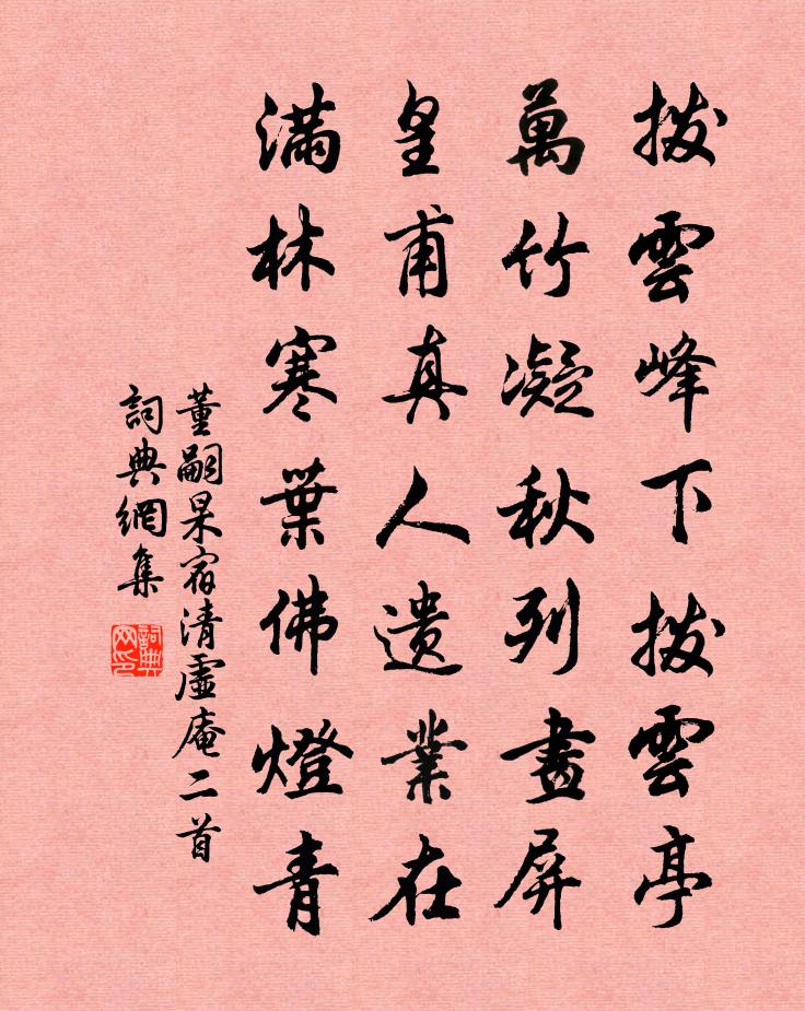 詩詞名句歷史字典書法欣賞書法字典國語詞典說文解字康熙字典古漢語字典標 題 作 者 詩 句 宿清虛庵二首作者:董嗣杲 朝代:宋代宿清虛庵二首原文撥雲峰下撥雲亭,萬竹凝秋列畫屏。皇甫真人遺業在,滿林寒葉佛燈青。詩詞問答問:宿清虛庵二首的作者是誰?答:董嗣杲問:宿清虛庵二首寫於哪個朝代?答:宋代董嗣杲宿清虛庵二首書法欣賞宿清虛庵二首書法作品詩詞推薦懷歸吳可〔宋代〕久客江湖遠,頻年道路艱。干戈侵海內,猿鶴老山間。地僻林泉古,雲深日月閒。餘生猶轉徒,清夢繞柴關。寄李溥杜荀鶴〔唐代〕如我如君者,不妨身晚成。但從時輩笑,自得古人情。共莫更初志,俱期立後名。男兒且如此,何用嘆平生。卜運算元劉克莊〔宋代〕自入玄門戶,寂寂清虛做。靜里披搜四假身,勘破塵行路。悟上還重悟,得得真閒趣。收住身中無價真,豈逐人情再宿武關(一作從秦城回再題武關)李涉〔唐代〕遠別秦城萬里游,亂山高下出商州。關門不鎖寒溪水,一夜潺湲送客愁。賢者之孝二百四十首元子華林同〔宋代〕未必食有毒,人言疑似間。不辭噉母吐,圖得母心寬。胡長文給事輓詞三首范成大〔宋代〕結綬參高妙,垂紳侍邃清。紫荷青瑣闥,玉帳錦官城。行矣超龜列,終然憂驥程。寂寥經濟事,遺恨入銘旌。沖谷過予晏齋趙蕃〔宋代〕夢裡春歸去,榴花晚欲然。窗晴書味熟,竹密鳥聲圓。多病妨搜句,逢人懶問禪。澹然無可語,危坐了爐煙。踏莎行(七月十六日壽胡季海)郭應祥〔宋代〕自昔中元,多生上相。麒麟今又來天上。雲衢雖未掇勛名,月評先已騰聲望。寶鼎濃熏,金翹絕唱。真珠百斛傾家方壺別墅汪楚材〔宋代〕面面軒窗好,溪山不待招。清風修竹徑,細雨綠荷橋。地僻人煙少,天恢景象饒。襟懷無一事,終老樂簞瓢。訪陶公舊宅白居易〔唐代〕垢塵不污玉,靈鳳不啄膻。嗚呼陶靖節,生彼晉宋間。心實有所守,口終不能言。永惟孤竹子,拂衣首陽山。夷齊獨行趙蕃〔宋代〕春風浩浩水橫波,水遠灘長可奈何。送盡碧雲人不見,折蘭采若自行歌。答韓毅伯五首王炎〔宋代〕三書上詩宰,我常疑退之。士窮見素守,躁求亦何為。羅客聞此語,為我一解頤。歲晚歸未得,且過江之西。未到古離別(雜言)吳融〔唐代〕紫鸞黃鵠雖別離,一舉千里何難追。猶聞啼風與叫月,流連斷續令人悲。賦情更有深繾綣,碧甃千尋尚為淺。蟾蜍遺懷杜甫〔唐代〕愁眼看霜露,寒城菊自花。天風隨斷柳,客淚墮清笳。水淨樓陰直,山昏塞日斜。夜來歸鳥盡,啼殺後棲鴉。老馬姚合〔唐代〕臥來扶不起,唯向主人嘶。惆悵東郊道,秋來雨作泥。直學省愁臥詩沈約〔南北朝〕秋風吹廣陌。蕭瑟入南闈。愁人掩軒臥。高窗時動扉。虛館清陰滿。神宇曖微微。網蟲垂戶織。夕鳥傍櫩飛。纓佩程樞密父待制輓詞二首項安世〔宋代〕憶送雙旌帝北門,豈知此別是終身。項亭詩到鮮于錦,羊峴書來暖似春。只有死當封晉魏,不令生得定燕秦。世間題耕織圖二十四首奉懿旨撰趙孟頫〔元代〕當晝耘水田,農夫亦良苦。赤日背欲裂,白汗灑如雨。匍匐行水中,泥淖及腰膂。新苗抽利劍,割膚何痛楚。夫耘減字木蘭花高士談〔元代〕西湖睡起。飛絮遊絲春老矣。漲綠涵空。十頃玻璃四面風。時平事少。天與湖山供坐嘯。他日西州。卻怕羊曇感舊田園作孟浩然〔唐代〕弊廬隔塵喧,惟先養恬素。卜鄰近三徑,植果盈千樹。②粵余任推遷,三十猶未遇。書劍時將晚,丘園日已暮。③名句推薦橋成漢渚星波外,人在鸞歌鳳舞前。晏幾道《鷓鴣天·當日佳期鵲誤傳》 當時輕別意中人,山長水遠知何處。晏殊《踏莎行·碧海無波》 命將征西極,橫行陰山側。李白《塞上曲》 厚者不毀人以自益也,仁者不危人以要名。劉向《戰國策·燕三·燕王喜使栗腹以百金為趙孝成王壽》 日日深杯酒滿,朝朝小圃花開。朱敦儒《西江月·日日深杯酒滿》 風引龍虎旗,歌鐘昔追攀。李白《登邯鄲洪波台置酒觀發兵》 紅旗捲起農奴戟,黑手高懸霸主鞭。 * 《七律·到韶山》 山邊幽谷水邊村,曾被疏花斷客魂。張嵲《墨梅》 寵錫從仙禁,光華出漢京。張九齡《奉和聖制送尚書燕國公赴朔方》 苕之華,其葉青青。佚名《苕之華》