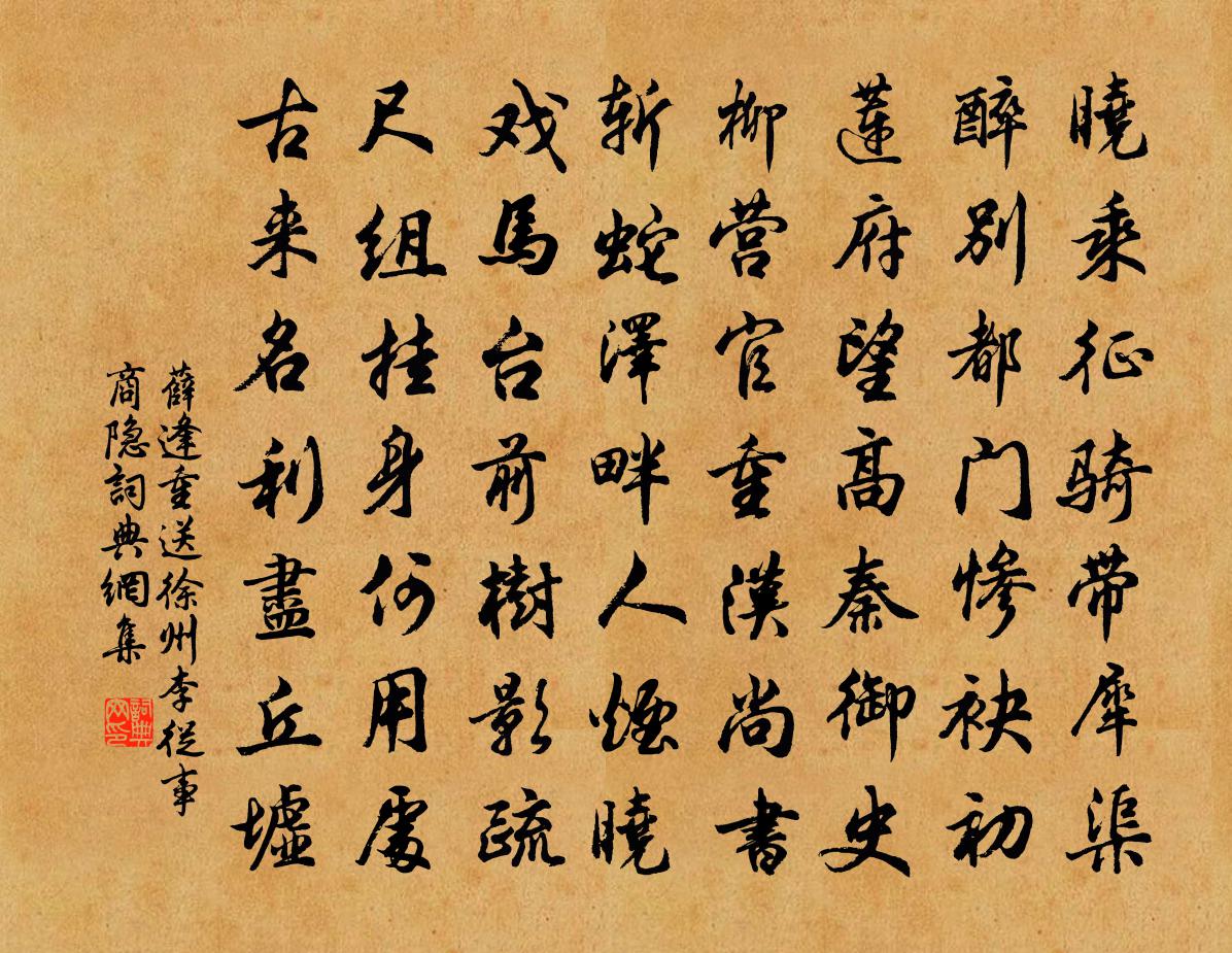 詩詞名句歷史字典書法欣賞書法字典國語詞典說文解字康熙字典古漢語字典標 題 作 者 詩 句 重送徐州李從事商隱作者:薛逢 朝代:唐代重送徐州李從事商隱原文曉乘征騎帶犀渠,醉別都門慘袂初。蓮府望高秦御史,柳營官重漢尚書。斬蛇澤畔人煙曉,戲馬台前樹影疏。尺組掛身何用處,古來名利盡丘墟。詩詞問答問:重送徐州李從事商隱的作者是誰?答:薛逢問:重送徐州李從事商隱寫於哪個朝代?答:唐代薛逢重送徐州李從事商隱書法欣賞重送徐州李從事商隱書法作品注釋全唐詩:卷548-46詩詞推薦南還舟中寄袁太祝孟浩然〔唐代〕沿泝非便習,風波厭苦辛。忽聞遷谷鳥,來報武陵春。嶺北回征棹,巴東問故人。桃源何處是?遊子正迷津!宮詞宋白〔宋代〕玉殿金扉夜不扃,露華如水洗圓靈。昭陽女伴新承寵,心祝君王拜壽星。相和歌辭。銅雀妓吳燭〔唐代〕秋色西陵滿綠蕪,繁弦急管強歡娛。長舒羅袖不成舞,卻向風前承淚珠。寄林石田老友顧逢〔宋代〕西湖惟二老,乍別更傷情。詩與何人說,酒無知己傾。病軀添藥債,夜影對燈檠。喜有僧相訪,門前日送迎。達奚吏部夫人寇氏輓歌李頎〔唐代〕存歿令名傳,青青松柏田。事姑稱孝婦,生子繼先賢。露濕銘旌重,風吹鹵簿前。陰堂從此閉,誰誦女師篇。丙申元日五絕方回〔宋代〕雪余連雨滿城泥,喝道宵行萬馬蹄。昨夜隔年書未點,瓶梅燈畔一枝低。寄題永嘉林氏真意堂洪咨夔〔宋代〕萱草逕庭寂,橘花窗戶明。我惟天地性,物自古今情。玄酒無窮味,朱弦不盡聲。道從涵泳得,寬作讀書程。【仙呂】一半兒 題情關漢卿〔元代〕銀檯燈滅篆煙殘,獨入羅幃淹淚眼。乍孤眠好教人情興懶。薄設設被兒單,一半兒溫和一半兒寒。明月皎夜光佚名〔兩漢〕明月皎夜光,促織鳴東壁。玉衡指孟冬,眾星何歷歷!白露沾野草,時節忽復易。秋蟬鳴樹間,玄鳥逝安適?昔我幕次閒吟王禹偁〔宋代〕江蘺吟盡鬢成霜,謫宦歸來夢一場。每日祗窺丹鳳案,被人猶喚紫微郎。齋宮獨坐風翻幕,客舍閒吟葉滿床。若是重遊寶雨寺李復〔宋代〕題墨暗頹垣,崢嶸歲序遷。舊僧霜發滿,老柏瘦根穿。客少庭多草,村飢供乏錢。重來猶晚暑,清盥挹寒泉。謝江東耿漕曼老寄書並與沈侍郎唱和詩謝詒書楊萬里〔宋代〕碧落侍郎金作句,瀛州學士玉為章。兩公唱和君知麽,個是安期卻老方。為清隱打化僧說偈洪咨夔〔宋代〕雲山幸不求吾是,魚鳥依然笑我頑。自欲入城持缽去,扣門可煞老僧閒。御柳王安石〔宋代〕御柳新黃已迸條,宮溝薄凍未全消。人間今日春多少,只看東方北斗杓。鵲橋仙 舟行辰沅江中,小詞數闋,呈建中御曹伯啟〔元代〕杜鵑聲訴。鷓鴣聲助。催上黔陽歸路。輕舟短棹泛滄浪,沾兩袖、夜郎煙霧。雲山如暮。灘流如怒。石齒嶄然無數野蝶葉紹翁〔宋代〕銀為須翅粉為肌,驅役春風不解肥。桃李上林無分到,可憐卻傍菜花飛。和子瞻過嶺蘇轍〔宋代〕山林瘴霧老難堪,歸去中原荼亦甘。有命誰令終返北,無心自笑欲巢南。蠻音慣習疑傖語,脾病縈纏帶嶺嵐。手挹答崔侍郎、錢舍人書問,因繼以詩白居易〔唐代〕旦暮兩蔬食,日中一閒眠。便是了一日,如此已三年。心不擇時適,足不揀地安。窮通與遠近,一貫無兩端。常見游碧落洞王陶〔宋代〕尋幽碧落外,此境真洞天。乳竇穿碧澗,葆樹蒙塞煙。跡與氛壒絕,身亡名利纏。日暮嫩回首,遲拍洪崖肩。如夢令譚處端〔元代〕清淨無為做徹。高下休生分別。滅盡我人心,自有真師提挈。提挈。提挈。雲綻家家明月。名句推薦記得年時臨上馬,看人眼淚汪汪。劉彤《臨江仙·千里長安名利客》 人悄悄,簾外月朧明。岳飛《小重山·昨夜寒蛩不住鳴》 生怕見花開花落,朝來塞雁先還。辛棄疾《漢宮春·立春日》 事雖小,勿擅為。苟擅為,子道虧。李毓秀《弟子規·入則孝》 好風朧月清明夜,碧砌紅軒刺史家。白居易《清明夜》 清明上巳西湖好,滿目繁華。歐陽修《採桑子·清明上巳西湖好》 長恨去年今夜雨,灑離亭。晏幾道《愁倚闌令·花陰月》 官無常貴而民無終賤。有能則舉之,無能則下之。墨子《墨子·08章 尚賢(上)》 夫君子之行,靜以修身,儉以養德。諸葛亮《誡子書》 長相思,長相思。晏幾道《長相思·長相思》