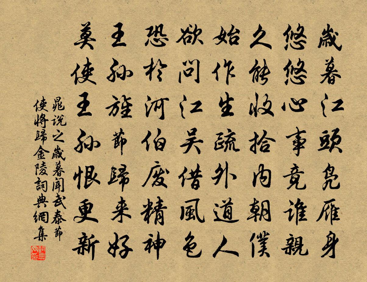 詩詞名句歷史字典書法欣賞書法字典國語詞典說文解字康熙字典古漢語字典標 題 作 者 詩 句 歲暮聞武泰節使將歸金陵作者:晁說之 朝代:宋代歲暮聞武泰節使將歸金陵原文歲暮江頭鳧雁身,悠悠心事竟誰親。久能收拾內朝仆,始作生疏外道人。欲問江吳借風色,恐於河伯廢精神。王孫旌節歸來好,莫使王孫恨更新。詩詞問答問:歲暮聞武泰節使將歸金陵的作者是誰?答:晁說之問:歲暮聞武泰節使將歸金陵寫於哪個朝代?答:宋代晁說之歲暮聞武泰節使將歸金陵書法欣賞歲暮聞武泰節使將歸金陵書法作品詩詞推薦句韋蟾〔唐代〕爭揮鉤弋手,競聳踏搖身。傷頰詎關舞,捧心非效嚬。城西射弓挺之以病不至簡示新詩有唯應欠我渭蔡襄〔宋代〕雪後西郊物外清,官閒乘興此閒行。出門疏樹無塵色,入內流渠帶野聲。近臘酒醪香更釅,得風弓箭力還生。知君雁兒落過得勝令·憶別喬吉〔元代〕殷勤紅葉詩,冷淡黃花市。清江天水箋,白雁雲煙字。遊子去何之?無處寄新詞。酒醒燈昏夜,窗寒夢覺時。尋思十二月十一日視築堤陸游〔宋代〕江水來自蠻夷中,五月六月聲摩空。巨魚穹龜牙須雄,欲取闤市為龍宮。橫堤百丈臥霽虹,始誰築此東平公。今年奉裴中書光庭酒張說〔唐代〕西掖恩華降,南宮命席闌。詎知雞樹後,更接鳳池歡。和登會稽山孫逖〔唐代〕稽山碧湖上,勢入東溟盡。煙景晝清明,九峰爭隱嶙。望中厭朱紱,俗內探玄牝。野老聽鳴騶,山童擁行軫。仙花正紀誕辰輒成三絕句為壽所謂壽者非世俗之壽郭印〔宋代〕歲月推來逢子午,坎離交處互乾坤。休將世 * 修短,超出陰陽道獨尊。和二兄書事三首李廌〔宋代〕述逃內潰古雲多,楚塞群雄尚感歌。血饗彼猖神苟幸,廟謀非壯士誰何。將軍威信當詢眾,決勝神機豈謂他。試把病酒新愈獨臥苹風閣戲書陸游〔宋代〕用酒驅愁如伐國,敵雖摧破吾亦病。狂呼起舞先自困,閉戶垂帷真廟勝。今朝屏事臥湖邊,不但心空兼耳靜。 * 川上懷舊邵雍〔宋代〕地逈川原闊,村孤煙水閒。雷輕龍過浦,雲亂雨移山。田者荷鋤去,漁人背網還。伊予獨霑濕,猶在道途間。正月初八日同莫少虛蒲大受王園泛舟各賦二首郭印〔宋代〕春江晚多思,拂面風稜稜。舟行明鏡中,天水同一澄。滄波濯新柳,喬松上寒藤。風梅雪飄徑,兩麥青平陵。文魴地遠釋文珦〔宋代〕地遠隔凡塵,因而此隱淪。閒知雲意度,清愛水精神。蔬食聊充腹, * 足蔽身。休嫌吾懶拙,懶拙廻吾真。蓮花張繼先〔宋代〕淡淡紅生細細香,半開人折寄山房。只緣清淨超塵垢,頗似風流壓眾芳。接待釋崇岳〔宋代〕茶飯家常沒可陪,臨機元不在安排。門前有客來相訪,試問朝從何處來。絕句漫興九首·其七杜甫〔唐代〕糝徑楊花鋪白氈,點溪荷葉疊青錢。筍根稚子無人見,沙上鳧雛傍母眠。酬盧十一過宿皇甫冉〔唐代〕乞還方未遂,日夕望雲林。況復逢春草,何勞問此心。閉門公務散,枉策故情深。遙夜他鄉酒,同君梁甫吟。再和楊萬里〔宋代〕太空無壁不可幄,顛風莫動花肌薄。一春才有一日晴,帝里遊人爭出城。青天如水綠煙滅,晴與海棠成兩絕。坐中次韻楊廷秀郎中游西湖十絕喻良能〔宋代〕湖邊幽勝滿青蓮,到處時時泊畫船。竟日漣漪吟不足,欲歸重看水中天。虛白堂前牡丹相傳雲太傅手植在錢塘羅隱〔唐代〕欲詢往事奈無言,六十年來托此根。香暖幾飄袁虎扇,格高長對孔融樽。曾憂世亂陰難合,且喜春殘色上存。莫背游鐘山蘇轍〔宋代〕江南四月如三伏,北望鐘山萬松碧。杖藜試上寶公龕,眾壑秋聲起相襲。青峰迴抱石城小,白練前橫大江直。石梯名句推薦長者立,幼勿坐。長者坐,命乃坐。李毓秀《弟子規·出則弟》 心病終須心藥治,解鈴還是系鈴人。曹雪芹《紅樓夢·第九十回》 屋漏在上,知者在下。王充《論衡·卷十一·答佞篇》 曉鏡但愁雲鬢改,夜吟應覺月光寒。李商隱《無題·相見時難別亦難》 但將千歲葉,常奉萬年杯。趙彥昭《奉和元日賜群臣柏葉應制》 江深竹靜兩三家,多事紅花映白花。杜甫《江畔獨步尋花七絕句》 古之君子,使人必報之。魏徵《隋書·志·卷二》 催成清淚,驚殘孤夢,又揀深枝飛去。陸游《鵲橋仙·夜聞杜鵑》 夜中不能寐,起坐彈鳴琴。阮籍《詠懷八十二首·其一》 風嗥雨嘯,昏見晨趨。鮑照《蕪城賦》
