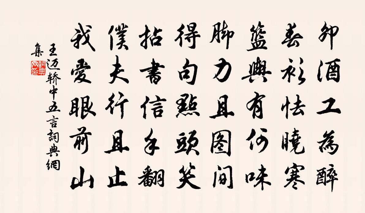 詩詞名句歷史字典書法欣賞書法字典國語詞典說文解字康熙字典古漢語字典標 題 作 者 詩 句 轎中五言作者:王邁 朝代:宋代轎中五言原文卯酒工為醉,春衫怯曉寒。籃輿有何味,腳力且圖間。得句點頭笑,拈書信手翻。僕夫行且止,我愛眼前山。詩詞問答問:轎中五言的作者是誰?答:王邁問:轎中五言寫於哪個朝代?答:宋代王邁轎中五言書法欣賞轎中五言書法作品詩詞推薦秋朝木芙蓉趙彥昭〔唐代〕水面芙蓉秋已衰,繁條偏是著花遲。平明露滴垂紅臉,似有朝愁暮落時。紫薇花陶弼〔宋代〕人言清禁紫薇郎,草詔紫薇花影旁。山木不知官況別,也隨紅白上東廊。初至封丘作高適〔唐代〕可憐薄暮宦遊子,獨臥虛齋思無已。去家百里不得歸,到官數日秋風起。西江月(西園雪後)曹勛〔宋代〕連夜六花飛舞,清晨玉境瑤階。湖山寒霧隱樓台。難畫西園真態。月殿九華同到,雕輿乘興俱來。浮春簾密錦筵開答晁以道陳師道〔宋代〕轉走東南復帝城,故人相見眼偏明。十年作吏仍餬口,兩地為鄰闕寄聲。冷眼尚堪看細字,白頭寧復要時名。孰知送石深之歸沃洲謝耘〔宋代〕嬾踏紅塵地,結廬岩壑間。酒催清夜別,身伴白雲還。賀老湖邊月,支公屋外山。沃洲吟不盡,天與老翁閒。和尉衙落成贈阮梅仙何夢桂〔宋代〕梅仙貴介出侯門,庭砌猶傳有紫荊。黃綬銅章官小試,青溪花縣室初成。公衙好作三年計,少府香留百代名。田野挽龔用和文天祥〔宋代〕結屋南陵三十秋,田園舊隱隔江流。鄜州避亂杜工部,下澤乘車馬少游。名利無心付隍鹿,詩書有種出煙樓。長淮次韻侄過江漲蘇轍〔宋代〕陰淫夏為秋,雨暴溪作瀆。缺防舊通市,流潦幾入屋。雖幸廩粟空,猶惜畦蔬綠。鹿駭不擇音,鴻羈分遵陸。室誚九日送客趙時煥〔宋代〕頻來因送客,攜酒訪仙靈。歸去成何事,重來愧此亭。天寬野水白,松潤石崖青。倚杖思今古,寒鷗落遠汀。對月憶嵩陽故人施肩吾〔唐代〕團團月光照西壁,嵩陽故人千里隔。不知三十六峰前,定為何處峰前客。有感陳宗遠〔宋代〕呢喃燕賀廈,嘹嚦鴻漸磐。戀主江南暖,來賓塞北寒。炎涼有變易,去就無留難。勿嫌烏鵲噪,朝朝止屋端。偈頌五十一首釋大觀〔宋代〕礙塞處,有通疏。看不足,綽有餘。千古華山山下路,輸他潘閬倒騎驢。早春有感鄭剛中〔宋代〕帶煙構外陰晴好,趁暖花苞日夜肥。有宅一區園十畝,不知天遣幾時歸。醜奴兒張孝祥〔宋代〕珠燈璧月年時節,縴手同攜。今夕誰知。自捻梅花勸一卮。逢人問道歸來也,日日佳期。管有來時。趁得收燈也未塞上行曹松〔唐代〕上將擁黃須,安西逐指呼。離鄉俱少壯,到磧減肌膚。風雪夜防塞,腥膻朝系胡。為君樂戰死,誰喜作征夫。偈頌八十五首釋妙倫〔宋代〕躘踵幾隻牯牛,總在瑞峰過夏。有心臥月眠雲,無意牽犁拽耙。溪東溪西,嶺上嶺下。飲水自飲水,吃草自吃草,感懷五首陶夢桂〔宋代〕憶昔身章兩度新,庭闈恨不拜雙親。雖然累贈光泉壤,還是酬恩未了人。記小圃花果二十首劉克莊〔宋代〕苦愛堂廚美,貛郎喜覆羹。飽食林下筍,輸與邵先生。次韻別友方岳〔宋代〕硯香不肯與山留,雨浥寒花斷送秋。後夜酒醒詩更好,淡煙荒草並漁舟。名句推薦鏡水夜來秋月,如雪。溫庭筠《荷葉杯·鏡水夜來秋月》 得道者多助,失道者寡助。孟子《孟子·公孫丑章句下·第一節》 使君宏放,談笑洗盡古今愁。陸游《水調歌頭·多景樓》 主貴多變,國貴少變。國多物,削;主少物,強。商鞅《商君書·去強》 野竹交淇水,秋瓜蔓帝邱。司馬光《送雲卿知衛州》 長江千里,煙淡水雲闊。李綱《六么令·次韻和賀方回金陵懷古鄱陽席上作》 兒童散學歸來早,忙趁東風放紙鳶。高鼎《村居》 少事長,賤事貴,不肖事賢,是天下之通義也。荀子《荀子·仲尼》 常恐秋風早,飄零君不知。盧照鄰《曲池荷》 自古逢秋悲寂寥,我言秋日勝春朝。劉禹錫《秋詞》