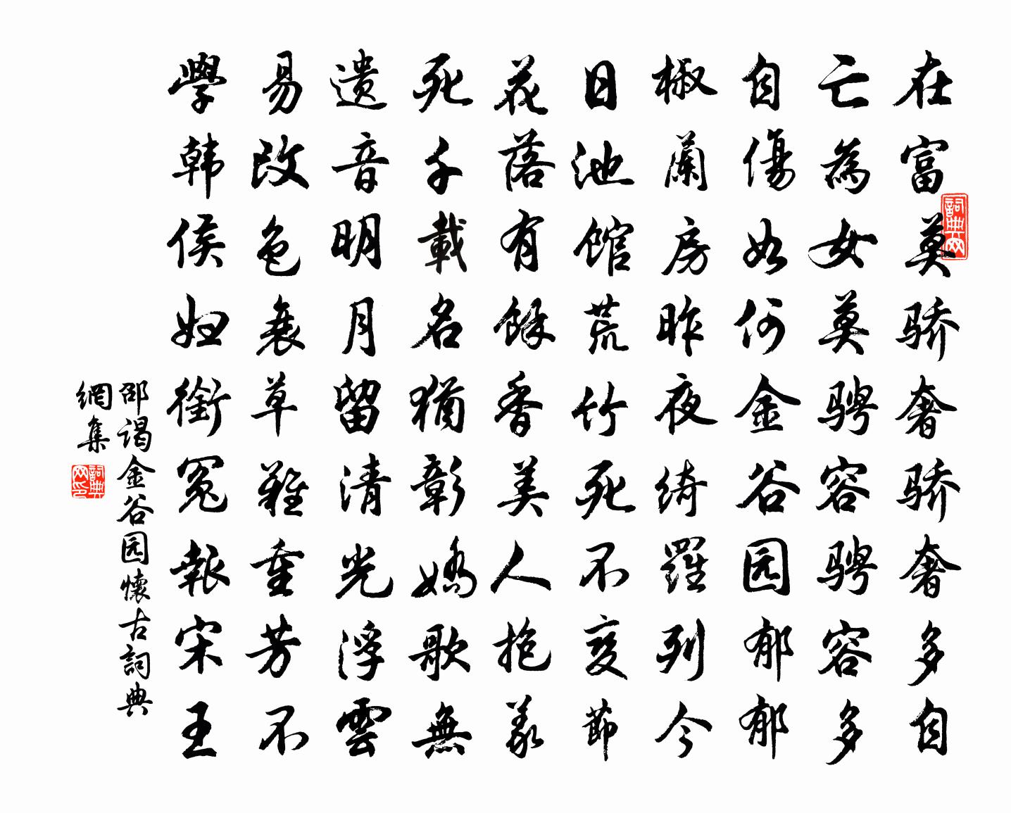 詩詞名句歷史字典書法欣賞書法字典國語詞典說文解字康熙字典古漢語字典標 題 作 者 詩 句 金谷園懷古作者:邵謁 朝代:唐代金谷園懷古原文在富莫驕奢,驕奢多自亡。為女莫騁容,騁容多自傷。如何金谷園,鬱郁椒蘭房。昨夜綺羅列,今日池館荒。竹死不變節,花落有餘香。美人抱義死,千載名猶彰。嬌歌無遺音,明月留清光。浮雲易改色,衰草難重芳。不學韓侯婦,銜冤報宋王。詩詞問答問:金谷園懷古的作者是誰?答:邵謁問:金谷園懷古寫於哪個朝代?答:唐代問:金谷園懷古是什麼體裁?答:五古邵謁金谷園懷古書法欣賞金谷園懷古書法作品注釋全唐詩:卷605-17詩詞推薦離京後作七首張耒〔宋代〕苹芷江邊已五年,厭聞風浪打船舷。南風蕭艾荒涼野,時望高丘一慨然。小鴨黃庭堅〔宋代〕小鴨看從筆下生,幻法生機全得妙。自知力小畏滄波,睡起晴沙依晚照。風流子張元乾〔宋代〕飛觀插雕粱。憑虛起、縹緲五雲鄉。對山滴翠嵐,兩眉濃黛,水分雙派,滿眼波光。曲欄乾外,汀煙輕冉冉,莎草次韻粹之通判九日之作李彌遜〔宋代〕柏子香中閉淨坊,為君著屐弄秋陽。老來見事如無事,節里隨鄉且入鄉。但可炊糜傾免褐,何妨撚菊泛鵝黃。九仙征西舊卒許渾〔唐代〕少年乘勇氣,百戰過烏孫。力盡邊城難,功加上將恩。曉風聽戍角,殘月倚營門。自說輕生處,金瘡有舊痕。桃源李群玉〔唐代〕我到瞿真上升處,山川四望使人愁。紫雪白鶴去不返,唯有桃花溪水流。拜岳王墓林景熙〔宋代〕寥落一杯在,英雄萬古冤。孤忠懸白日,遺恨寄中原。樹老殘霞澹,塵深斷碣昏。東南天半壁,往事泣寒猿。寄棲白上人李昌符〔唐代〕剪髮兼成隱,將心更屬文。無憀對豪客,不拜謁吾君。畫壁惟泉石,經窗半典墳。歸林幽鳥狎,乞食病僧分。默坐和趙茂嘉郎中雙頭芍藥二首辛棄疾〔宋代〕昨日梅華同語笑,今朝芍藥並芬芳。弟兄殿住春風了,卻遣花來送一觴。呈李讓臣就寄翰林閻學士方回〔宋代〕鞭霆來自紫皇宮,天上綸言播德風。為報玉堂真學士,猶憐雪鬢老詩翁。星明斗極璇霄北,水注蓬萊碧海東。身不松盧士衡〔唐代〕雲外千尋好性靈,伴杉陪柏事孤貞。招呼暑氣終無分,應和涼風別有聲。細雨灑時花旋落,道人食處葉重生。如逢吳赤壁孫元晏〔唐代〕會獵書來舉國驚,只應周魯不教迎。曹公一戰奔波後,赤壁功傳萬古名。魚蘇軾〔宋代〕湖上移魚子,初生不畏人。自從識鉤餌,欲見更無因。寄題韓丞相定州閱古堂王令〔宋代〕始聞定作閱古堂,又聞定有閱古詩。揚之遠定五千里,思得兩翅擘以飛。偶聞人來說堂事,初敞兩壁無塵疵。閒時公度惠花走筆戲謝強至〔宋代〕二月都城未見花,不知春色落誰家。滿盤折惠情何重,略嗅生香思已嘉。酬馮監拜昭陵回途中遇雨見示權德輿〔唐代〕之子共乘軺,清秋拜上霄。曙霞迎夙駕,零雨濕回鑣。甘谷行初盡,軒台去漸遙。望中猶可辨,耘鳥下山椒。相和歌辭。昭君詞李端〔唐代〕李陵初送子卿回,漢月明明照帳來。憶著長安舊遊處,千門萬戶玉樓台。真珠簾徐□〔宋代〕落紅幾陣清明雨。憶花期、半被晴慳寒阻。新柳著春濃,早翠池波妒。粉雨香雲訊息遠,漫舊日、鞦韆庭宇。凝佇憶秦娥·與君別房舜卿〔宋代〕與君別。相思一夜梅花發。梅花發。淒涼南浦,斷橋斜月。盈盈微步凌波襪。東風笑倚天涯闊。天涯闊。一聲羌管水龍吟 清明後浹日,過子方小飲,廉櫳靚深史藥房〔元代〕韻蕭遠。主人出侍 * 琵琶侑觴,酒未終,上馬徑去,恍然藍橋湓浦之遇也,賦水龍吟以記其事,呈子方一笑等閒名句推薦晚風庭院落梅初。淡雲來往月疏疏。李清照《浣溪沙·髻子傷春慵更梳》 鳥飛千白點,日沒半紅輪。白居易《彭蠡湖晚歸》 二月春花厭落梅。仙源歸路碧桃催。渭城絲雨勸離杯。晏幾道《浣溪沙·二月春花厭落梅》 聞善以相告也,見善以相示也戴聖《禮記·儒行》 從別後,憶相逢,幾回魂夢與君同。晏幾道《鷓鴣天·彩袖殷勤捧玉鍾》 舉杯互敬屠蘇酒,散席分嘗勝利茶。 * 《元旦口占用柳亞子懷人韻》 驚起卻回頭,有恨無人省。蘇軾《卜運算元·黃州定慧院寓居作》 思牽今夜腸應直,雨冷香魂吊書客。李賀《秋來》 良藥苦口利於病,忠言逆耳利於行。宋濂、王褘《元史·列傳·卷五十五》 天與短因緣,聚散常容易。晏幾道《生查子·狂花頃刻香》