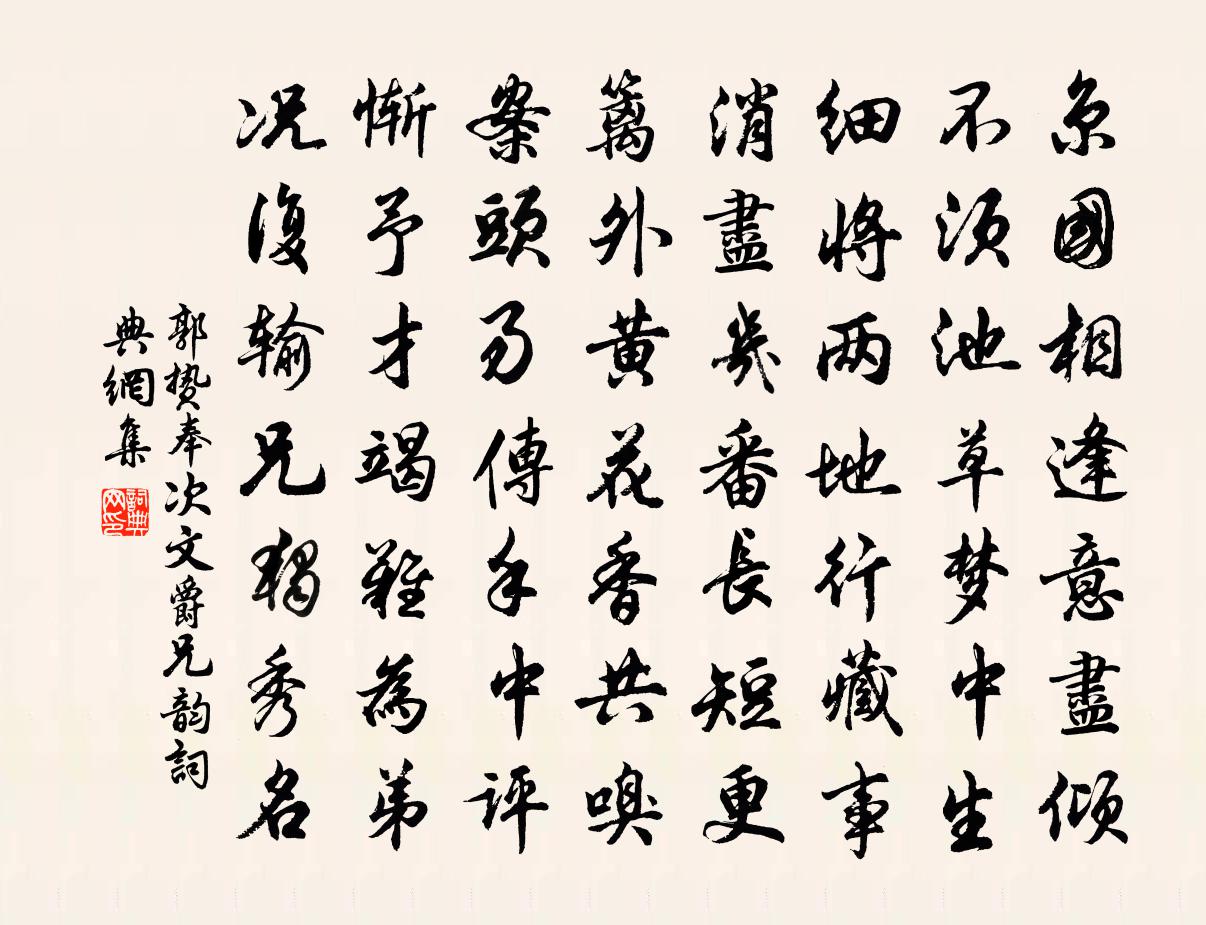 詩詞名句歷史字典書法欣賞書法字典國語詞典說文解字康熙字典古漢語字典標 題 作 者 詩 句 奉次文爵兄韻作者:郭贄 朝代:宋代奉次文爵兄韻原文京國相逢意盡傾,不須池草夢中生。細將兩地行藏事,消盡幾番長短更。籬外黃花香共嗅,案頭易傳手中評。慚予才竭難為弟,況復輸兄獨秀名。詩詞問答問:奉次文爵兄韻的作者是誰?答:郭贄問:奉次文爵兄韻寫於哪個朝代?答:宋代郭贄奉次文爵兄韻書法欣賞奉次文爵兄韻書法作品詩詞推薦窗底張煒〔宋代〕日炙虛窗暖欲春,窗前椒蕾破梅英。朦朧困眼看書倦,驀聽蜂兒撲紙聲。木蘭花慢郭居安〔宋代〕聽都人共語,又還是、歲逢庚。記今帖頻催,袞衣將至,繡幰先迎。笙歌六宮齊奏,到而今、猶唱賀昇平。千歲人鴛鴦湖棹歌 之八十九朱彝尊〔清代〕鴨嘴小船淺水通,獲花門巷蕭蕭風。荊南豫北斗新釀,不比吾鄉清若空。杜處士新居羅隱〔唐代〕翠斂王孫草,荒誅宋玉茅。寇余無故物,時薄少深交。迸筍穿行徑,飢雛出壞巢。小園吾亦有,多病近來拋。後紀時行陳著〔宋代〕歲在乙酉孟春朔,天氣凝滯雲不開。一日二日三四日,或雪或雨或夜雷。山川失色萬物病,寒氣折骨淖沒脛。如大石榴梅堯臣〔宋代〕榴枝苦多雨,過熟坼已半。秋雷石罌破,曉日丹砂爛。任從雕俎薦,豈待霜刀判。張騫西使時,菩醬同歸漢。讀赤壁賦前後二首文天祥〔宋代〕一笑滄波浩浩流,只雞斗酒更扁舟。八龍寫作詩中案,孤鶴來為夢裡游。楊柳遠煙連北府,蘆花新月對南樓。玉仙漢川山行,呈成少尹岑參〔唐代〕西蜀方攜手,南宮憶比肩。平生猶不淺,羈旅轉相憐。山店雲迎客,江村犬吠船。秋來取一醉,須待月光眠。久雨嘆曹彥約〔宋代〕誰為戎首起邊功,萬里生靈一擲中。天為憂之連作雨,人無識者驟歌風。所期壁地今城守,不善因糧卻火攻。古道參政大資毗陵張公輓詩十首周麟之〔宋代〕四老延清會,連年樂故鄉。譽騰花萼集,光動德星堂。今獨三荊茂,居然一鑒亡。慶流知有在,蘭玉藹遺芳。松滋江北阻風閻寬〔唐代〕江風久未歇,山雨復相仍。巨浪天涯起,餘寒川上凝。憂人勞夕惕,鄉事憊晨興。遠聽知音駭,誠哉不可陵。同劉仲忱舍人先生鄭武子餞伯氏賦兩篇得聖歡王洋〔宋代〕客行仍別離,此恨亦已更。去語已莫留,來愁不須聘。七閩何貪賢,四海方仰聖。班驛是歸塗,頻宜發新詠。滿江紅黃人傑〔宋代〕時帥已拜興元命小隊旌旗,又催送、元戎領客。政十頃、荷香微度,草煙橫碧。楊柳參差新合翠,水天上下俱齊色送滕寺丞歸蘇州梅堯臣〔宋代〕驅車入蜀時,有弟母不往。留婦侍母傍,以子囑婦養。昨得閶門書,婦子死泉壤。此心那得安,棄官提轡鞅。東馳念奴嬌周文謨〔宋代〕棋聲特地,把十年心事,恍然驚覺。楊柳樓頭歌舞地,長記一枝纖弱。破鏡重圓,玉環猶在,鸚鵡言如昨。秦箏別賀費樞密登卞忠貞公墓程珌〔宋代〕底用荒村訪野墳,青編相對儼如存。當年但識清談樂,今日方知節概尊。千載腐儒空弔古,幾章冷語自消魂。便當宋道士同游白雲關真山民〔宋代〕扶攜方外友,來入白雲關。 * 峰如畫,兩三人倚欄。棋聲敲竹外,簾影落花間。一曲瑤琴罷,翠陰生晝寒。和人歲宴旅舍見寄韋莊〔唐代〕積雪滿前除,寒光夜皎如。老憂新歲近,貧覺故交疏。意合論文後,心降得句初。莫言常鬱郁,天道有盈虛。長相思(春濃)趙長卿〔宋代〕花飛飛。柳依依。簾擲東風日正遲。社前雙燕歸。藥欄東,藥欄西。記得當時素手攜。彎彎月似眉。待制中書舍人陳公之亡以山宅須利既遷殯而未葉適〔宋代〕可怕陰陽惡,還驚日月遒。終成埋璧去,不作坐禪留。雨洗一簞淨,風翻千橘愁。門前繫船橛,宿鳥漫嘀啾。名句推薦燕忙鶯懶芳殘,正堤上、柳花飄墜。章楶《水龍吟·燕忙鶯懶芳殘》 溪雲初起日沉閣,山雨欲來風滿樓。許渾《鹹陽城東樓 / 鹹陽城西樓晚眺 / 西門》 昔日橫波目,今成流淚泉。李白《長相思三首·其二》 相送巴陵口,含淚上舟行。陳子龍《三洲歌》 冷艷全欺雪,余香乍入衣。丘為《左掖梨花》 田園寥落干戈後,骨肉流離道路中。白居易《望月有感》 非學無以廣才,非志無以成學。諸葛亮《誡子書》 相逢不用忙歸去,明日黃花蝶也愁。蘇軾《九日次韻王鞏》 迎醉面,暮雪飛花,幾點黛愁山暝。吳文英《十二郎·垂虹橋》 天明登前途,獨與老翁別。杜甫《石壕吏》