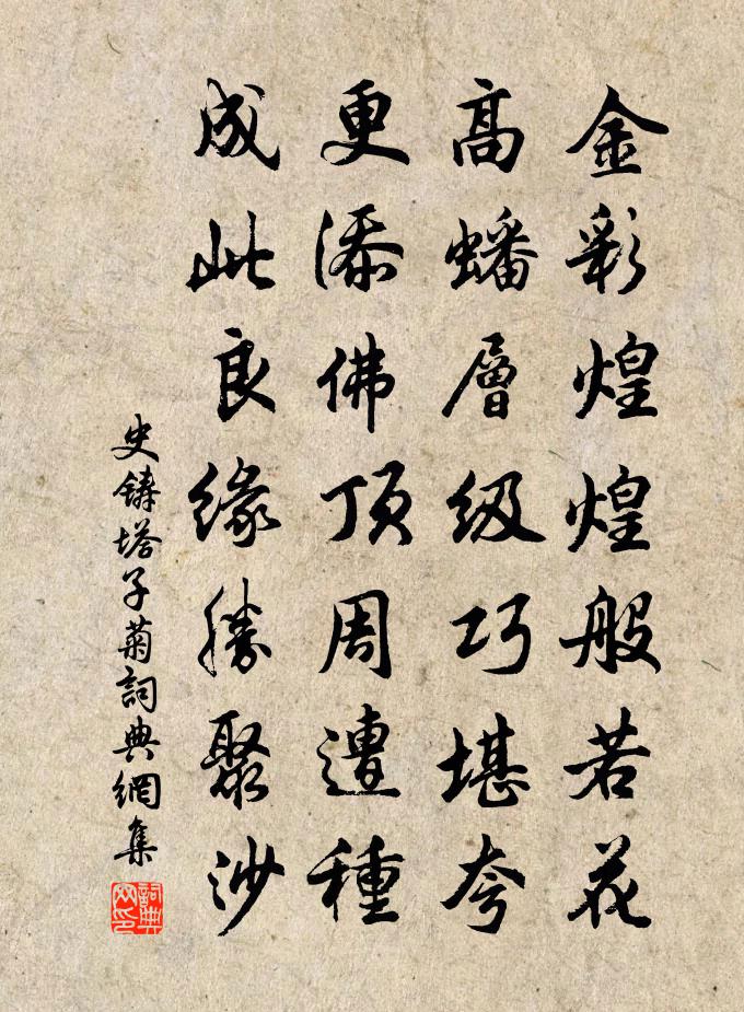 詩詞名句歷史字典書法欣賞書法字典國語詞典說文解字康熙字典古漢語字典標 題 作 者 詩 句 塔子菊作者:史鑄 朝代:宋代塔子菊原文金彩煌煌般若花,高蟠層級巧堪夸。更添佛頂周遭種,成此良緣勝聚沙。詩詞問答問:塔子菊的作者是誰?答:史鑄問:塔子菊寫於哪個朝代?答:宋代史鑄塔子菊書法欣賞塔子菊書法作品詩詞推薦祀雨師樂章。迎神包佶〔唐代〕陟降左右,誠達幽圓。作解之功,樂惟有年。雲輧戾止,灑霧飄煙。惟馨展禮,爰列豆籩。湖西雜感詩釋智圓〔宋代〕福善禍淫言可信,吉凶由己語堪陳。乖仁背義都無恥,只記臨行揀日辰。三昧諸頌釋印肅〔宋代〕大虛塗毒鼓,有病聞皆愈。無病聞皆死,死了卻蘇來,誰會辜負你。送胡季昭謫象州曾夢選〔宋代〕象州銷黯又欽州,道路何辭作遠遊。投北誰憐新逐客,落南不舊編修里。江山在處猶加護,廊廟諸公底著羞。天定謝汾州田大夫寄茸氈葡萄姚合〔唐代〕筐封紫葡萄,筒卷白茸毛。臥暖身應健,含消齒免勞。衾衣疏不稱,梨栗鄙難高。曉起題詩報,寒澌滿筆毫。偈頌七十二首釋祖欽〔宋代〕量外機,格外句。凡聖 * ,佛祖罔措。有來由,無本據,聲前切忌錯舉。鮑靖之左藏薛嵎〔宋代〕一門期負荷,太息此生終。世道不如古,君心誰與同。官清余橐在,苫返故堂空。作善寧須報,悠悠付彼穹。張麗華墓劉克莊〔宋代〕台上柏蕭蕭,空堂閉寂寥。芳魂三尺土,往事幾回潮。墮翠尋難見,埋紅恨未銷。猶勝江令在,白首入隋朝。賞李吟金朋說〔宋代〕雅綴瓊林伴召棠,梨花綜錯影琳琅。慚無廊廟調羹味,莫惜區區棄路旁。春送禪師歸閩中貫休〔唐代〕春色滿三湘,送師還故鄉。穿霞逢黑冗鳥,乞食得紅姜。大化宗門辟,孤禪海樹涼。儻為新句偈,寄我亦何妨。丙寅記顏六言二首劉克莊〔宋代〕手無太尉玉麈,腰無鄂公羽箭。一聲喝海潮音,一隻眼岩下電。賀新郎(實之用前韻為老者壽,戲答。)劉克莊〔宋代〕身畔無絲縷。但從前、練裳練帨,做他家主。甲子一周加二紀,兔走烏飛幾度。賽孔子、如來三五徐陵云:小如來虞美人許棐〔宋代〕杏花窗底人中酒。花與人相守。簾衣不肯護春寒。一聲嬌嚏兩眉攢。擁衾眠。明朝又有鞦韆約。恐未忺梳掠。倩誰鷓鴣天徐俯〔宋代〕綠水名園不是村。淡妝濃笑兩生春。笛中已自多愁怨,雨里因誰有淚痕。香旖旎,酒氤氳。多情生怕落紛紛。舊來野亭郭印〔宋代〕□到幽亭上,蕭然淨客心。竹深風細細,柏古氣森森。畏日背斜照,珍禽共好音。未能還小隱,即此是山林。送春吳錫疇〔宋代〕紅襯晴霞一角天,小樓重上眺前川。莫言春去無蹤跡,盡在枝頭嫩綠邊。再次前韻代梅答湯悅〔唐代〕托植經多稔,頃筐向盛時。枝條雖已故,情分不曾移。莫向階前老,還同鏡里衰。更應憐墮葉,殘吹掛蟲絲。浣溪沙 三台送客,作離合體元好問〔金代〕錦帶吳鉤萬里行。青雲人物舊知名。百壺春酒過清明。渺渺荒陂冰井路,青青楊柳玉關情。斜陽無語下西陵。聞鄞兵入仙居二首舒岳祥〔宋代〕細雨殘陽外,孤村亂水中。飢年才半菽,白髮聽疏舂。世事何曾了,吾生會有窮。深衣斂形日,差我一枝筇。何事晁說之〔宋代〕何事千憂自惘然,且看節物異鄉邊。鶯來昨日猶多吃,柳到今朝第幾眠。上巳清明徒頡頏,流觴蹴踘豈周旋。故知名句推薦上苑風煙好,中橋道路平。白居易《洛橋寒食日作十韻》 記當日、門掩梨花,翦燈深夜語。史達祖《綺羅香·詠春雨》 鞠躬盡瘁,死而後已。諸葛亮《後出師表》 為學日益,為道日損。損之又損,以至於無為。老子《老子·德經·第四十八章》 黑雲翻墨未遮山,白雨跳珠亂入船。蘇軾《六月二十七日望湖樓醉書》 珠玉在側,覺我形穢。劉義慶《世說新語·容止》 佳人亦何念,淒斷陽關曲。蘇軾《送頓起》 天容水色西湖好,雲物俱鮮。歐陽修《採桑子·天容水色西湖好》 愛之欲其生,惡之欲其死。釋原妙《偈頌六十七首》 君子以同而異。佚名《易傳·象傳下·睽》