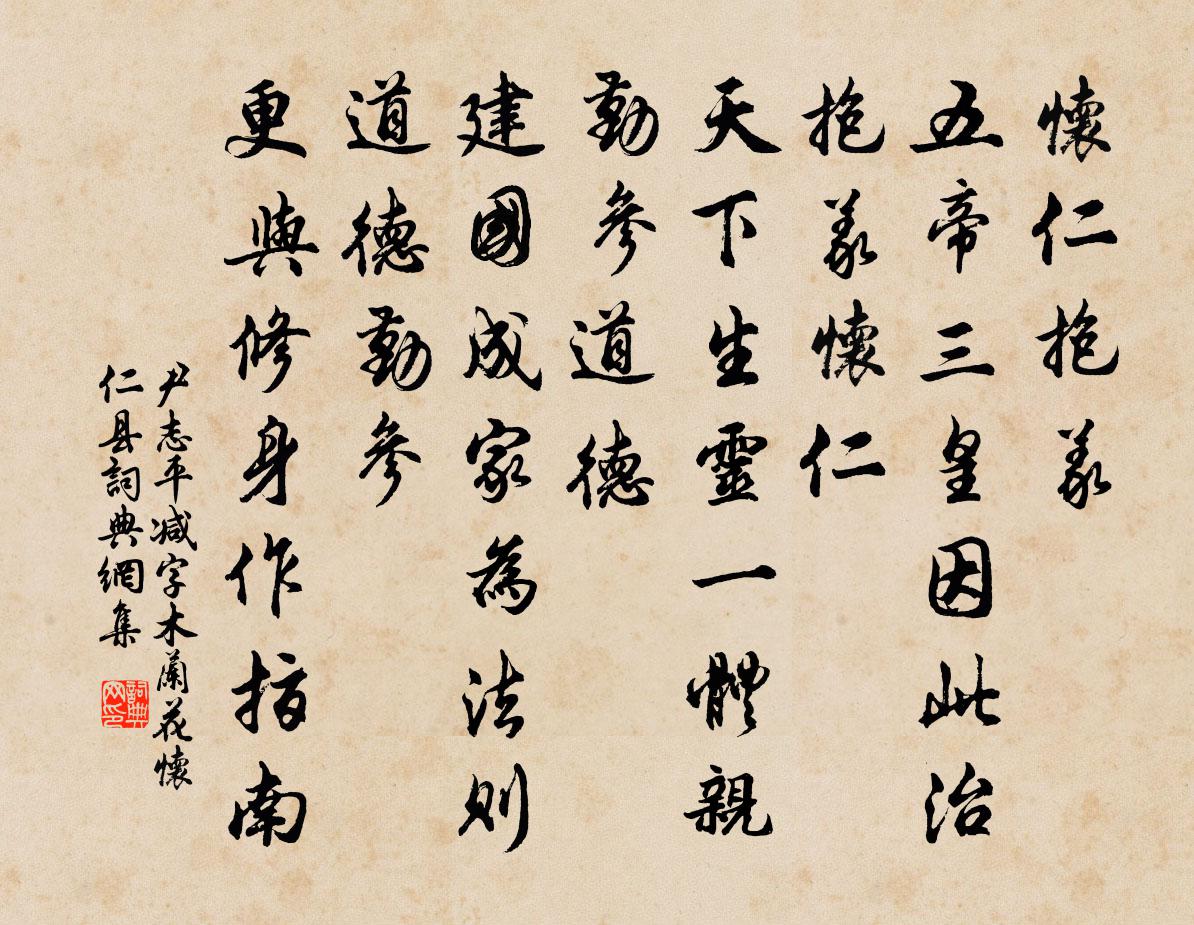 詩詞名句歷史字典書法欣賞書法字典國語詞典說文解字康熙字典古漢語字典標 題 作 者 詩 句 減字木蘭花 懷仁縣作者:尹志平 朝代:元代減字木蘭花 懷仁縣原文懷仁抱義。五帝三皇因此治。抱義懷仁。天下生靈一體親。勤參道德。建國成家為法則。道德勤參。更與修身作指南。詩詞問答問:減字木蘭花 懷仁縣的作者是誰?答:尹志平問:減字木蘭花 懷仁縣寫於哪個朝代?答:元代問:減字木蘭花 懷仁縣是什麼體裁?答:詞尹志平減字木蘭花 懷仁縣書法欣賞減字木蘭花 懷仁縣書法作品詩詞推薦賦得春雪映早梅元稹〔唐代〕飛舞先春雪,因依上番梅。一枝方漸秀,六出已同開。積素光逾密,真花節暗催。摶風飄不散,見晛忽偏摧。郢曲書淵明詩後辛棄疾〔宋代〕淵明避俗未聞道,此是東坡居士雲。身似枯株心似水,此非聞道更誰聞。題扇二十四首曹勛〔宋代〕弄袖和風拂拂輕,眾香迎面酒微醒。涼尋小徑通幽處,花壓欄乾竹一亭。次韻宋待制晚春書懷林季仲〔宋代〕春事何曾解有窮,枝頭尋覓漫匆匆。去來燕認誰家戶,開落花因一夜風。萬古英雄殘照里,半生勳業醉魂中。騷人僧廬陸游〔宋代〕僧廬土木塗金碧,四出徵求如羽檄。富商豪吏多厚積,宜其棄金如瓦礫。貧民妻子半菽食,一飢轉作溝中瘠,賦歛三月十四日陪同年十有六人游淨慈遂飲於水月喻良能〔宋代〕崇桃穠李亦不惡,一笑海棠尤可人。徐熙趙昌俱骨朽,翠袖卷綃誰寫真。賣油翁歐陽修〔宋代〕 陳康肅公善射,當世無雙 ,公亦以此自矜。嘗射於家圃,有賣油翁釋擔而立,睨之久而不去。見其發矢十中遠遊篇曹勛〔宋代〕少年重意氣,辭家遠行游。高談蔑卿相,峻節凌九秋。仗劍謁明主,挾策乾諸侯。眾目寶康瓠,明月難暗投。驊騮閏九月九日晏殊〔宋代〕閏秋重九再佳辰,猶見黃花裛露新。更作登高亦何害,恨無彭澤苦吟人。周亞夫徐鈞〔宋代〕削平吳楚大功成,一旦生疑觸怒霆。自是君王多任刻,非關許負相書靈。期頤堂龔明之〔宋代〕少年已自樂杯觴,種秫安排老醉鄉。試問幾回供酒事,真成三萬六千場。題岳陽守張仲駿浮光亭王炎〔宋代〕三邊水墨畫遙山,下有玻璃萬頃寒。蟾兔上時留倒影,魚龍舞處動微瀾。舊來樓觀東西出,未覺乾坤表里寬。更向入閣鄭谷〔唐代〕秘殿臨軒日,和鑾返正年。兩班文武盛,百辟羽儀全。霜漏清中禁,風旗拂曙天。門嚴新勘契,仗入乍承宣。玉幾說詩宋湘〔清代〕心源探到古人初,徵實翻空總自如。好把臭皮囊洗淨,神仙樓閣在高虛。大滌洞天留題謝岳甫〔宋代〕入山細問山中事,紺宇瓊居八百年。五洞潛通誰縮地,一峰突起解擎天。眼前去馬來牛債,夢裡驂鸞跨鵠緣。卻羨招仲威不至反辱惠梨趙蕃〔宋代〕屢廢招呼定可人,豈嫌昏暮叩門頻。不來醉我傾家釀,反更分渠飣坐珍。梅花和黃覺民四首王之道〔宋代〕依倚春風雨淨瓶,暮林搖落避真清。暗香似與常娥約,來借黃昏淡淡明。頌十玄談演教釋印肅〔宋代〕真淨界中才一念,未離學地終須欠。今生努力絕名言,永劫不遭塵垢垢。偈頌一百一十七首釋紹曇〔宋代〕三月青春彈指過,九旬朱夏又從頭。茶抽雀舌郎忙摘,麥弄蝦須逐旋收。熾然說法,聲撼林丘。謝鄭守王密學惠酒邵雍〔宋代〕堂堂大府來新酒,密密小園開好花。此日飲之紅樹下,還驚不稱野人家。名句推薦玉輪碾平芳草,半面惱紅妝。陳子龍《訴衷情·春遊》 若是前生未有緣,待重結、來生願。樂婉《卜運算元·答施》 城中桃李愁風雨,春在溪頭薺菜花。辛棄疾《鷓鴣天·陌上柔桑破嫩芽》 一重山,兩重山。山遠天高煙水寒,相思楓葉丹。李煜《長相思·一重山》 見人初解語嘔啞,不肯歸眠戀小車。韋莊《與小女》 赤壁磯頭落照,肥水橋邊衰草,渺渺喚人愁張孝祥《水調歌頭·和龐佑父》 日高煙斂,更看今日晴未。李清照《念奴嬌·春情》 力微休負重,言輕莫勸人。佚名《增廣賢文·上集》 今逢四海為家日,故壘蕭蕭蘆荻秋。劉禹錫《西塞山懷古》 田家幾日閒,耕種從此起。韋應物《觀田家》