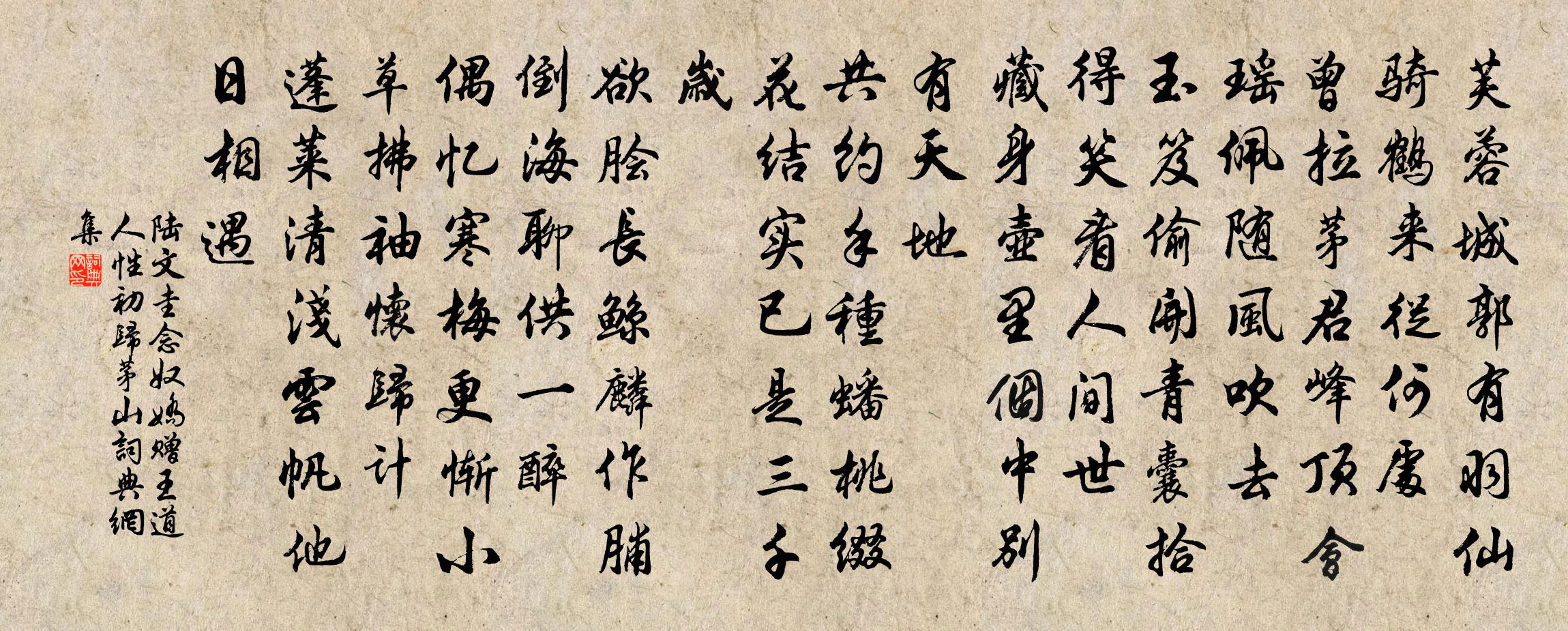 詩詞名句歷史字典書法欣賞書法字典國語詞典說文解字康熙字典古漢語字典標 題 作 者 詩 句 念奴嬌 贈王道人性初歸茅山作者:陸文圭 朝代:元代原文芙蓉城郭,有羽仙騎鶴,來從何處。曾拉茅君峰頂會,瑤佩隨風吹去。玉笈偷開,青囊拾得,笑看人間世。藏身壺裡,箇中別有天地。共約手種蟠桃,綴花結實,已是三千歲。欲膾長鯨麟作脯,倒海聊供一醉。偶憶寒梅,更慚小草,拂袖懷歸計。蓬萊清淺,雲帆他日相遇。詩詞問答問:《念奴嬌 贈王道人性初歸茅山》的作者是誰?答:陸文圭問:該詩寫於哪個朝代?答:元代問:該詩是什麼體裁?答:詞書法欣賞念奴嬌 贈王道人性初歸茅山書法作品詩詞推薦兩山趙仁甫宰臨安有武學生張丈相訪酒邊弄刀戴復古〔宋代〕風流晉宋時人物,花縣鳴琴調甚新。不厭開樽留劍客,仍能下榻待詩人。九龍池館空陳跡,十錦山川自好春。但見紹興淳熙分命館職定撰十七首佚名〔宋代〕[太簇為徽]休德孔昭,靈承上帝。孝極尊觀,嚴配於位。嘉芳芬芳,禮無不備。神其格思,享茲誠至。偈頌四十二首釋祖先〔宋代〕節屆書雲,陰極陽升。冰河發焰,枯木抽英。惟有拄杖子,依舊黑輪皴。不遷不變,無辱無榮。笑殺當年面壁人。丙午仲春西湖舟中作喻良能〔宋代〕春陰將近一百六,絮擘晴雲新雨足。煙邊芳草碧如茵,籬畔海棠紅映肉。相攜逗曉出城西,城西風景如杜曲。兩岸偶得一絕劉錡〔宋代〕清風葉葉映黃鸝,綠暗紅稀半掩扉。我以忘言靜思慮,子規猶道不如歸。王君行丈輓詩項安世〔宋代〕樂叟干將劍,鋒鋩凜不收。之人獨和厚,與世極沉浮。淑氣長三月,高懷自九秋。洞門元不鎖,依舊少從游。題羅觀光藏陳所翁墨竹方回〔宋代〕陳其姓,名曰容。稱所翁,善畫龍。葛嶺翹材酒杯客,不分虎,不憑熊。晚節寫此籜龍兒,真是老筆善藏鋒。我嘗送留正知贛州傅伯成〔宋代〕尚書鎮章江,慈母懷嬰兒。去年甫去郡,未覺棠陰移。如何失調馭,眾目驚睽睽。詔書念前績,趣志持州麾。重臨枕流軒關希聲〔宋代〕山出太虛外,溪流千古高。臨窗喧客枕,洗耳濺僧袍。夜月氣猶凜,秋風聲更豪。二年游賞劇,欲別首頻搔。杏花天高觀國〔宋代〕霽煙消處寒猶嫩。乍門巷、愔愔晝永。池塘芳草魂初醒。秀句吟春未穩。仙源阻、春風瘦損。又燕子、來無芳信。寄永興吳龍圖給事文同〔宋代〕見山樓迥倚晴虛,看展終南百幅圖。聞說二林尤勝絕,想公高興在香爐。甲午歲相國李公有北園寄贈之作…寓哀冥寞以廣遺韻雲武元衡〔唐代〕機事勞西掖,幽懷寄北園。鶴巢深更靜,蟬噪斷猶喧。仙醞百花馥,艷歌雙袖翻。碧雲詩變雅,皇澤葉流根。未報甲辰送淮東黎漕趨朝二首李曾伯〔宋代〕始焉來此學分弓,定計初筵畫諾中。擊楫少能思祖逖,同舟多賴有婁公。老懷不奈周南滯,佳客今成冀北空。天上晨起雪作趙蕃〔宋代〕苦寒不成眠,哀哉何時旦。擁衣聽雞鳴,有類巢木鸛。窗明若彷彿,自起尋宿炭。殘爐星銷盡,束緼分鄰爨。頻年重次龔子輝平塘韻三首陶夢桂〔宋代〕家園指擬似淇園,惜筍兼存上下番。若與此君情分簿,應無風月到吾門。聞雁高啟〔明代〕江寒月黑夜,定宿蒹葭里。叫叫過燈前,卻是誰驚起?凌雲寺薛能〔唐代〕像閣與山齊,何人致石梯。萬煙生聚落,一崦露招提。齋月人來上,殘陽鴿去棲。從邊亦已極,烽火是沈黎。鬲溪梅令·丙辰冬自無錫歸作此寓意姜夔〔宋代〕丙辰冬,自無錫歸,作此寓意。好花不與殢香人,浪粼粼。又恐春風歸去綠成陰,玉鈿何處尋。木蘭雙槳夢中雲,又絕句韓維〔宋代〕芙蓉落盡荷葉黃,西風測測梧桐涼。歲登訟息休吏早,林間獨坐歌還鄉。梁鼓吹曲 石首局沈約〔南北朝〕石首局。北墉墐。新堞嚴。東壘峻。共表里。遙相鎮。矢未飛。鼓方振。競銜璧。並輿櫬。酒池擾。象廊震。同伐名句推薦醉里秋波,夢中朝雨,都是醒時煩惱。時彥《青門飲·寄寵人》 樂極生悲,否極泰來。施耐庵《水滸傳·第二十六回》 春日遲遲春草綠,野棠開盡飄香玉。李洞《繡嶺宮詞》 去年今日臥燕台,銅鼓中宵隱地雷王守仁《元夕二首》 金柳搖風樹樹,系彩舫龍舟遙岸。柳永《破陣樂·露花倒影》 曉看紅濕處,花重錦官城。杜甫《春夜喜雨》 名不徒生,而譽不自長。功成名遂。墨子《墨子·02章 修身》 獵人箭底求傷雁,釣戶竿頭乞活魚。王建《寄舊山僧》 君王選玉色,侍寢金屏中。李白《怨歌行》 白日何短短,百年苦易滿。李白《短歌行》