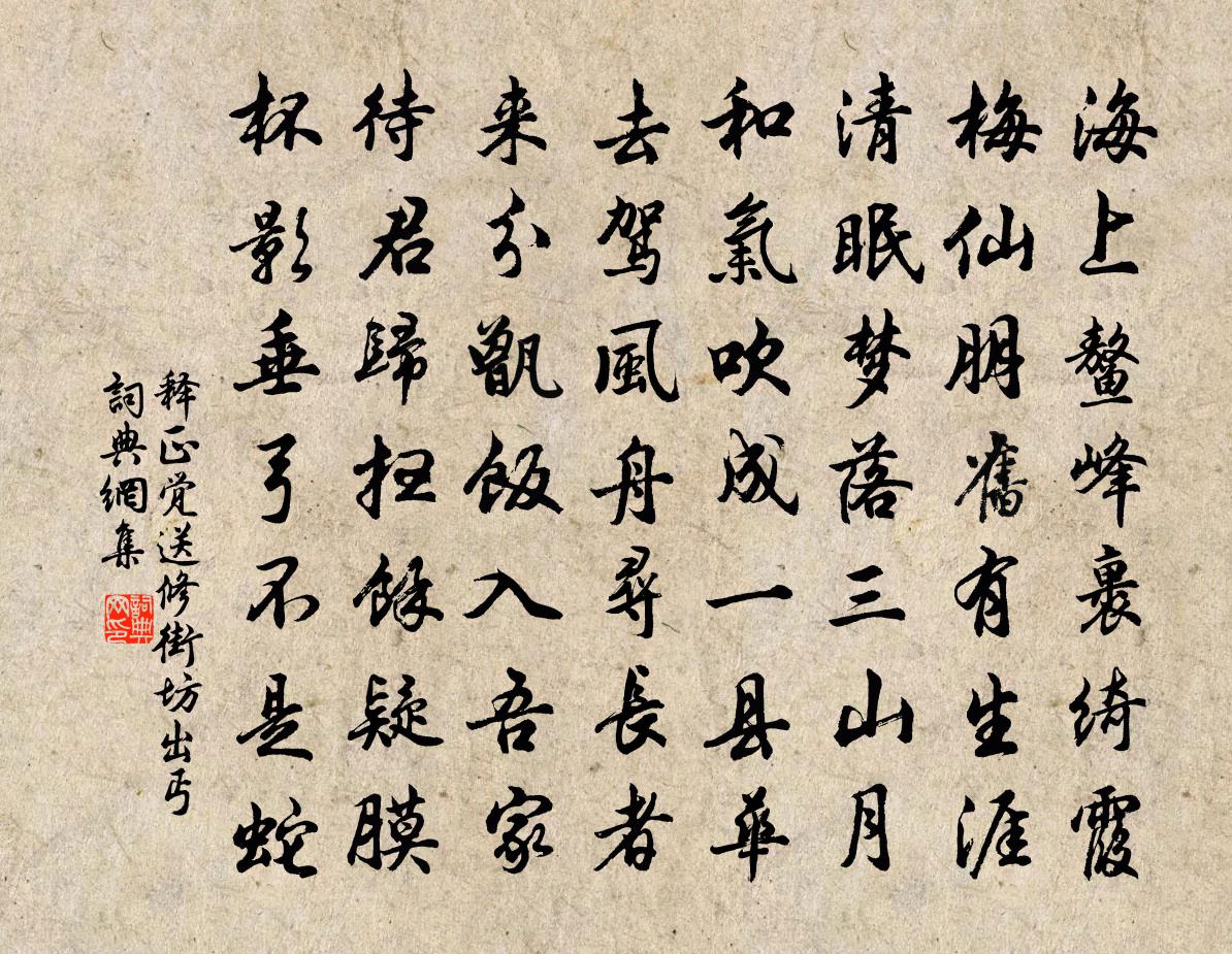 詩詞名句歷史字典書法欣賞書法字典國語詞典說文解字康熙字典古漢語字典標 題 作 者 詩 句 送修街坊出丐作者:釋正覺 朝代:宋代送修街坊出丐原文海上鰲峰裹綺霞,梅仙朋舊有生涯。清眠夢落三山月,和氣吹成一縣華。去駕風舟尋長者,來分甑飯入吾家。待君歸掃余疑膜,杯影垂弓不是蛇。詩詞問答問:送修街坊出丐的作者是誰?答:釋正覺問:送修街坊出丐寫於哪個朝代?答:宋代釋正覺送修街坊出丐書法欣賞送修街坊出丐書法作品詩詞推薦古詩十九首·孟冬寒氣至佚名〔兩漢〕孟冬寒氣至,北風何慘栗。愁多知夜長,仰觀眾星列。三五明月滿,四五蟾兔缺。客從遠方來,遺我一書札。上言八月八日發潭州後得絕句四十首趙蕃〔宋代〕老去真成病不禁,炎蒸三日瘧如侵。江山舊識思新面,佳處真成略枕衾。溪居柳宗元〔唐代〕久為簪組束,幸此南夷謫。閒依農圃鄰,偶似山林客。曉耕翻露草,夜榜響溪石。來往不逢人,長歌楚天碧。瓶笙黃庚〔宋代〕熱中竟日自煎烹,音節都從一氣生。緩緩煮湯方蟹眼,微微聒耳忽蠅聲。頻驚清夢愁無寐,似訴羈情嘆不平。卻笑玉山久旱七月一日雨作望者雲從常山來時趙吏趙蕃〔宋代〕一雨胡為限古城,定應留逐使君行。前驅尚遠毋庸遽,已見蕭蕭破久晴。晚春題遠上人南亭孟浩然〔唐代〕給園支遁隱,虛寂養閒和。春晚群木秀,關關黃鳥歌。林棲居士竹,池養右軍鵝。花月北窗下,清風期再過。再用前韻簡劉連州陳傅良〔宋代〕吳楚相望道阻長,我來邂逅挹群芳。人如盤谷元非隱,詩到孤山不道香。每與盍簪移永日,更須篝火及余觴。何須宋城宰韓秉文惠日鑄茶蘇轍〔宋代〕君家日鑄山前住,冬後茶芽麥粒粗。磨轉春雷飛白雪,甌傾錫水散凝酥。溪山去眼塵生面,簿領埋頭汗匝膚。一啜真宗汾陰禮畢親謝元德皇后室三首真宗〔宋代〕樂鏗金石,俎奉徨牲。九成斯秦,五教爰行。紅梅 十五王冕〔元代〕仙子歸來逸興賒,夢中猶說舊繁華。春風轉首情何已?卻向江南認杏花。題郭元德寓意齋藁後方回〔宋代〕一硯隨身一棹輕,斗南斗北仰詩名。豈真寓意不留意,□恐無情還有情。瘦島獨敲逢尹詰,癖陵寧死要人驚。□□偈十首釋道行〔宋代〕金烏急,玉兔速,天上星兮地下來。衲僧要透祖師關,勸君拈卻面前大案山,自然會得五祖把火入牛欄。林檢院琦第一百三十五文天祥〔宋代〕時危挹佳士,慘澹隨回鶻。佯狂真可哀,死淚終映睫。再用前韻醉明叔寄梅並酒王洋〔宋代〕絳蠟融春扇欲開,恐君池閣獨傳杯。故將曼語招新句,望外春風作伴來。恭和御製賜太師致仕文彥博七言四韻詩一首蘇頌〔宋代〕出處逢時道不殊,當年功立老間居。來膺冕紱三公命,歸奉雲章五色書。社稷元臣名已遂,山河雄鎮寵仍疏。瓊林雜賦陸游〔宋代〕得雨郊原已遍耕,東家西舍多逢迎。前山雲起樹無影,別浦潮生船有聲。子駿運使八詠堂巽堂文同〔宋代〕華堂聳嚴台,地勢側隨水。高臨巽宮上,其取名以是。峨峨寶峰頂,日影正辰已。繚棧入雲林,詰屈如篆字。輕霏送梵才上人歸天台皇甫泌〔宋代〕昔在童蒙歲,學禮暨詩書。肅肅秉庭訓,罔敢甯斯須。積習將一紀,心目多勤劬。本此修拙辭,階之登仕途。得以岑公洞洪咨夔〔宋代〕洞從開闢有,翁獨擅真清。磴古蒼苔澀,岩空細溜明。誰刊新即事,盡剔舊題名。太息今猶古,江山不世情。謁京口張守劉過〔宋代〕未識諸人名已侯,一麾應此滯徐州。誰知安石恐未免,欲借寇君何可留。遺愛與山同北固,平生作計豈東周。上方名句推薦獨出前門望野田,月明蕎麥花如雪。白居易《村夜》 上者驕,安其心以順。來俊臣《羅織經·事上卷第二》 報答春光知有處,應須美酒送生涯。杜甫《江畔獨步尋花七絕句》 一身虜雲外,萬里胡天西。岑參《早發焉耆懷終南別業》 君子修道立德,不謂窮困而改節佚名《孔子家語·在厄》 大樹底下好遮陰張南莊《何典·第十回》 何期今日酒,忽對故園花。文森《九日》 生而知之者上也,學而知之者次也;困而學之又其次也。困而不學,民斯為下矣。孔子弟子《論語·季氏篇》 好名羈行,重利無虧。來俊臣《羅織經·保身卷第七》 獨抱濃愁無好夢,夜闌猶剪燈花弄。李清照《蝶戀花·暖雨晴風初破凍》