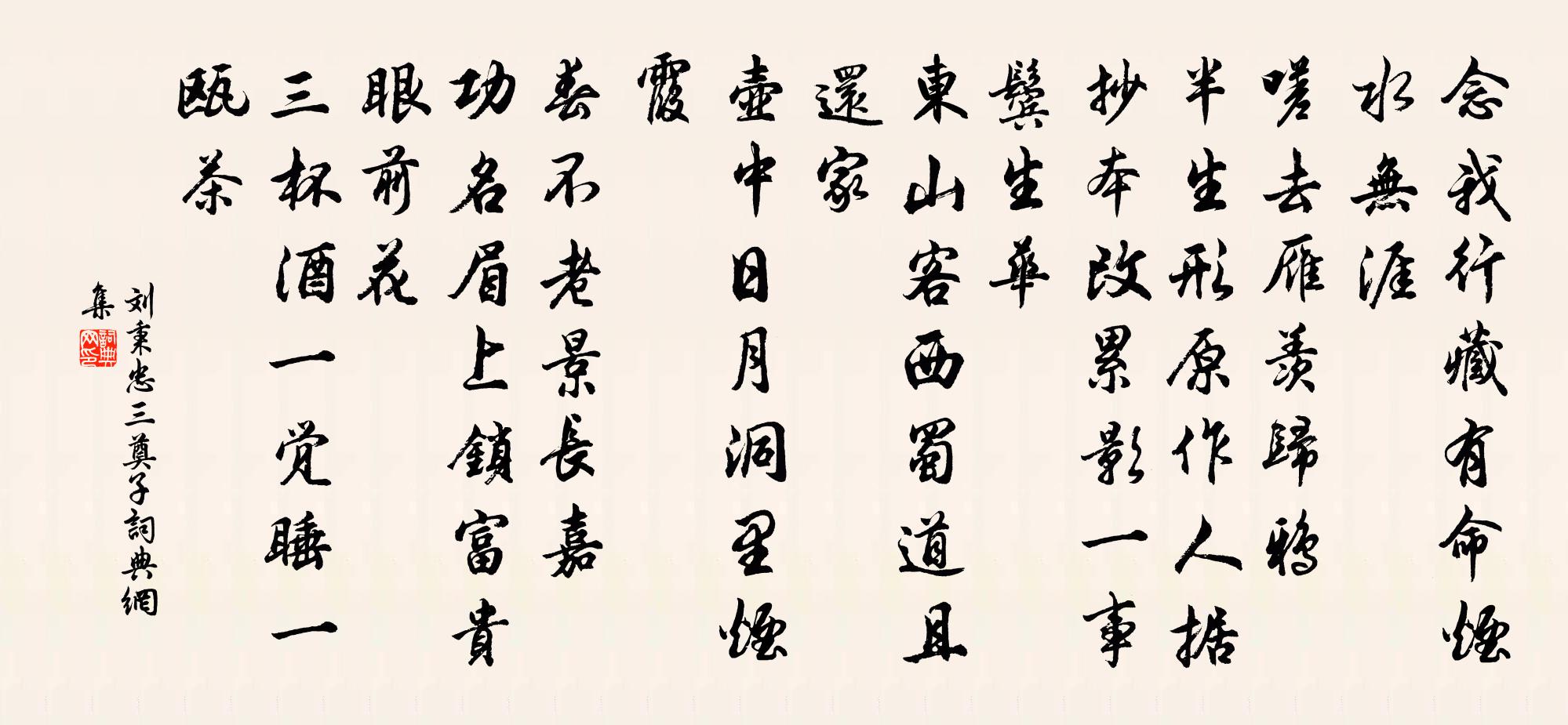 詩詞名句歷史字典書法欣賞書法字典國語詞典說文解字康熙字典古漢語字典標 題 作 者 詩 句 三奠子作者:劉秉忠 朝代:元代三奠子原文念我行藏有命,煙水無涯。嗟去雁,羨歸鴉。半生形原作人,據抄本改累影,一事鬢生華。東山客,西蜀道,且還家。壺中日月,洞裡煙霞。春不老,景長嘉。功名眉上鎖,富貴眼前花。三杯酒,一覺睡,一甌茶。詩詞問答問:三奠子的作者是誰?答:劉秉忠問:三奠子寫於哪個朝代?答:元代問:三奠子是什麼體裁?答:詞劉秉忠三奠子書法欣賞三奠子書法作品詩詞推薦江上別友人溫庭筠〔唐代〕秋色滿葭菼,離人西復東。幾年方暫見,一笑又難同。地勢蕭陵歇,江聲禹廟空。如何暮灘上,千里逐征鴻。驅車篇曹植〔魏晉〕驅車撣駑馬。東到奉高城。神哉彼泰山。五嶽專其名。隆高貫雲霓。嵯峨出太清。周流二六候。間置十二亭。上有用韻答紙衾簡雲岩李曾伯〔宋代〕骨胎盡出先生楮,醉夢常宜處士梅。席上雪鋪便我寢,帳中風動任渠開。和萬舍人折贈蠟梅韻虞儔〔宋代〕步繞名園日幾回,司花著意巧能裁。影疎雅稱燈籠映,香細疑從酒面來。破白江梅羞月妒,黏紅仙杏待春媒。何如二十四詩品司空圖〔唐代〕行神如空,行氣如虹,巫峽千尋,走雲連風。飲真茹強,蓄素守中,喻彼行健,是謂存雄。天地與立,神化攸同,梅花林憲〔宋代〕野梅空山中,正為照人開。如何綠窗底,疏映帶蒼苔。頗似古君子,無人自不諧。竹徑酒初醒,一信清香來。探春陳宓〔宋代〕桃李無言自曉妝,青春幾日最韶光。遊人不用頻來看,趁取初開未減香。漁家傲 贈孫姑馬鈺〔元代〕奉勸孫姑修大道。時時只把心田掃。殺了三屍並六耗。無煩惱。常清常淨知玄奧。休問異名爐與灶。沖和上下通顛東陽方韶卿惠古意七篇久不得和五月二十六日戴表元〔宋代〕作詩如挽船,學力乃篙櫓。向來牛耳盟,諸老肯多許。玄暉雲樹荒,仲宣江海阻。之子歸來歸,相思慰風雨。依韻和同年朱兵部王賓客交贈之什范仲淹〔宋代〕鶴禁蘭宮達了身,高居南闕重為鄰。西園冠蓋時時會,北海樽壘日日親。共棄榮華拋世態,同歸清靜復天真。一如郊廟歌辭。褒德廟樂章。褒德佚名〔唐代〕家著累仁,門昭積善。瑤篚既列,金縣式展。共城十吟其八曰春郊雨後邵雍〔宋代〕雨歇盪余春,天光露太真。茵鋪芳草軟,錦濯爛花新。風觸鶯簧健,煙舒柳帶勻。如何當此景,閒臥度昌辰。聽天吟邵雍〔宋代〕上天生我,上天死我。一聽於天,有何不可。和子融韻陳文蔚〔宋代〕為把新詩子細尋,時移不覺日西沉。固知妙旨存精一,須察人心與道心。次韻張直合避暑陳造〔宋代〕紅榴照眼筍穿階,峭合登臨快此來。淨境祛煩仍客共,醉鄉逃暑更書催。庭陰碎喜風頭動,虹影明看雨腳回。萬事自鹹平至太康鞍馬間得十小詩寄懷晏叔原並問黃庭堅〔宋代〕東南萬里江,緣淨一杯酒。王孫江南去,更得訊息否。雨中花(武康秋雨池上)毛滂〔宋代〕池上山寒欲霧。竹暗小窗低戶。數點秋聲侵短夢,檐下芭蕉雨。白酒浮蛆雞啄黍。問陶令、幾時歸去。溪月嶺雲紅和米芾李公炤家二王以前貼宜傾囊購取寄詩薛紹彭〔宋代〕聖草神蹤手自持,心潛模範識前規。惜哉法書垂世久,妙貼堂堂或見遺。寶章大軸首尾俱,破古欺世完使離。當時感興李中〔唐代〕漁休渭水興周日,龍起南陽相蜀時。不遇文王與先主,經天才業擬何為!如夢令呂渭老〔宋代〕百和寶釵香珮。短短同心霞帶。清鏡照新妝,巧畫一雙眉黛。多態。多態。偷覷榴花窗外。名句推薦岱宗夫如何?齊魯青未了。杜甫《望岳》 同是人,類不齊,流俗眾,仁者希。李毓秀《弟子規·親仁》 口惠而實不至,怨菑及其身。戴聖《禮記·表記》 婿為燕國王,身被詔獄加。李白《秦女休行》 萬里橋邊多酒家,遊人愛向誰家宿。張籍《成都曲》 風回小院庭蕪綠,柳眼春相續。李煜《虞美人·風回小院庭蕪綠》 遲遲鐘鼓初長夜,耿耿星河欲曙天。白居易《長恨歌》 弱水三千,我只取一瓢飲。曹雪芹《紅樓夢·第九十一回》 門外無人問落花,綠陰冉冉遍天涯。曹豳《春暮·門外無人問落花》 喜得故人同待詔,擬沽春酒醉京華。高啟《清明呈館中諸公》