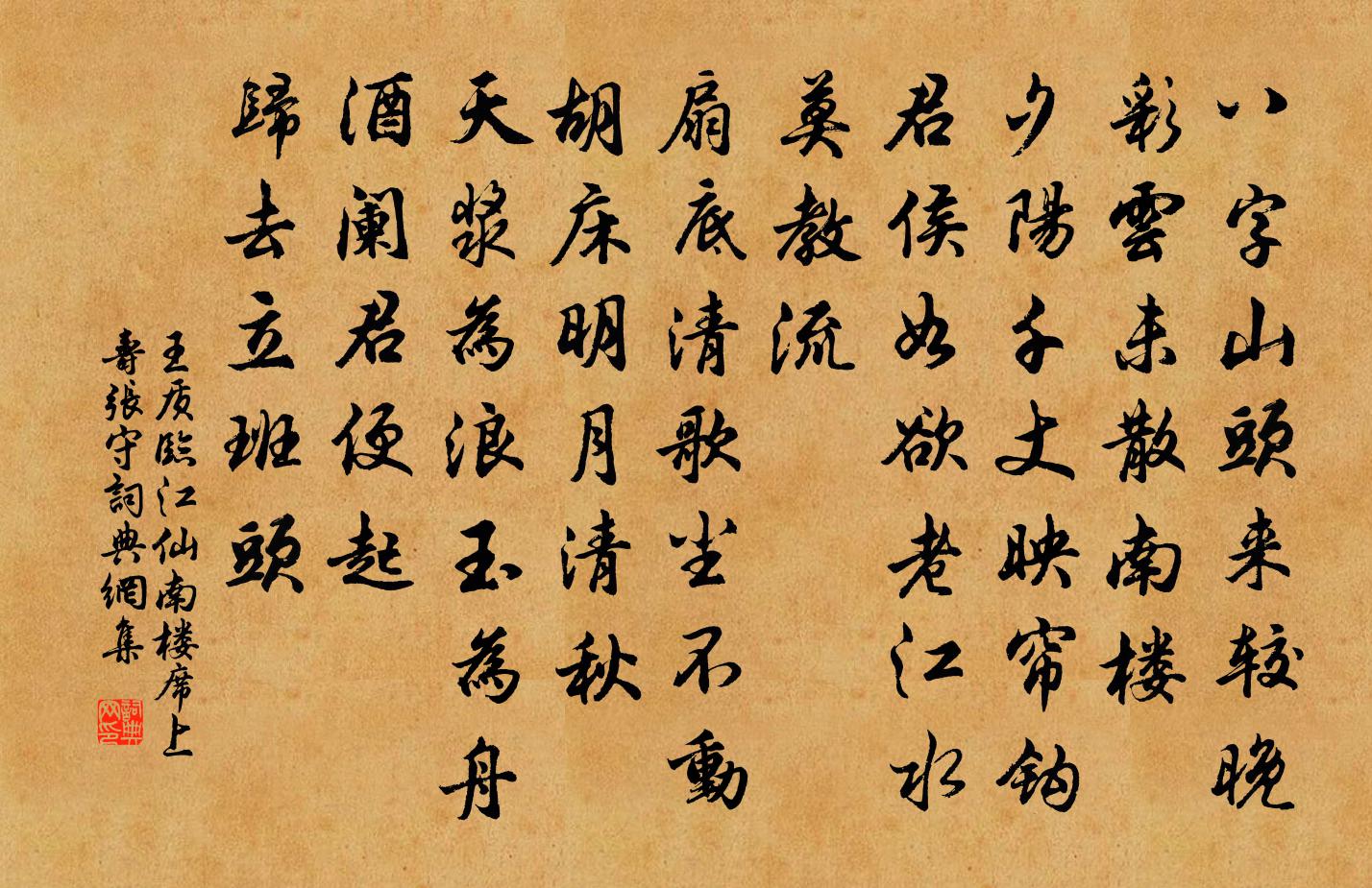 詩詞名句歷史字典書法欣賞書法字典國語詞典說文解字康熙字典古漢語字典標 題 作 者 詩 句 臨江仙(南樓席上壽張守)作者:王質 朝代:宋代臨江仙(南樓席上壽張守)原文八字山頭來較晚,彩雲未散南樓。夕陽千丈映簾鉤。君侯如欲老,江水莫教流。扇底清歌塵不動,胡床明月清秋。天漿為浪玉為舟。酒闌君便起。歸去立班頭。詩詞問答問:臨江仙(南樓席上壽張守)的作者是誰?答:王質問:臨江仙(南樓席上壽張守)寫於哪個朝代?答:宋代問:臨江仙(南樓席上壽張守)是什麼體裁?答:詞王質臨江仙(南樓席上壽張守)書法欣賞臨江仙(南樓席上壽張守)書法作品詩詞推薦孫季章無愧鄭季奕徐斯遠以仆留智門載酒見過趙蕃〔宋代〕黃公亭上雪飛時,去歲相同此賦詩。邂逅出山還雪作,端如來赴去年期。過松江姚鉉〔宋代〕句吳奇勝絕無儔,更見松江八月秋。震澤波光連別派,洞庭山影落中流。汀蘆擁雪藏魚市,岸橘風香趁客舟。冷興村居陸游〔宋代〕鵯鵊穿林語,(左可右鳥)鵝並水鳴。饋漿憐道喝,裹飯助鄰耕。零落橋危斷,欹斜屋半傾。君毋笑偷惰,猶足盡長安道中潘閬〔宋代〕遊子辭鄉早,高堂親已老。燕來不東飛,寄書何日到。依韻和集英殿秋晏梅堯臣〔宋代〕殿幄陳金石,宮梧集鳳凰。侍臣嚴虎帳,法袞被龍章。九穀初登稔,群黎共樂康。宴盤犀作鎮,舞綴錦成行。玉碗從軍行二首(一作擬古)虞世南〔唐代〕塗山烽候驚,弭節度龍城。冀馬樓蘭將,燕犀上谷兵。劍寒花不落,弓曉月逾明。凜凜嚴霜節,冰壯黃河絕。蔽日卜運算元朱敦儒〔宋代〕灼灼一枝桃,粉艷天然好。只被春風擺撼多,顏色凋零早。結子未為遲,悔恨隨芳草。不下山來不出溪,待守劉郎自槜李至毗陵道中楊冠卿〔宋代〕滿目江山無限情,夫差城郭暮雲平。當時不競黃池長,一再何由致越兵。贈呂三校書元稹〔唐代〕同年同拜校書郎,觸處潛行爛熳狂。共占花園爭趙辟,競添錢貫定秋娘。七年浮世皆經眼,八月閒宵忽並床。語到南歌子張元乾〔宋代〕桂魄分餘暈,檀香破紫心。高鬟松綰鬢雲侵。又被蘭膏香染、色沈沈。指印纖纖粉,釵橫隱隱金。更闌雲雨鳳帷深偈頌三十八首釋如淨〔宋代〕元正啟祚,鼻孔發露。萬物鹹新,笑面迎春。淨慈門下轉風流,飯滿缽盂茶滿甌。東歸留別幕中同舍孫應時〔宋代〕元佑賢子孫,忠肅家第一。豈惟富文雅,清苦用一律。君看我同年,踐履極真實。不待問著龜,公侯掛可必。句釋惠崇〔宋代〕鎖城山月上,吹角海鷗驚。放歌行李鹹用〔唐代〕蠢蠢荼蓼蟲,薨薨避葵薺。悠悠狷者心,寂寂厭清世。如何不食甘,命合苦其噬。如何不趣時,分合辱其體。至哉夏日宿廣教寺風月清甚思李白敬亭詩有懷有似李彌遜〔宋代〕眾鳥高飛雲去閒,相看只有敬亭山。孤標尚想風塵外,佳句長留天地間。影落金牛撩客恨,手摩玉兔練仙顏。故山喜晴趙蕃〔宋代〕掃除詩癖未能空,從使人譏手病風。事業深虞一無就,壯顏都有幾時紅。埴知客請贊釋妙倫〔宋代〕寒岩其骨,槁木其形。解語非舌,能言非聲。埏埴立於未立,氣質成於未成。自者般伎倆,也有人描模上丹青。送直館高正言轉運荊湖王禹偁〔宋代〕象笏烏紗諫署榮,運輸權重使蠻荊。職分三館圖書貴,地轄重湖水石清。貪吏望風潛解印,逋民知惠自歸耕。官曹白馬金砂洞釋居簡〔宋代〕準擬朝餐洞口霞,更窮泓碧漲桃花。可曾石罅瀦成玉,多是金邊揀得沙。符說有靈尋漢篆,人因鑒止見胡麻。依稀起水陸堂釋普濟〔宋代〕一漚大覺海中興,十趣波濤不暫停。返本還源空覺海,滿堂風月雨初晴。名句推薦投軀報明主,身死為國殤。鮑照《代出自薊北門行》 干將為利,名聞天下,匠以治木,不如斤斧。劉向《說苑·雜言》 想得玉人情,也合思量我。孫光憲《生查子·窗雨阻佳期》 人之生不能無群荀子《荀子·富國》 君子和而不同,小人同而不和。孔子弟子《論語·子路篇》 可憐繡戶侯門女,獨臥青燈古佛旁。曹雪芹《紅樓夢·第五回》 岳王祠畔,楊柳煙鎖古今愁。戴復古《水調歌頭·題李季允侍郎鄂州吞雲樓》 卻愁擁髻向燈前,說不盡、離人話納蘭性德《一絡索·過盡遙山如畫》 鄉國真堪戀,光陰可合輕。白居易《洛橋寒食日作十韻》 解釋春風無限恨,沉香亭北倚闌乾。李白《清平調·其三》