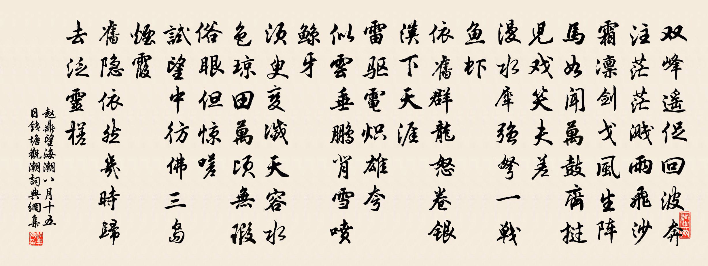 雙峰遙促,回波奔注,茫茫濺雨飛沙。霜凜劍戈,風生陣馬,如聞萬鼓齊撾。