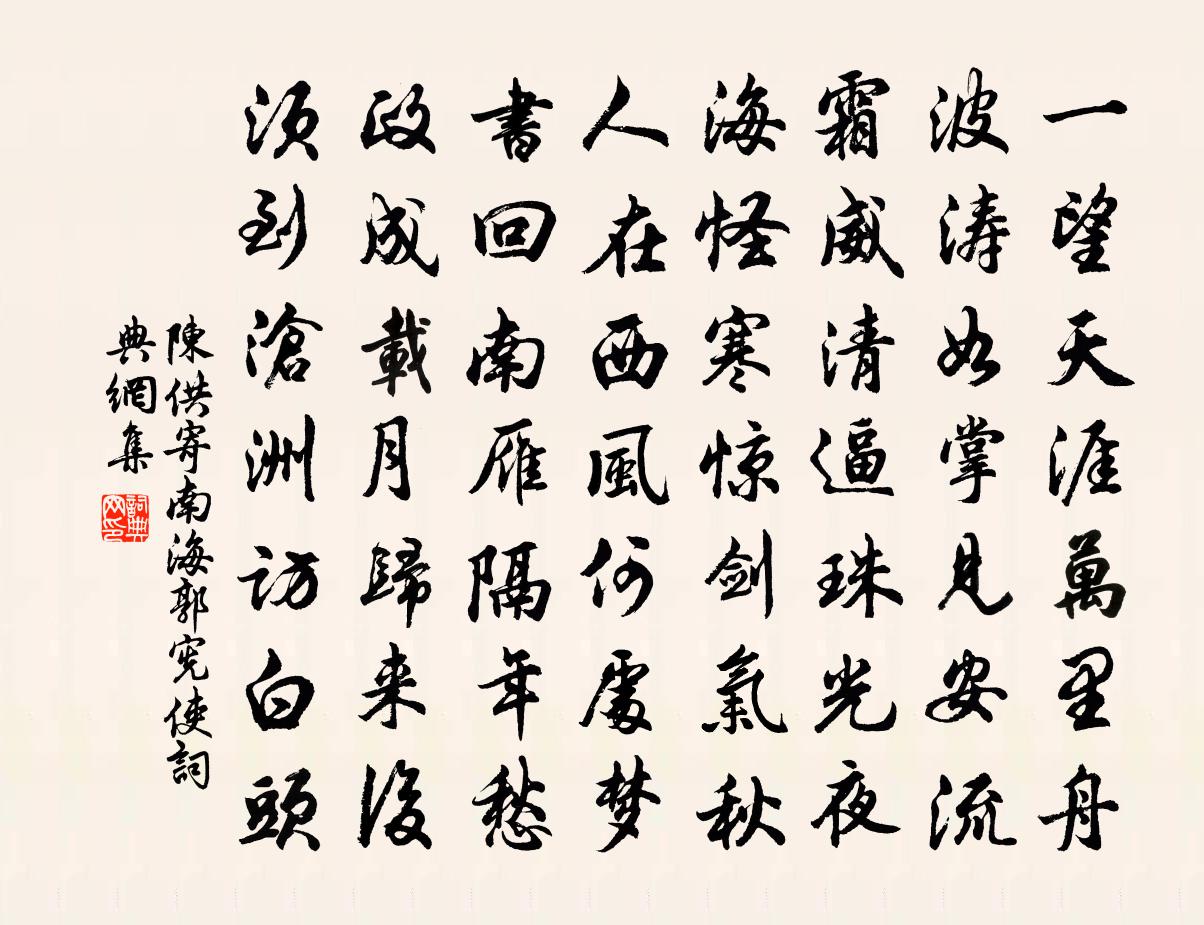 詩詞名句歷史字典書法欣賞書法字典國語詞典說文解字康熙字典古漢語字典標 題 作 者 詩 句 寄南海郭憲使作者:陳供 朝代:宋代寄南海郭憲使原文一望天涯萬里舟,波濤如掌見安流。霜威清逼珠光夜,海怪寒驚劍氣秋。人在西風何處夢,書回南雁隔年愁。政成載月歸來後,須到滄洲訪白頭。詩詞問答問:寄南海郭憲使的作者是誰?答:陳供問:寄南海郭憲使寫於哪個朝代?答:宋代陳供寄南海郭憲使書法欣賞寄南海郭憲使書法作品詩詞推薦偈頌一百五十首釋心月〔宋代〕簇簇上來,卻之不回。簇簇下去,留之不住。於斯立片時,瞬目不揚眉。偈頌二首釋思業〔宋代〕勘破婆子,而青眼黑。趙州老漢,瞞我不得。贈源長老歸自湘中趙師秀〔宋代〕白髮半頭寒未剃,形容清瘦異於常。為人作畫衣添黑,對客圍棋爪甚長。不染世間如菡萏,只留胸次著瀟湘。住山南溪之南竹林中新構一茅堂予以其所處最為深蘇軾〔宋代〕猶恨溪堂淺,更穿修竹林。高人不畏虎,避世已無心。隱几頹如病,忘言兀以喑。茅茨追上古,冠蓋謝當今。曉夢和韓蕺山見贈絕句杜范〔宋代〕世綱纏身未得歸,但勞清夢到林扉。高人誤作班行看,只是山中一布衣。送陳幼度運乾戴復古〔宋代〕台幕三年最,雲霄萬里程。西山餞行色,南浦棹新晴。骨秀荊山璞,胸涵元氣英。更攜扛鼎筆,只合上蓬瀛。仲秋過盧北山子俞嘗新醞作陳藻〔宋代〕白秫新收釀得紅,洗鍋吹火煮油蔥。莫嫌傾出清和濁,勝是嘗來辣且濃。離夜二首馬戴〔唐代〕東征遼水迥,北近單于台。戎衣掛寶劍,玉箸銜金杯。紅燭暗將滅,翠蛾終不開。凝夜照離色,恐聞啼晚鴉。前年說詩方回〔宋代〕齒髮侵尋落,風霜取次秋。口須湔乳臭,川合向東流。沈宋中嘗悔,江湖晚更羞。此聲專老杜,猶俟到夔州。簡隱居陳公儔伯英曾豐〔宋代〕士人臭味自薰蘭,一度相逢一破顏。隨牒抗塵吾著急,弄花踏月子偷閒。熟眠無夢到槐國,倦醉有人扶玉山。李杜題嚴子陵釣台姚勉〔宋代〕封了全燕不復臣,友朋從此廢天倫。子陵不為光皇屈,要識君王有故人。句陳亞〔宋代〕如僧清早廚邊過,偷卻黃興料里蹄。送鄉人余文明勸之以歸楊萬里〔宋代〕一別高人又十年,霜筋雪骨健依然。席門未害車多轍,斗酒尚能詩百篇。蒼狗白衣俱昨夢,長庚孤月自青天。故山玉樓春歐陽修〔宋代〕陰陰樹色籠晴晝。清淡園林春過後。杏腮輕粉日催紅,池面綠羅風卷皺。佳人向晚新妝就。圓膩歌喉珠欲溜。當筵素冠佚名〔先秦〕庶見素冠兮?棘人欒欒兮,勞心摶摶兮。庶見素衣兮?我心傷悲兮,聊與子同歸兮。庶見素韠兮?我心蘊結兮,聊春夕聞雁宋庠〔宋代〕春夕坐神皋,天長北雁號。來思擊書足,去羨順風毛。瑞鵠天淵暖,啼鳥禁樹高。夫君自江海,避弋莫為勞。三老堂秦觀〔宋代〕堂堂三元老,業履冠儔匹。蹇諤橫秋霜,高明麗朝日。並道謁溫宣,連科收甲乙。東南奠藩服,西北馳使驛。解鞅恩賜樂遊園宴應制張九齡〔唐代〕寶筵延厚命,供帳序群公。形勝宜春接,威儀建禮同。晞陽人似露,解慍物從風。朝慶千齡始,年華二月中。輝光心遠軒王冕〔元代〕淵明賦歸去,寓意在田園。結廬雜人境,喜無車馬喧。秋風菊采采,春風柳娟娟。人跡日已疏,世事日已遷。高臥念奴嬌(符昌研寫寄朱胡梅詞,酬唱語皆不凡,因次其韻)李光〔宋代〕榕林葉暗,見一枝獨放,霜華爭白。寫我精神惟賴有,蕭灑西湖詞客。玉骨清羸,冰容冷落,似恨關山隔。蠻煙侵名句推薦今又重陽,戰地黃花分外香。 * 《採桑子·重陽》 竹外一枝斜,想佳人,天寒日暮。曹組《驀山溪·梅》 故園東望路漫漫,雙袖龍鍾淚不乾。岑參《逢入京使》 是以動則必陷,為則必辱,是偏傷之患也。荀子《荀子·不苟》 君子以遠小人,不惡而嚴。佚名《易傳·象傳下·遯》 不知天外雁,何事樂長征?徐禎卿《在武昌作》 日長籬落無人過,惟有蜻蜓蛺蝶飛。范成大《四時田園雜興·其二》 青春幾何時,黃鳥鳴不歇。李白《江南春懷》 文人之筆,勸善懲惡也。王充《論衡·卷二十·佚文篇》 狐死首丘,代馬依風。范曄《後漢書·列傳·班梁列傳》