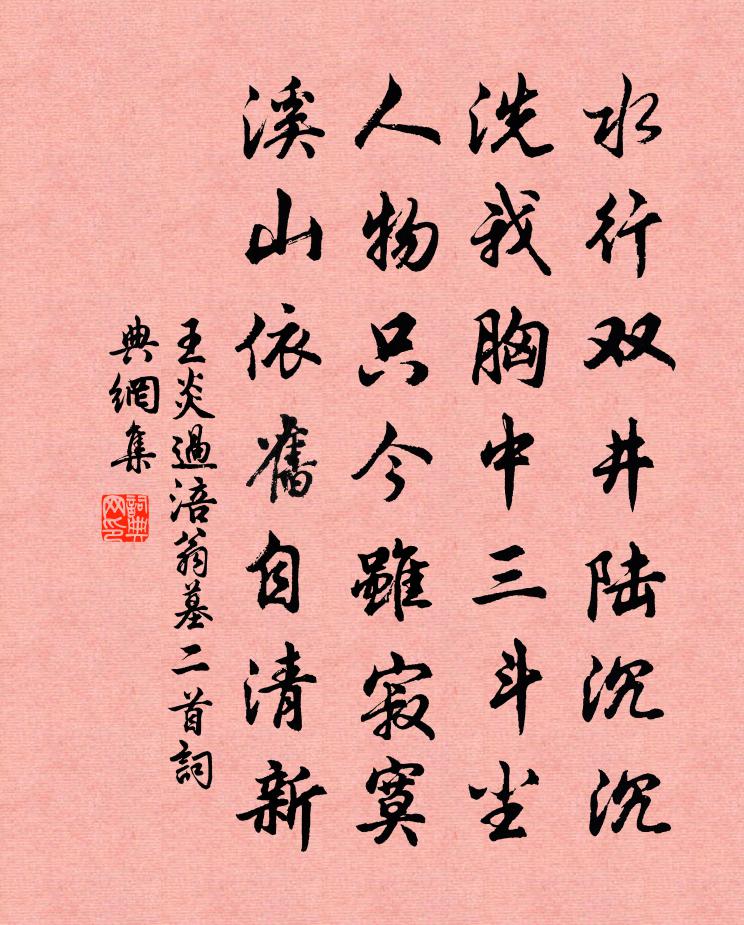 詩詞名句歷史字典書法欣賞書法字典國語詞典說文解字康熙字典古漢語字典標 題 作 者 詩 句 過涪翁墓二首作者:王炎 朝代:宋代過涪翁墓二首原文水行雙井陸沉沉,洗我胸中三斗塵。人物只今雖寂寞,溪山依舊自清新。詩詞問答問:過涪翁墓二首的作者是誰?答:王炎問:過涪翁墓二首寫於哪個朝代?答:宋代王炎過涪翁墓二首書法欣賞過涪翁墓二首書法作品詩詞推薦題傅侍郎寒碧十五韻淨涼陳宓〔宋代〕何物擢仙質,天然契吾性。不染濁水泥,明月水中映。只許此君看,風清雨娟淨。送趙子固吏部帥合肥樓鑰〔宋代〕老韓同傳我多慙,意氣相傾自不凡。憂患飽更俱白髮,班行獨立見青山。羨君真有虎頭相,顧我方為馬口銜。同舍和微之十七與君別及隴月花枝之詠白居易〔唐代〕別時十七今頭白,惱亂君心三十年。垂老休吟花月句,恐君更結後身緣。次韻蘇主管青溪十絕句項安世〔宋代〕與君相別若耶溪,十載湘航與蜀梯。恰到六朝行樂處,台城東畔冶亭西。八月十五日夜玩月劉禹錫〔唐代〕天將今夜月,一遍洗寰瀛。暑退九霄淨,秋澄萬景清。星辰讓光彩,風露發晶英。能變人間世,翛然是玉京。南鄉子·冬夜黃升〔宋代〕萬籟寂無聲。衾鐵稜稜近五更。香斷燈昏吟未穩,淒清。只有霜華伴月明。應是夜寒凝。惱得梅花睡不成。我念梅偈頌一百六十首釋宗杲〔宋代〕觀音妙智力,能救世間苦。百華開爛漫,覷見沒可睹。仙跡岩題詩二十三首采芝術即事佚名〔宋代〕仙芝靈術總芳妍,野草閒花各變遷。古櫟復榮鬆化石,藥苗蕃植可延年。菩薩蠻蔡伸〔宋代〕杏花零落清明雨。捲簾雙燕來還去。枕上玉芙蓉。暖香堆錦紅。翠翹金鈿雀。蟬鬢慵疏掠。心事一春閒。黛眉顰遠和張孟阜歲旦韻陳傅良〔宋代〕白髮朝看鏡,青燈夜數更。文章輸善宦,名字誤浮生。廢學兒鼾睡,安貧婦饁耕。從今定逢吉,吾已卜先庚。獻仙桃佚名〔宋代〕元宵嘉會賞春光。盛事當年憶上陽。堯顙喜瞻天北極,舜衣深拱殿中央。歡聲浩蕩連韶曲,和氣氤氳帶御香。壯觀奉酬劉侍郎顧況〔唐代〕幾回新秋影,璧滿蟾又缺。鏡破似傾台,輪斜同覆轍。雖分上林桂,還照滄洲雪。暫伴憔悴人,歸華耿不滅。賦園中所有十首蘇轍〔宋代〕萱草朝始開,呀然黃鵠觜。仰吸日出光,口中爛如綺。纖纖吐須鬣,冉冉隨風哆。朝陽未上軒,粲粲幽閒女。美女行行且遊獵篇孟雲卿〔唐代〕少年多武力,勇氣冠幽州。何以縱心賞,馬啼春草頭。遲遲平原上,狐兔奔林丘。猛虎忽前逝,俊鷹連下鞲。俯身怪夢十首方回〔宋代〕身謀曾不暇,何況子孫謀。我老宜多病,痴人豈識愁。管窺天謂小,繩挽日難留。將騎言何猥,蒼茫下白樓。松江司馬光〔宋代〕吳山黯黯江水清,欲雨未雨傷交情。扁舟蕩漾泊何處,紅蓼白苹相映生。崇山圖七賢詩張嵲〔宋代〕題輿意匠崇崖圖,魯侯為賦溪隱詩。長松短壑歷可數,坐使妙境移於斯。地靈神秀天所秘,豺嗥虺伏鬼莫窺。芟蓬樓丁謂〔宋代〕幾集元規會,曾留子建題。東南當日出,西北與雲齊。帝里五百尺,仙家十二梯。 * 多感激,丹鳳竟相攜。靈雲池送從弟王維〔唐代〕金杯緩酌清歌轉,畫舸輕移 * 回。自嘆鶺鴒臨水別,不同鴻雁向池來。海濱石根莖而生類於芝者俗呼為石花已為作記鄭剛中〔宋代〕幻化無窮,天巧難覷。諸香妙華,種種呈露。都隨春來,亦隨春去。繽紛顛倒,與空同處。此華希有,周流四序。名句推薦君子不自大其事,不自尚其功戴聖《禮記·表記》 雄關漫道真如鐵,而今邁步從頭越。 * 《憶秦娥·婁山關》 竹塢無塵水檻清,相思迢遞隔重城。李商隱《宿駱氏亭寄懷崔雍崔袞》 已訴徵求貧到骨,正思戎馬淚盈巾。杜甫《又呈吳郎》 津橋春水浸紅霞,煙柳風絲拂岸斜。雍陶《天津橋望春》 歸夢寄吳檣。水驛江程去路長。陸游《南鄉子·歸夢寄吳檣》 凡與敵戰,若陷在危亡之地,當激勵將士決死而戰,不可懷生,則勝。佚名《百戰奇略·第五卷·危戰》 聞道皇華使,方隨皂蓋臣。王維《送李判官赴東江》 一葉度春風,芳芳自相接。蕭衍《芳樹》 一笛當樓,謝娘懸淚立風前史達祖《玉蝴蝶·晚雨未摧宮樹》