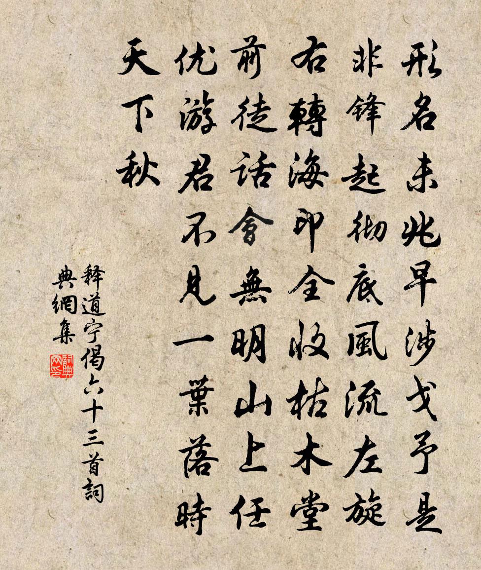 詩詞名句歷史字典書法欣賞書法字典國語詞典說文解字康熙字典古漢語字典標 題 作 者 詩 句 偈六十三首作者:釋道寧 朝代:宋代偈六十三首原文形名未兆,早涉戈予。是非鋒起,徹底風流。左旋右轉,海印全收。枯木堂前,徒話會無。明山上,任優遊,君不見,一葉落時天下秋。詩詞問答問:偈六十三首的作者是誰?答:釋道寧問:偈六十三首寫於哪個朝代?答:宋代釋道寧偈六十三首書法欣賞偈六十三首書法作品詩詞推薦【越調】天淨沙_昨朝楊柳依張養浩〔元代〕昨朝楊柳依依,今朝雨雪霏霏,社燕秋鴻忒疾。若不是濁醪有味,怎消磨這日月東西。年時尚覺平安,今年陡恁衰得瑞香於四明曾幾〔宋代〕錦樹轉欒海角州,移春檻里見風流。兩三翠蓋張前面,千百香囊綴上頭。絕代紅梅相對好,妒人山麝莫來休。衰翁大人先生傳阮籍〔魏晉〕 大人先生蓋老人也,不知姓字。陳天地之始,言神農黃帝之事,昭然也;莫知其生年之數。嘗居蘇門之山,故湖北驛中偶成馬祖常〔元代〕江田稻花露始零,浦中蓮子青復青。楚船祠龍來買酒,十幅蒲帆上洞庭。羅衣薰香錢滿篋,身是揚州販鹽客。明年送廣東趙主管得倅臨漳二首曾豐〔宋代〕有偉今丞相,猶虧□令君。全材拔半刺,白髮擁紅裙。何處分風月,無時上水雲。莫將車騎去,驚動白鷗群。和范蜀公題蜀中花圖韓絳〔宋代〕徑尺千餘朵,矜誇古復今。錦城春物異,粉面瑞雲深。賞愛難忘酒,珍奇不費金。應知色空理,夢幻即歡心。和吳伯承提宮孟冬風雨楊萬里〔宋代〕舊雨新更寒,晝歇夜復隕。我行十日泥,屨跡故未泯。吟聲正酸苦,已似琴促軫。更遭雪作祟,不由弦不緊。與公賀新郎(再韻賦雪)劉學箕〔宋代〕曉聽兒曹說。道前村、疏梅莫與,蔽蕭纏葛。急與呼童誅翦盡,趁此江天暮雪。喚小艇、漁翁鶴髮,凜冽寒風吹酒醉花陰(越州席上官妓獻梅花)舒亶〔宋代〕月幌風簾香一陣。正千山雪盡。冷對酒尊傍,無語含情,別是江南信。壽陽妝罷人微困。更玉釵斜襯。擬插一枝歸送伯氏入都黃庭堅〔宋代〕貧賤難安處,別離更增悲。經營動北征,慈母待春衣。短菙驅瘦馬,青草牧中嘶。送行不知遠,可忍獨歸時。太華廄馬夏竦〔宋代〕萬里無塵塞草秋,玉輪金軛未巡遊。上林苜蓿天池水,館食長鳴可自羞。七里灘四錫〔宋代〕清泚寒流走白沙,釣台蒼翠遠嵯峨。隔谿人語穿芳樹,旁岸魚跳落淺莎。幾處上源堪涉渡,有時野艇並來過。秋聲生查子洪适〔宋代〕七月到盤洲,枕簟新涼早。岸曲側黃葵,沙際排紅蓼。團團歌扇疏,整整爐煙裊。環坐待橫參,要乞珠絲巧。秋日小雨後作宋庠〔宋代〕晚陌收殘雨,高軒冒夕霏。風乾移舊鄉,月破隱空圍。敗葉相將舞,寒雲不肯飛。興無潘掾筆,何術寫心微。送胥裴二子回馬上作梅堯臣〔宋代〕陰陰雪雲低,遊子去將懶。豈惟遊子倦,疲馬行亦款。送罷我獨還,回看鴈為伴。念此日暮時,寂寞閉竹館。悼達兼善平章王冕〔元代〕出師未捷身先死,忠義如公更不多。豈直文章驚宇宙?尚餘威武振山河。中原正想劉安世,南海空思馬伏波。老我雪施樞〔宋代〕只消頃刻便漫漫,人亦求窺造化難。柳外情知非絮落,梅邊誤作有花看。朱門合席持杯暖,紫塞分屯坐甲寒。慨想方壺自詠汪莘〔宋代〕性靜無一物,心生有萬端。曾將魂魄練,不被鬼神瞞。縱步地雖窄,仰頭天自寬。裁詩偏得偶,遇卦只成單。重過秘書舊房,因題長句白居易〔唐代〕閣前下馬思裴回,第二房門手自開,昔為白面書郎去,今作蒼須贊善來。吏人不識多新補,松竹相親是舊栽。應有用功成韻賦外舅短項翁耿鎡〔宋代〕君不見王績非狂生,筆墨雪盡惟酒經。又不見志和非漫尉,江湖醉詠漁歌耳。文章得失兩夢事,一醉從渠俱不理。名句推薦半畝方塘一鑒開,天光雲影共徘徊。朱熹《活水亭觀書有感二首·其一》 唯有相思似春色,江南江北送君歸。王維《送沈子歸江東 / 送沈子福之江東》 英雄一去豪華盡,惟有青山似洛中。許渾《金陵懷古》 自奉必須儉約,宴客切勿流連。朱柏廬《朱子家訓·全文》 位卑未敢忘憂國,事定猶須待闔棺。陸游《病起書懷》 黃師塔前江水東,春光懶困倚微風。杜甫《江畔獨步尋花·其五》 狂風吹我心,西掛鹹陽樹。李白《金鄉送韋八之西京》 修己而不責人左丘明《左傳·閔公·閔公二年》 慘慘柴門風雪夜,此時有子不如無。黃景仁《別老母》 舍心腹而順手足羅貫中《三國演義·第二十三回》