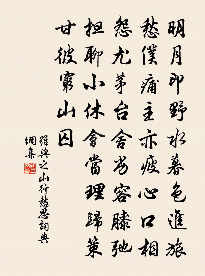 詩詞名句歷史字典書法欣賞書法字典國語詞典說文解字康熙字典古漢語字典標 題 作 者 詩 句 山行愁思作者:羅與之 朝代:宋代山行愁思原文明月印野水,暮色進旅愁。仆痡主亦疲,心口相怨尤。茅台舍劣容膝,弛擔聊小休。會當理歸策,甘彼窮山囚。詩詞問答問:山行愁思的作者是誰?答:羅與之問:山行愁思寫於哪個朝代?答:宋代羅與之山行愁思書法欣賞山行愁思書法作品詩詞推薦橫橋觀薺陳著〔宋代〕物理元隨世事新,靜觀知是泮宮人。穿花野薺雖微草,也占年年一分春。孟倉曹步趾領新酒醬二物滿器見遺老夫杜甫〔唐代〕楚岸通秋屐,胡床面夕畦。藉糟分汁滓,瓮醬落提攜。飯糲添香味,朋來有醉泥。理生那免俗,方法報山妻。贈儀真密禪師鄭獬〔宋代〕渾淪老學佛,到處說支郎。斷臂求諸法,浮杯遍十方。自栽雙柏樹,獨坐一繩床。惟有林間客,時來扣竹房。再出東郊范成大〔宋代〕晚景增年慣,官身作客諳。大都緣偶熟,豈是性能堪?昔者開三徑,他時老一龕。越溪親種竹,芸綠想毿毿。水調歌頭(次瓊山韻)佚名〔宋代〕足跡半天下,家說在瓊川。往來無定,蓬頭垢面仟憎嫌。揮掃筆頭萬字,貫穿胸中千古,不記受生年。海角一相遇次韻劉景文登鄭王台見思五首黃庭堅〔宋代〕舊時劉子政,憔悴鄴王城。把筆已頭白,見書猶眼明。平原秋樹色,沙麓暮鐘聲。歸雁南飛盡,無因寄此情。夜過魯墟陸游〔宋代〕中夜過魯墟,船底鳴細浪。月出菱歌長,林闇績火壯。故居不可識,四顧但青嶂。百年幾廢興,撫事一悽愴。士生故國有懷呈任子宏提舉黃庚〔宋代〕十年不作還家夢,荒草深深鎖行扉。無主落花隨水去,有情滂鳥勸人歸。儒冠寥落風流減,客路淒涼故舊稀。何日挽曾原伯大卿孫應時〔宋代〕群獻餘端緒,中原故典刑。風霜催短日,河漢獨晨星。悽惻丹心在,蕭條世路丁。天高那可問,揮淚濕青冥。彈秋思白居易〔唐代〕信意閒彈秋思時,調清聲直韻疏遲。近來漸喜無人聽,琴格高低心自知。與晦庵先生同宿清虛庵梁平叔〔宋代〕幽齋共坐論功夫,借問先生識此無。悟得此中真妙訣,人間始信有仙壺。用前韻寄吳知府廣德歸釋寶曇〔宋代〕好風吹夢到祠山,造物乾忙我自閒。五日頌聲今故在,一春詩債共誰還。鼠肝蟲臂窺前輩,蝸角蠅頭戰百蠻。遙指偶成俞桂〔宋代〕短髮蕭蕭滿鏡秋,家居但覺歲時流。兩年不見西湖面,笑我寒盟是白鷗。壽程使君和獲白雁詩韻程公許〔宋代〕流膏千里喧笑聲,祥心萬丈 * 。祈年未了香火債,饌客肯污刀鑊腥。此心與民同疴癢,出令可忍奔風霆。仙人蕃丙午冬分宜見公度簿公尊兄已而邂逅於宜春趙蕃〔宋代〕繚繞竹青沙白,緣情政可生愁。寂寞雁秋猿冷,未妨相與成游。鹹通韋莊〔唐代〕鹹通時代物情奢,歡殺金張許史家。破產競留天上樂,鑄山爭買洞中花。諸郎宴罷銀燈合,仙子游回璧月斜。人意馬上見賣白蓮者三首陳造〔宋代〕東盪花清晨,西湖渺無津。涼荷引天遠,極目妝面新。鳴榔與鼓枻,彼豈尋芳人。香風漂我舟,領略不及賓。當時題寒光雪嶂圖陳造〔宋代〕噎寒流覆絕壁,君才得想像間。輸我一庵漁浦,雪中真看江山。入東林寺董嗣杲〔宋代〕晴向過溪亭下留,拂碑慨想晉時流。雲生古樹蔦蘿雨,風卷修廊松竹秋。登閣冷知山撲面,照池涼覺水澄眸。捻香交河塞下曲胡曾〔唐代〕交河冰薄日遲遲,漢將思家感別離。塞北草生蘇武泣,隴西雲起李陵悲。曉侵雉堞烏先覺,春入關山雁獨知。何處名句推薦金樽清酒斗十千,玉盤珍羞直萬錢。李白《行路難·其一》 不蹶于山,而蹶於垤,則細微宜防也。王永彬《圍爐夜話·第五二則》 平蕪盡處是春山,行人更在春山外。歐陽修《踏莎行·候館梅殘》 貴富而不知道,適足以為患,不如貧賤。呂不韋《呂氏春秋·紀·孟春紀》 海燕歲微渺,乘春亦暫來。張九齡《歸燕詩》 下馬飲君酒,問君何所之?王維《送別》 施惠勿念,受恩莫忘。朱柏廬《朱子家訓·全文》 知莫大乎棄疑,行莫大乎無過,事莫大乎無悔。荀子《荀子·議兵》 不鳴則已,一鳴驚人。司馬遷《滑稽列傳》 夜吟敲落霜紅,船傍楓橋系。吳文英《荔枝香近·送人游南徐》