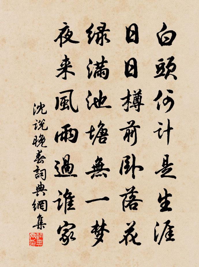 詩詞名句歷史字典書法欣賞書法字典國語詞典說文解字康熙字典古漢語字典標 題 作 者 詩 句 晚春作者:沈說 朝代:宋代晚春原文白頭何計是生涯,日日樽前臥落花。綠滿池塘無一夢,夜來風雨過誰家。詩詞問答問:晚春的作者是誰?答:沈說問:晚春寫於哪個朝代?答:宋代沈說晚春書法欣賞晚春書法作品詩詞推薦田間辭三首崔敦禮〔宋代〕朝余往兮蒼東疇,景翳翳兮雲油油。牛驅耕兮載泥重,鞭不前兮挽犁用。歲雲暮兮暮維何,倉庚鳴兮布穀和。疾吾廳前柳(丹桂)趙師俠〔宋代〕景清佳。正倦客,凝秋思。浩無涯。遞十里香芬馥,桂初華。向碧葉。露芳葩。為粟粒、鵝兒情淡薄,倩西風染就怨歌行沈約〔南北朝〕時屯寧易犯。俗險信難羣。坎壇元淑賦。頓挫敬通文。遽淪班姬寵。夙窆賈生墳。短俗同如此。長嘆何足雲。九折岩張聲道〔宋代〕池繞九岩邊,鴛鴦自在眠。圓荷浮簇簇,翠葆靜涓涓。沾足三春雨,清和四月天。庭空無一事,真樂付詩篇。舞雩台李堪〔宋代〕舞雩台上春風起,魯國先生講始開。欲解陶潛印歸去,心思吾道重徘徊。送趙德莊右司赴江東漕八首曾協〔宋代〕飽學兼內外,超然悟空無。是身任東西,乾坤一蘧廬。目前謾紛紜,一致總萬殊。良欲行世間,不效山澤癯。道院雜興陸游〔宋代〕早歲知聞久已空,巋然猶有灞城翁。東樓誰記傾春碧,北嶺空思擘晚紅。冉冉流年霜鬢外,累累荒冢綠蕪中。琳房題范寬秋山小景樓鑰〔宋代〕山高最難圖,意足不待大。尺楮眇千里,長江浸橫翠。畫家雜雲煙,戃怳徒意會。苟或森三尺,便若俗子對。此畫黃幾道郎中同年輓詞二首蘇轍〔宋代〕早歲相從能幾時,淮陽花發正游嬉。鳴弓矍相人如堵,席地滄浪柳作帷。十載舊遊真是夢,一時佳客尚存誰。遙聞七字敬餞周彥敷府判直閣之官虎城楊萬里〔宋代〕碧落仙人出作州,青原詩伯佐承流。江山得助催新句,風月平分入勝游。清獻濂溪兩賓主,崆峒章貢再賡酬。舊時齊天樂姚雲文〔宋代〕柳花引過橫塘路,縈迴曲蹊通圃。插槿編籬,挨梅砌石,次第海棠成塢。吟筇獨拄。待尋訪斜橋,水邊窺戶。已約金剛隨機無盡頌結實分主釋印肅〔宋代〕明月卻相容,獨坐大雄峰。三身與四智,妙在一塵中。句劉少逸〔宋代〕波濤海寺秋。廣都世真上人南遊回見訪出群公詩見示丐予一郭印〔宋代〕法象森羅萬,全歸一寸庵。有佛平生礙,無禪底處參。烏玄元自白,荼苦本來甘。前日南遊話,看君作麽談。贈李十四四首王勃〔唐代〕野客思茅宇,山人愛竹林。琴尊唯待處,風月自相尋。風筵調桂軫,月徑引藤杯。直當花院裡,書齋望曉開。南山羅漢贊十六首黃庭堅〔宋代〕大阿羅漢賓度羅,奉持末後如來印。日中一缽千家飯,處處作佛事饒益。以我身心五分香,作光明雲雨大千。取火次韻汪翔甫和西城呂全州見過四首方回〔宋代〕五鼎封君食,千金奉使裝。儻來皆外物,不朽有真香。滿酌聖賢酒,虛爭上下床。細思諸葛事,只合臥南陽。秋日屬疾梅堯臣〔宋代〕體羸易生疾,況乃凌秋陰。微寒薄膚腠,飲藥增衣衾。一日失所治,百骸將不任。當從華氏學,聊欲為戲禽。奉和聖制次瓊岳應制韋濟〔唐代〕陸海披晴雪,千旗獵早陽。岳臨秦路險,河繞漢垣長。行漏通鳷鵲,離宮接建章。都門信宿近,歌舞從周王。送杜侍御純陝西轉運陳師道〔宋代〕饋糧千里古無策,木牛流馬功不極。邊頭數米換黃金,將軍汗馬未伏櫪。黠羌人面作胡語,鳥雀貪生爾如許。熊虎名句推薦篤志而體,君子也。荀子《荀子·修身》 平生不會相思,才會相思,便害相思。徐再思《折桂令·春情》 憶君心似西江水,日夜東流無歇時。魚玄機《江陵愁望寄子安》 置冠服,有定位。勿亂頓,致污穢。李毓秀《弟子規·謹》 狡兔有三窟,僅得免其死耳。劉向《戰國策·齊四·齊人有馮諼者》 瘦雪一痕牆角,青子已妝殘萼。王庭筠《謁金門·雙喜鵲》 春未來時,酒攜不到千岩路。吳文英《點絳唇·越山見梅》 有不忍言之心,必有不忍言之禍。王永彬《圍爐夜話·第一三O則》 佇久河橋欲去,斜陽淚滿。吳文英《三姝媚·過都城舊居有感》 白髮三千丈,緣愁似個長。李白《秋浦歌十七首》