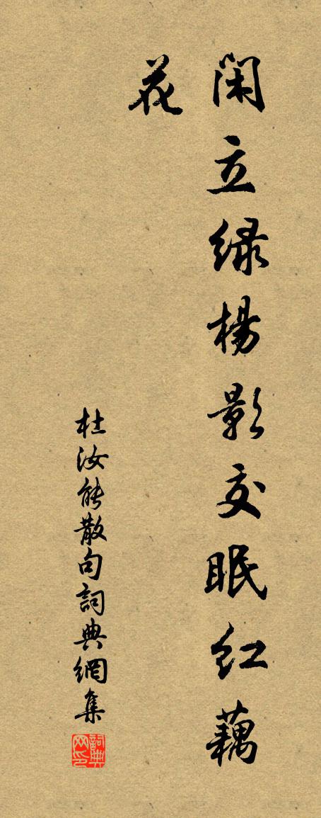 詩詞名句歷史字典書法欣賞書法字典國語詞典說文解字康熙字典古漢語字典標 題 作 者 詩 句 句作者:杜汝能 朝代:宋代句原文閒立綠楊影,交眠紅藕花。詩詞問答問:句的作者是誰?答:杜汝能問:句寫於哪個朝代?答:宋代杜汝能句書法欣賞句書法作品詩詞推薦杭州次周大韻蔡肇〔宋代〕使君詩句益超然,文陣收工是昔年。本是東南遺愛守,聊從岩谷甚臞仙。莫嫌供給難留客,只為湖山已自賢。好請答張籍因以代書白居易〔唐代〕憐君馬瘦衣裘薄,許到江東訪鄙夫。今日正閒天又暖,可能扶病暫來無?和天予孺子亭三首吳芾〔宋代〕我來湖上訪前賢,正值清秋欲暮天。十頃敗荷欹淺水,千章古木鎖寒煙。遍尋陳跡俱亡矣,獨立幽亭只黯然。清德聞微之江陵臥病,以大通中散、碧腴垂雲膏寄白居易〔唐代〕已題一帖紅消散,又封一合碧雲英。憑人寄向江陵去,道路迢迢一月程。未必能治江上瘴,且圖遙慰病中情。到時虎丘新復古石井泉,太守沈虞卿舍人勸農過之范成大〔宋代〕傳聞公作新亭好,先報儂家拄杖知。便擬挈瓶來煮茗,繞闌乾角遍尋詩。悼顧與權夫人鄭剛中〔宋代〕高文司諫筆如椽,肯作夫人識墓篇。但考銘詩無玷闕,自應遺行遠流傳。女無妒色誠希有,士不妨功可並賢。安得次韻子瞻和淵明飲酒二十首蘇轍〔宋代〕明月出東牆,萬物含余姿。孤蟬庇繁蔭,眾鳥栖高枝。解衣適少事,捫腹知亡奇。朝與群動作,莫復何所為。此時春晚寄楊十二,兼呈趙八(時楊生館於趙氏)元稹〔唐代〕蒙蒙竹樹深,簾牖多清陰。避日坐林影,余花委芳襟。傾尊就殘酌,舒捲續微吟。空際颺高蝶,風中聆素琴。廣庭次韻因上人晚菊簡魏定父王之道〔宋代〕道人如青松,孤高不成業。愛此黃金花,蕭然有淳風。新詩皎秋月,警我野性慵。佳意不在酒,此身今醉翁。岩松楊時〔宋代〕婆娑千尺倚岩巔,隱隱虬姿拂遠煙。尤喜地靈泉脈潤,獨愁天闊晝陰偏。孤根礙石盤彌固,直乾凌霜老益堅。臃腫賢者之孝二百四十首王陽林同〔宋代〕禮經稱孝子,不服闇登危。所以九折阪,回車不敢馳。遣吏視諸公塋樹回有感宣獻宋公宋祁〔宋代〕昔去勸明辟,俄歸參大鈞。公孫未及相,諸葛已傷神。名待天淵蔽,文爭日月新。英魂同玉樹,不向土中春。南窗偶書方岳〔宋代〕西風忽悽厲,皎月流素光。客從何方來,蘭佩芙蓉裳。揮琴發哀彈,夜寂山蒼蒼。可人者麴生,挽我無何鄉。醉中六月喜雨三首楊萬里〔宋代〕今年不是雨來慳,不後秧時亦不前。自古浙西長苦澇,近來無澇恰三年。松翁承贊〔唐代〕倚澗臨溪自屈蟠,雪花銷盡蘚花乾。幽枝好折為談柄,入手方知有歲寒。流水羅鄴〔唐代〕漾漾悠悠幾派分,中浮短艇與鷗群。天街帶雨淹芳草,玉洞漂花下白雲。靜稱一竿持處見,急宜孤館覺來聞。隋家立秋夕涼風忽至,炎暑稍消,即事詠懷,寄汴白居易〔唐代〕裊裊檐樹動,好風西南來。紅缸霏微滅,碧幌飄颻開。披襟有餘涼,拂簟無纖埃。但喜煩暑退,不惜光陰催。河秋送杭州使君蘇內相先生某用先生舊詩方丈仙人李廌〔宋代〕周公非汲汲,仲尼豈皇皇。吾道無若人,孰能相維綱。古今異倫軌,英風自相望。下民今喁喁,造物太茫茫。無夢令馬鈺〔元代〕傳語終南道眾。早把良緣勤種。保守氣精神,調攝烏龜赤鳳。赤鳳。赤鳳。化粒金丹高聳。華亭百詠震橋許尚〔宋代〕瓦木明丹堊,初期鎮此方。石樑今欲圮,尤益富蠻商。名句推薦泠泠七弦上,靜聽松風寒。劉長卿《聽彈琴》 無端聽畫角,枕畔紅冰薄。納蘭性德《菩薩蠻·朔風吹散三更雪》 冰,水為之,而寒於水。荀子《勸學》 不得乎親,不可以為人;不順乎親,不可以為子。孟子《孟子·離婁章句上·第二十八節》 晚歲登門最不才,蕭蕭華發映金罍蘇洵《九日和韓魏公》 奸不自招,忠不自辯。奸者禍國,忠者禍身。來俊臣《羅織經·察奸卷第八》 料峭春寒中酒,交加曉夢啼鶯。吳文英《風入松·聽風聽雨過清明》 朝陽不再盛,白日忽西幽。阮籍《詠懷八十二首·其三十二》 香滅繡帷人寂寂,倚檻無言愁思遠。顧敻《玉樓春·柳映玉樓春日晚》 東船西舫悄無言,唯見江心秋月白。白居易《琵琶行 / 琵琶引》