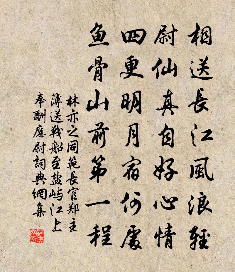 詩詞名句歷史字典書法欣賞書法字典國語詞典說文解字康熙字典古漢語字典標 題 作 者 詩 句 同范長官鄭主簿送戰船至鹽嶼江上奉酬應尉作者:林亦之 朝代:宋代原文相送長江風浪輕,尉仙真自好心情。四更明月宿何處,魚骨山前第一程。詩詞問答問:《同范長官鄭主簿送戰船至鹽嶼江上奉酬應尉》的作者是誰?答:林亦之問:該詩寫於哪個朝代?答:宋代書法欣賞同范長官鄭主簿送戰船至鹽嶼江上奉酬應尉書法作品詩詞推薦滿庭芳(自宛陵易倅東陽,留別諸同寮世事難窮,人生無定偶然蓬轉萍)毛並〔宋代〕世事難窮,人生無定,偶然蓬轉萍浮。為誰教我,從宦到東州。還似翩翩海燕,乘春至、歸及涼秋。回頭笑,渾家道山座主先生平章呂公輓歌辭五首方回〔宋代〕乃公同此老,兩柱共擎天。初作二千石,才生十九年。漢陽□最大,嶺外帥何緣。極恨湖濱相,奸臣喜弄權。奉和魯望四明山九題過雲皮日休〔唐代〕粉洞二十里,當中幽客行。片時迷鹿跡,寸步隔人聲。以杖探虛翠,將襟惹薄明。經時未過得,恐是入層城。送酒與諸葛宰吳芾〔宋代〕由來康濟屬仁人,公更慈仁酷愛民。聞道憂勞添瘦悴,遣愁聊送瓮送春。見山亭釋心月〔宋代〕柳陌花衢爛熳游,不知日月去如流。抬眸忽見家山在,雙手難遮滿面羞。偶成陳著〔宋代〕生計何曾問有無,心安便是邵堯夫。攙春菜奉清饕味,耐凍梅呈本相癯。閉戶茶香浮雪屋,推窗山影落冰壺。終朝滔滔不持戒慧寂〔唐代〕滔滔不持戒,兀兀[1]不坐禪。釅[2]茶三兩椀,意在钁頭[3]邊。表玄師歸縉雲有懷故雄闍黎成轉韻六十四句楊億〔宋代〕栝蒼古名郡,生齒三萬家。我昔自仙殿,捧詔臨軍牙。清心治期月,訟息民無嘩。雄公真大士,宴坐綿幾華。駕言澤卿蘭亭考用工深矣攜攻愧大參詩見訪次韻並黃由〔宋代〕字入照陵不可摹,後來僅及晉之餘。識真盍向龜堂問,敢謂牽聯亦得書。金陵羅公升〔宋代〕江左諸人未易輕,馳驅猶欲致中興。後人只說清談誤,並與清談已不能。水調歌頭(聞子規)吳潛〔宋代〕榆塞脫憂責,蘭徑遂游嬉。吾年逾六望七,休退已稱遲。日日登山臨水,夜夜早眠晏起,豈得不便宜。有酒數杯酒投宿清涼寺賀鑄〔宋代〕建業衣冠集,秦淮舟楫屯。東西萬里客,朝暮兩潮渾。何處契心賞,片時清耳根。僕夫浪見問,但出石城門。蕙花董嗣杲〔宋代〕翠葉層敷楚茝苗,誰將綺石養清標。幽姿晴待光風轉,薰草寒禁艷雪消。一榦數蕤香不足,重栽百畝魄難招。零陵和楊季恪景疏希白二首吳芾〔宋代〕人議居士老來迂,與世依違總不符。雖似子牟懷魏闕,卻同居易學浮屠。鋤荒只欲開三徑,適意寧論泛五湖。胸次水調歌頭曾布〔宋代〕●排遍第一魏豪有憑燕,年少客幽并。擊球鬥雞為戲,遊俠久知名。因避仇、來東郡。元戎留屬中軍。直氣凌貔虎素馨花鄭域〔宋代〕妙香真色得之天,羞御鉛華學女妍。只向溫柔鄉里活,怕寒不許上林傳。矮齋雜詠二十首憶西湖華岳〔宋代〕十年南國嘆徘徊,一片鄉心撥不開。應是西湖花柳問,風流何事未歸來。送范漕赴召崔與之〔宋代〕棋於觀局易,藥到處方難。休戚君眉睫,安危我肺肝。別來年事晚,病起面華寒。東望強人意,天風送健翰。自君之出矣徐照〔宋代〕自君之出矣,玉鑒生塵垢。蓮子種成荷,曷時可成藕。送田倉曹汴州覲省韓翃〔唐代〕拜慶承天寵,朝來辭漢宮。玉杯分湛露,金勒借追風。古驛秋山下,平蕪暮雨中。翩翩魏公子,人看渡關東。名句推薦鳳林關里水東流,白草黃榆六十秋。張籍《涼州詞三首·其三》 芳菲歇。故園目斷傷心切。向子諲《秦樓月·芳菲歇》 浮雲柳絮無根蒂,天地闊遠隨飛揚。韓愈《聽穎師彈琴》 辭君向天姥,拂石臥秋霜。李白《別儲邕之剡中》 夜寒不近流蘇,只憐他、後庭梅瘦。毛滂《上林春令·十一月三十日見雪》 豈曰無衣?與子同袍。佚名《秦風·無衣》 雲物不殊鄉國異,教兒且覆掌中杯。杜甫《小至》 怎不思量,除夢裡、有時曾去趙佶《宴山亭·北行見杏花》 天公見玉女,大笑億千場。李白《短歌行》 大漠西風急,黃榆涼葉飛。田錫《塞上曲》