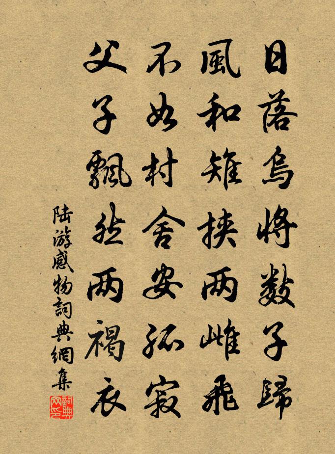 詩詞名句歷史字典書法欣賞書法字典國語詞典說文解字康熙字典古漢語字典標 題 作 者 詩 句 感物作者:陸游 朝代:宋代感物原文日落烏將數子歸,風和雉挾兩雌飛;不如村舍安孤寂,父子飄然兩褐衣。詩詞問答問:感物的作者是誰?答:陸游問:感物寫於哪個朝代?答:宋代問:陸游的名句有哪些?答:陸游名句大全陸游感物書法欣賞感物書法作品詩詞推薦霞隱白玉蟾〔宋代〕仙翁棲紫霞,顏童鬢不華。客來問玄機,笑指菖蒲花。清明連上已穆修〔宋代〕改火清明度,湔衫上已連。芳辰來屬續,游事困聯翩。酒帳經旬直,花司併日權。俠兒狂不足,猶恨促春妍。宿大慈山悟真觀陳允平〔宋代〕終南道士學彈琴,門外松蘿鎖翠陰。瀕海八龍朝出洞,隔山群鹿夜歸林。琪花過雨金風澹,玉樹籠煙璧月沉。三十如夢令·野店幾杯空酒向滈〔宋代〕野店幾杯空酒。醉里兩眉長皺。已自不成眠,那更酒醒時候。知否。知否。直是為他消瘦。太常引 如蘇台觀雪張可久〔元代〕斷塘流水洗凝脂。早起索吟詩。何處覓西施。垂楊柳、蕭蕭鬢絲。銀匙藻井,粉香梅譜,萬瓦玉參差。一曲樂天詞秋日村舍陸游〔宋代〕川雲慘慘欲成雨,宿麥蒼蒼初覆土。芋肥一本可專車,蟹壯兩螫能敵虎。村村婚嫁花簇檐,廟廟禱祠神降語。兒孫呈蔡元德二首王之道〔宋代〕一葉黃梅雨,潺潺過麥秋。昏沉渾似醉,憔悴不禁愁。渠溢門庭淖,園荒草樹稠。乍晴酬絕唱,何幸對風猷。和出省歐陽修〔宋代〕僮奴襆被莫相催,待報霜台御史來。晴陌便當聯騎去,春風任放百花開。文章紙貴爭馳譽,朝野人言慶得才。共向再用前韻重哭德久賢使君張元乾〔宋代〕風撼棠梨對殯宮,中郎談笑孰形容。不居上界神仙府,當在補陀孤絕峰。至論每符磁石鐵,長生空問茯苓松。九原六石峰俞掞〔宋代〕劚石雲邊著著高,幾經吟筆寫風騷。山翁莫袖經綸手,好趁春風釣門鰲。臨江仙辛棄疾〔宋代〕憶醉三山芳樹下,幾層風韻忘懷。黃金顏色五花開。味如廬橘熟。貴似荔枝來。聞道商山餘四老,橘中自釀秋醅。卜運算元(即席奉女兄壽)李處全〔宋代〕芍藥斗新妝,楊柳飛輕雪。著意留連不放春,已向東皇說。況是謫仙家,自有長生訣。方士呼來借玉蟾,要吸杯中卷末偶題三首鄭谷〔唐代〕一卷疏蕪一百篇,名成未敢暫忘筌。何如海日生殘夜,一句能令萬古傳。七歲侍行湖外去,岳陽樓上敢題詩。如今虎川史堯弼〔宋代〕暴虎鬚袒裼,馮河必褰裳。想公川上嘆,誰與共行藏。暮春感懷強至〔宋代〕雨聲日夜催春老,不顧愁人鬢欲華。堂上自來相熟燕,樹間猶有未飛花。詩篇閒里曾無數,酒盞生前亦有涯。傳語千葉水仙花楊萬里〔宋代〕薤葉蔥根兩不差,重蕤風味獨清嘉。薄揉肪玉圍金鈿,淺染鵝黃剩素紗。台琖元非千葉種,丰容要是小蓮花。向來卓錫泉陳鵬飛〔宋代〕披沙覓山泉,不知泉在師錫端。借師錫端卓白石,不見師泉見山錫。須彌芥子不無別,離一離二別胡越。我師胡越減字木蘭花王哲〔元代〕時當五九。道用謫仙三盞酒。采仗風流。為示農耕擊土牛。東君德厚。放盡山梅並岸柳。得得真修。一顆明珠出玉戲鄭曾二老王洋〔宋代〕兩編千片白雪繭,六百二斗青銅錢。不辭破費十日產,要向几上追前賢。前賢已死不可慕,世上流傳只佳句。不尋雜曲歌辭。第六徹佚名〔唐代〕閨燭無人影,羅屏有夢魂。近來音耗絕,終日望君門。名句推薦一日不作,百日不食。司馬遷《史記·三十世家·趙世家》 世風之狡詐多端,到底忠厚人顛撲不破王永彬《圍爐夜話·第 * 則》 恐是仙家好別離,故教迢遞作佳期。李商隱《辛未七夕》 渡頭楊柳青青。枝枝葉葉離情。晏幾道《清平樂·留人不住》 河邊獨自看星宿,夜織天絲難接續。王建《七夕曲》 恭敬不如從命。曹雪芹《紅樓夢·第六十二回》 荊溪白石出,天寒紅葉稀。王維《山中》 誤落塵網中,一去三十年。陶淵明《歸園田居·其一》 嫩寒鎖夢因春冷,芳氣籠人是酒香。曹雪芹《紅樓夢·第五回》 城上春雲覆苑牆,江亭晚色靜年芳。杜甫《曲江對雨》