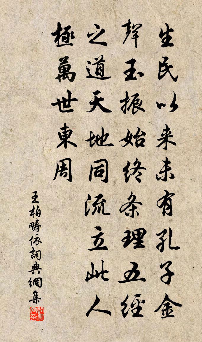 詩詞名句歷史字典書法欣賞書法字典國語詞典說文解字康熙字典古漢語字典標 題 作 者 詩 句 疇依作者:王柏 朝代:宋代疇依原文生民以來,未有孔子。金聲玉振,始終條理。五經之道,天地同流。立此人極,萬世東周。詩詞問答問:疇依的作者是誰?答:王柏問:疇依寫於哪個朝代?答:宋代王柏疇依書法欣賞疇依書法作品詩詞推薦水樂洞傅夢得〔宋代〕踏破芒鞋客倦歸,暮雲深處夕陽西。身如晚鶴無拘束,向此亭中獨自棲。嶺外出巡曾幾〔宋代〕嶺外身逾老,江南首重回。有猿啼夢破,無雁寄書來。山雨晴猶濕,蠻煙晝不開。如何緣許事,奪我手中杯。誚山中叟施肩吾〔唐代〕老人今年八十幾,口中零落殘牙齒。天陰傴僂帶嗽行,猶向岩前種松子。論語絕句一百首張九成〔宋代〕於時窮達何須較,在我行藏未易論。子路不知方慍見,更疑力學到師門。奉和永豐殿下言志詩 九庾信〔南北朝〕崩堤壓故柳。衰社臥寒樗。野鶴能自獵。江鷗解獨漁。漢陰逢荷筱。緇林見杖挐。阮籍長思酒。嵇康懶著書。驀山溪(百花洲席上次韻司錄董庠)葉夢得〔宋代〕一年春事,常恨風和雨。趁取未殘時,醉花前、春應相許。山公倒載,日暮習池回,問東風,春知否,莫道空歸去題魏鵬臥屏賈雲華〔宋代〕柳芳菲二月時後,名園剩有牡丹枝。風流杜牧還知否,莫恨尋春去較遲。西江月楊無咎〔宋代〕沙上鷗群□戲,雲端雁陣斜鋪。殷勤特為故人書。寫盡衷腸情素。名字縱非儔匹,夤緣自合歡娛。盡教塗抹費工夫劉公實母夫人董氏輓詩蔡戡〔宋代〕列寺名卿重,慈闈壽母尊。眼中看五世,膝下擁重孫。九九登遐算,三三達妙門。哀榮極終始,全福更何言。尋真夕對趙崇鉘〔宋代〕春雲弄月黃金絲,春山草木皆仙姿。松根對坐日西夕,群峰當前列青壁。鏗鏗虛壑含古音,靜聽宛是商山吟。洞石孟郡王輓詞二首周必大〔宋代〕炳靈崧岳古諸姜,令德高標對寵光。位冠西樞籌運幄,班高左棘繡為裳。丁年聲譽佳公子,二紀功名異姓王。人物水龍吟·載學士院有之辛棄疾〔宋代〕倚欄看碧成朱,等閒褪了香袍粉。上林高選,匆匆又換,紫雲衣潤。幾許春風,朝薰暮染,為花忙損。笑舊家桃李挽唐伯玉常卿二首劉克莊〔宋代〕身自無安處,昇州更廣州。逐教子方去,死到了翁休。鳳至虞廷喜,麟亡魯野愁。憂時兼悼友,白卻九分頭。以魯直露溼何郎試湯餅為韻賦酴醿七首舒邦佐〔宋代〕石竹麝香臍,博山水沈炷。勾引愛香人,攀花春筍露。瑣窗寒張炎〔宋代〕絕響矣。余悼之玉笥山,所謂長歌之哀,過於痛哭。斷碧分山,空簾剩月,故人天外。香留酒殢。蝴蝶一生花里。某與鮮于綽元勛共約同習制科李廌〔宋代〕趙括痴兒漫喜兵,他年自料困長平。將軍各有萬人敵,下士難先二子鳴。盧駱楊王何足算,江黃六蓼豈勞征。英雄琴曲歌辭。別鶴杜牧〔唐代〕分飛共所從,六翮勢摧風。聲斷碧雲外,影孤明月中。青田歸路遠,月桂舊巢空。矯翼知何處,天涯不可窮。麥飯熟邵定〔宋代〕麥飯熟,兒莫哭,阿爺搗麥麥煮粥。煨一蝦,配麥粥,飽兒腹。去年春梢鋪麥田,馱兒走竄青山顛。歸來破灶無晨南雪胡仲弓〔宋代〕南地無寒脈,胡為雪載塗。草池方積玉,瓦屋又跳珠。魚凍難爭水,鴉飢懶哺雛。玉堂與茅舍,隨分有紅爐。答景毫宣徽吳尚書見寄短偈宋祁〔宋代〕玉帳論兵罷,東方靜守藩。有塵都是客,無法可容言。海鳥逢觴怯,醯雞戀甕喧。因公四句惠,彌覺對酬煩。名句推薦但遠山長,雲山亂,曉山青。蘇軾《行香子·過七里瀨》 倚杖柴門外,臨風聽暮蟬。王維《輞川閒居贈裴秀才迪》 年年陌上生秋草,日日樓中到夕陽。晏幾道《鷓鴣天·醉拍春衫惜舊香》 狡兔死,走狗烹;飛鳥盡,良弓藏;敵國破,謀臣亡。司馬光《資治通鑑·漢紀三》 蕭條清萬里,瀚海寂無波。李白《塞上曲》 寄語天涯客,輕寒底用愁。于謙《除夜太原寒甚》 日暮鄉關何處是?煙波江上使人愁。崔顥《黃鶴樓 / 登黃鶴樓》 高田如樓梯,平田如棋局。楊慎《出郊》 槐陰別院宜清晝,入座春風秀。美人圖子阿誰留。元好問《虞美人·槐陰別院宜清晝》 三姑六婆,實淫盜之媒;婢美妾嬌,非閨房之福。朱柏廬《朱子家訓·全文》