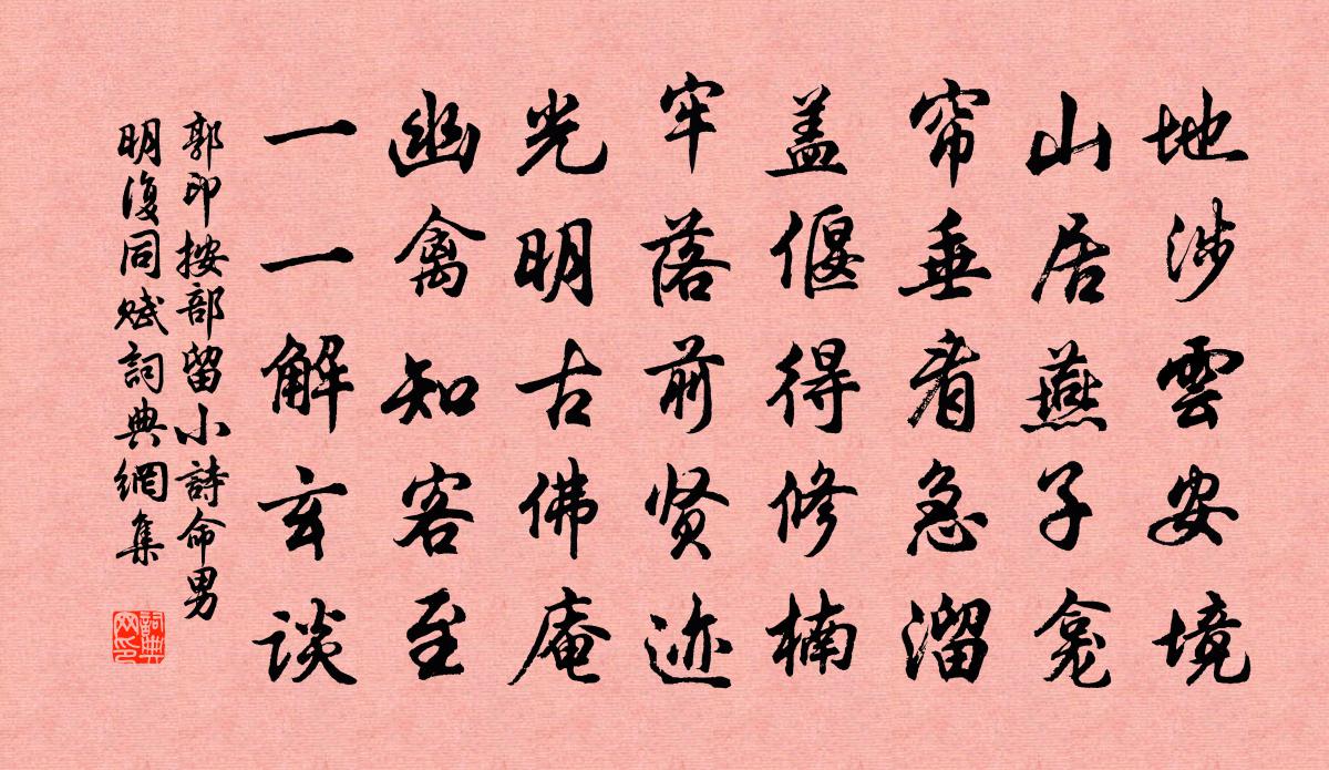 詩詞名句歷史字典書法欣賞書法字典國語詞典說文解字康熙字典古漢語字典標 題 作 者 詩 句 按部留小詩命男明復同賦作者:郭印 朝代:宋代按部留小詩命男明復同賦原文地涉雲安境,山居燕子龕。簾垂看急溜,蓋偃得修楠。牢落前賢跡,光明古佛庵。幽禽知客至,一一解玄談。詩詞問答問:按部留小詩命男明復同賦的作者是誰?答:郭印問:按部留小詩命男明復同賦寫於哪個朝代?答:宋代郭印按部留小詩命男明復同賦書法欣賞按部留小詩命男明復同賦書法作品詩詞推薦次韻徐宰雪句方岳〔宋代〕雪花飛盡江頭蘆,秋崖有屋窗未糊。嗅梅自可了孤寂,燃竹相與留須臾。傳觀玉帝整嚴衛,雜沓環佩紛前驅。夢隨南橋釋紹曇〔宋代〕渡驢渡馬已多時,踏斷何妨入水泥。贍部洲人爭弄險,要渠知有截流機。病癒登疊嶂樓張耒〔宋代〕沉疴幸蕭散,登覽慰無聊。江南春尚早,余雪冒山椒。野梅臨風謝,溪澌映日消。晴林鳥聲樂,幽墅水文搖。新年游江西留別富陽裴、劉二少府孟浩然〔唐代〕西上游江西,臨流恨解攜。千山疊成嶂,萬水瀉為溪。石淺流難溯,藤長險易躋。誰憐問津者,歲晏此中迷。草蟲佚名〔先秦〕喓喓草蟲,趯趯阜螽。未見君子,憂心忡忡。亦既見止,亦既覯止,我心則降。陟彼南山,言采其蕨。未見君子,老衰畏寒晨起婢輩熾炭紅焰滿室身心俱泰喜而姜特立〔宋代〕嚴晨一爐火,愛重如兼金。既已暖我軀,且復豫我心。因思孟東野,曲身長苦吟。何如貴公子,得意椒房深。寓言劉克莊〔宋代〕生有縫春諷,死無封禪書。不須求大手,吾自表幽墟。杜中丞書院新移小竹王建〔唐代〕此地本無竹,遠從山寺移。經年求養法,隔日記澆時。嫩綠卷新葉,殘黃收故枝。色經寒不動,聲與靜相宜。愛護句朱復之〔宋代〕疏竹生孫初上坂,矮松種子欲凌霄。牡丹詩十首宋白〔宋代〕澹黃容止間深檀,妥媠香紅露未乾。和沾似嫌春漸老,向人如說夜來寒。妝成有樣教天媛,禮絕無心下國蘭。針繡春日會飲懷丘思同林成之作四首又次林韻蘇頌〔宋代〕右持卮酒左持螯,慷慨酣歌憶藉糟。因想良交成不寐,清談終夕未為高。留真人東山還詩沈約〔南北朝〕連峯竟無已。積翠遠微微。寥戾野風急。芸黃秋草腓。我來歲雲暮。於此悵懷歸。霜雪方共下。寧止露沾衣。待余散懷陸游〔宋代〕少年已遂遯山林,何況霜毛兩鬢侵。習氣尚存詩入夢,病根未去藥關心。猿知秋近啼先苦,鶴閱年多頂漸深。不忍皇雅十首《庶工》三章尹洙〔宋代〕始時從官,戎容揚揚。今帝左右,儒冠煌煌。朝廷以尊,文物典章。得人之盛,奕世重光。瑤池李商隱〔唐代〕瑤池阿母綺窗開,黃竹歌聲動地哀。八駿日行三萬里,穆王何事不重來。寒食夜白居易〔唐代〕四十九年身老日,一百五夜月明天。抱膝思量何事在?痴男呆女喚鞦韆。自中都歸題勝業寺古柏廖行之〔宋代〕昔聞南山下,有柏古且奇。書痴守寒窗,一見嗟無期。歸從軟紅塵,乃識蒼虬姿。青青十畝蔭,凜凜千年枝。山靈丁卯元日十首劉克莊〔宋代〕禮成雖曰非常慶,聖敬居然不已純。玉女宓妃猶屏欲,先開梅廈訪儒臣。晨興自籬西望東園新開花張耒〔宋代〕東園本是吾家有,不到經旬亦可嗟。步出寢門迎曉日,卻從籬外望新花。安禪豈問荒三徑,閱古終須飽五車。兒女題周氏庵蘇泂〔宋代〕緩步勝騎馬,迷塗問跨牛。蓴絲方擾擾,湖水亦悠悠。解後因成款,淹留卻當游。旁觀君共我,真是兩沙鷗。名句推薦察己則可以知人,察今則可以知古。呂不韋《呂氏春秋·覽·慎大覽》 在天願作比翼鳥,在地願為連理枝。白居易《長恨歌》 當關不報侵晨客,新得佳人字莫愁。李商隱《富平少侯》 日日深杯酒滿,朝朝小圃花開。朱敦儒《西江月·日日深杯酒滿》 歌鐘不盡意,白日落昆明。李白《經亂離後天恩流夜郎憶舊遊書懷贈江夏韋太守良宰》 勞歌一曲解行舟,紅葉青山水急流。許渾《謝亭送別》 御柳如絲映九重,鳳凰窗映繡芙蓉。溫庭筠《楊柳枝》 惶恐灘頭說惶恐,零丁洋里嘆零丁。文天祥《過零丁洋》 九日黃花酒,登高會昔聞。岑參《奉陪封大夫九日登高》 凡傷寒之病,多從風寒得之。始表中風寒,入里則不消矣。張仲景《傷寒論·傷寒例》
