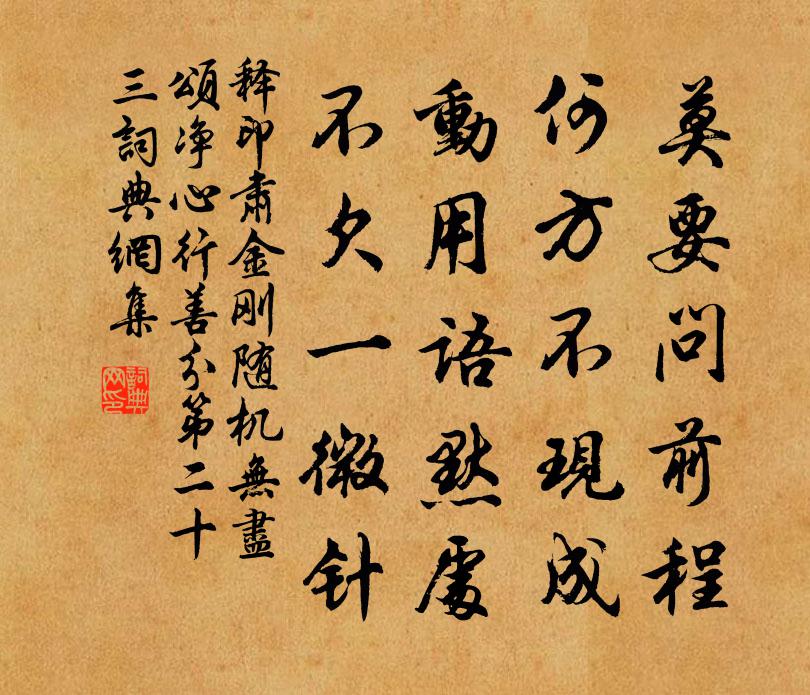 詩詞名句歷史字典書法欣賞書法字典國語詞典說文解字康熙字典古漢語字典標 題 作 者 詩 句 金剛隨機無盡頌淨心行善分第二十三作者:釋印肅 朝代:宋代原文莫要問前程,何方不現成。動用語默處,不欠一微針。詩詞問答問:《金剛隨機無盡頌淨心行善分第二十三》的作者是誰?答:釋印肅問:該詩寫於哪個朝代?答:宋代書法欣賞金剛隨機無盡頌淨心行善分第二十三書法作品詩詞推薦雨後到南山村家徐文卿〔宋代〕沖雨入窮山,山民猶閉關。橘垂茅屋畔,梅映竹籬間。奇石依林立,清泉繞舍灣。吾思隱茲地,凝立未知還。頌古三十八首釋從瑾〔宋代〕大地絕纖塵,面南看北斗。嫁雞逐雞飛,嫁狗逐狗走。病中寄鄭十六兄司空曙〔唐代〕倦枕欲徐行,開簾秋月明。手便筇杖冷,頭喜葛巾輕。綠草前侵水,黃花半上城。虛消此塵景,不見十年兄。次韻張季長紅梅七言三首李壁〔宋代〕雪裡橫枝凍不禁,故將濃麗變輕盈。色分鶴頂真如醉,影借蟾輝也自清。晚覺鄭公殊嫵媚,生憎夷甫太鮮明。上林鷓鴣天元好問〔金代〕內府清虛息萬緣。逍遙真是地行仙。從他玉帶金魚貴,聽我綸巾羽扇偏。傾美醞,祝長年。休辭瀲灩十分圓。來年賀侍郎王其〔宋代〕懸車高蹈姓名香,化得東陽似洛陽。節亞薌林仍峻潔,貌如笠澤更精強。丰標留作耆英樣,壽命應同國祚長。歲歲夏口行寄婺州諸弟韋莊〔唐代〕回頭煙樹各天涯,婺女星邊遠寄家。盡眼楚波連夢澤,滿衣春雪落江花。雙雙得伴爭如雁,一一歸巢卻羨鴉。誰道永遇樂佚名〔宋代〕養水養精,養神養血,先須養氣。日月陰陽,六爻八卦,細看參同契。虛軀虛寶,千言萬語,不過坎離兩字。向昆謝監丞子長雪中四絕喻良能〔宋代〕江邊釣雪翁荷笠,道上行人馬度橋。說與兒童須愛惜,莫貪瓊屑撼長條。寄題鹿伯可見一堂范成大〔宋代〕夢覺春闈俱轉蓬,仙凡今隔玉霄鐵東。聊攀的鎖問何似,豈敢避堂邀蓋公。早行二絕鄭剛中〔宋代〕頳肩攜擔又催程,雨許孤燈照壁青。破縣殘更誤傳曉,馬行十里見明星。程掌書二首程珌〔宋代〕分明如夢縞玄衣,傍月凌風自在飛。夢覺出門都不見,不知已上子陵硯。解湯延祖字李覯〔宋代〕仲尼作經授曾子,明稽至孝之終始。始於事親終立身,以是揚名於後世。大雅有言念爾祖,述脩其德乃為美。聖訓菊秋曉枕偶成衛宗武〔宋代〕希年七十又加零,漸脫塵緣萬事輕。冉冉壯心隨歲減,蕭蕭衰鬢與霜明。愁傾白墮嫌無量,老對黃花更有情。欲寫寄酬楊齊伯少卿陸游〔宋代〕楊卿人材金百鏈,岐公座上初識面。十年萬事不須說,猶喜歸來且強健。題詩想見初削瓜,寄到茆堂已歸燕。辭嚴題二陸祠陳琰〔宋代〕塵暗香殘二陸祠,可憐詞藻妙當時。聯鑣入洛成何事,一段淒涼鶴不知。湖上寓居雜詠 其五姜夔〔宋代〕輦路垂楊兩行裁,苑門秋水欲平階。朝朝南望宮雲起,白鳥一雙山下來。念奴嬌(送李士舉)曹勛〔宋代〕公家世德,建凌煙勳業,中興長策。三十年來,皆帝扆殊選,金甌名跡。眷倚江南,澄清一道,遴柬惟公得。西清江北羅隱〔唐代〕廢宮荒苑莫閒愁,成敗終須要徹頭。一種風流一種死,朝歌爭得似揚州。送惟鳳師之終南釋文兆〔宋代〕終南關內見,寒翠疊空虛。明代誰招隱,深秋自卜居。宵晴吟洞月,日曉飯溪蔬。此後嫌名出,應無入闕書。名句推薦故鄉歸去千里,佳處輒遲留。蘇軾《水調歌頭·安石在東海》 夜聽胡笳折楊柳,教人意氣憶長安。王翰《涼州詞二首》 碧水丹山映杖藜,夕陽猶在小橋西。沈周《題畫》 前村深雪裡,昨夜一枝開。齊己《早梅》 死者不可再生,用法務在寬簡。吳兢《貞觀政要·卷八·論刑法》 棄捐勿復道,努力加餐飯。佚名《行行重行行》 年時俯仰過,功名宜速崇。張華《壯士篇》 智者不倍時而棄利,勇士不怯死而滅名,忠臣不先身而後君。劉向《戰國策·齊六·燕攻齊取七十餘城》 只匆匆眺遠,早覺閒愁掛喬木。史達祖《八歸·秋江帶雨》 況復煩促倦,激烈思時康。杜甫《夏夜嘆》
