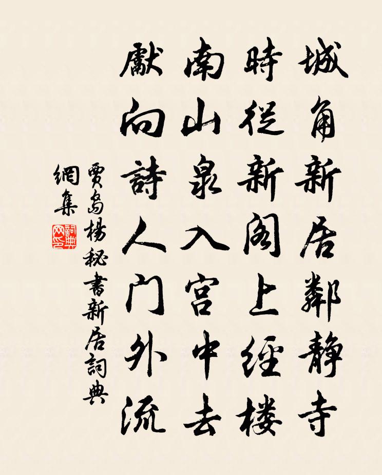 詩詞名句歷史字典書法欣賞書法字典國語詞典說文解字康熙字典古漢語字典標 題 作 者 詩 句 楊秘書新居作者:賈島 朝代:唐代楊秘書新居原文城角新居鄰靜寺,時從新閣上經樓。南山泉入宮中去,先向詩人門外流。詩詞問答問:楊秘書新居的作者是誰?答:賈島問:楊秘書新居寫於哪個朝代?答:唐代問:楊秘書新居是什麼體裁?答:七絕問:賈島的名句有哪些?答:賈島名句大全賈島楊秘書新居書法欣賞楊秘書新居書法作品注釋全唐詩:卷574-71詩詞推薦尚書念舊,垂賜袍衣,率題絕句獻上,以申感謝岑參〔唐代〕富貴情還在,相逢豈間然。綈袍更有贈,猶荷故人憐。哭林山人劉克莊〔宋代〕僵臥茅檐下,怡然八十春。竟無衾覆首,惟有鍾隨身。賻吊稀來客,封崇托外親。自言墳出貴,後必產奇人。七月晦日夜坐曾豐〔宋代〕孟秋俄及晦,甲夜偶成晴。露坐發毛冷,風餐頤頰清。洗湔凡眼豁,抖擻肉身輕。宋玉知何故,悲來不禁情。讀曾景建四詩羅椅〔宋代〕騷客詩翁死有靈,君行亦足慰飄零。甫雲來共長沙醉,原謂何如澤畔醒。一瓣誰堪續香供,四詩今擬當埋名。黃花贈正仲別舒岳祥〔宋代〕一年三過我,此去定經年。雪壓登魚渚,雲生落雁田。壯遊今已矣,老別自潸然。心事有難說,斯文屬子傳。其二贈寫御容妙善師蘇軾〔宋代〕茫茫清泗遶孤岑,歸路相將得暫臨。試著芒鞋穿犖确,更然松炬照幽深。縱令司馬能鑱石,奈有中郎解摸金。強寫光相寺汪元量〔宋代〕峨眉花縣西四十花里,峭壁懸崖削寒翠。崎嶇棧道動搖搖,矮石花同贔屭。忽窺萬仞黑無底,下有龍淵七十二。攀離家作二首楊時〔宋代〕胡雁依朔風,群飛逐南翔。遊子方北征,朔風吹我裳。攬轡望雲間,夜色正蒼蒼。空羨南歸翼,幽懷增感傷。詠苕溪水閣胡仔〔宋代〕三間小閣賈耘老,一首佳沈會宗。無限當時好風月,如今總屬績溪翁。自況謝枋得〔宋代〕手捻琪花吹玉蕭,至人長與道逍遙。黃雲白鶴無拘束,閒看吳兒弄晚潮。詠黃鶯兒鄭愔〔唐代〕欲轉聲猶澀,將飛羽未調。高風不借便,何處得遷喬。俠客胡仲弓〔宋代〕仗劍一長笑,出門游四方。雄心吞宇宙,俠骨耐風霜。豺虎鬚擒攫,狐狸敢頡頏。大梁二壯士,千古姓名香。二十四詩品司空圖〔唐代〕行神如空,行氣如虹,巫峽千尋,走雲連風。飲真茹強,蓄素守中,喻彼行健,是謂存雄。天地與立,神化攸同,蝶戀花·一朵江梅春帶雪趙鼎〔宋代〕長道縣和元彥修梅詞。彥修,錢塘人,名時敏。坐張天覺黨,自戶部員外郎謫監長道之白石鎮。一朵江梅春帶雪。減字木蘭花向子諲〔宋代〕遠弟來自龍舒,張師言寄聲相問,有懷其人青松翠筱。一夜欹傾如醉倒。殘臘能佳。落盡梅花見雪花。詩岩酒島。塞上聞角盛世忠〔宋代〕刁斗城頭夜月寒,一聲嗚咽到江千。梅花吹落渾閒事,白首征人淚暗彈。次韻公權子通唱酬詩四首閶門懷古朱長文〔唐代〕九曲堙淪茂苑荒,吳人誰復怨吳王。莫言故國千秋遠,知是仙家幾日長。湖上只夸浮海相,里中休笑佼顰娘。舊時畫堂春(春日)趙鼎〔宋代〕空籠簾影隔垂楊。夢回芳草池塘。杏花枝上蝶雙雙。春晝初長。強理雲鬟臨照,暗彈粉淚沾裳。自憐容艷惜流光。小遊仙釋行海〔宋代〕青鳥銜書遍海涯,香風不返五雲車。可憐夜夜瑤池月,空照蟠桃一樹花。登臨陸游〔宋代〕盡道羈懷惡,登臨亦解顏。健嫌山路淺。狂恨酒尊慳。親友多疏索,漁樵自往還。有詩仍嬾記,零落水雲間。名句推薦荒戍落黃葉,浩然離故關。溫庭筠《送人東遊》 葉開隨足影,花多助重條。陰鏗《雪裡梅花詩》 落日心猶壯,秋風病欲疏。杜甫《江漢》 江漢思歸客,乾坤一腐儒。杜甫《江漢》 對山河百二,淚盈襟血。王清惠《滿江紅·題南京夷山驛》 遠夢歸侵曉,家書到隔年。杜牧《旅宿》 絮影苹香,春在無人處周晉《點絳唇·訪牟存叟南漪釣隱》 大鵬一日同風起,扶搖直上九萬里。李白《上李邕》 枝枝相糾結,葉葉競飄揚。李白《古意》 家貧則思良妻,國亂則思良相司馬遷《史記·魏世家》