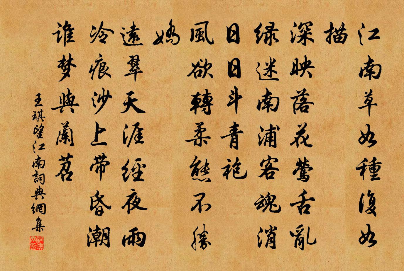 詩詞名句歷史字典書法欣賞書法字典國語詞典說文解字康熙字典古漢語字典標 題 作 者 詩 句 望江南/憶江南作者:王琪 朝代:宋代望江南/憶江南原文江南草,如種復如描。深映落花鶯舌亂,綠迷南浦客魂消。日日斗青袍。風欲轉,柔態不勝嬌。遠翠天涯經夜雨,冷痕沙上帶昏潮。誰夢與蘭苕。詩詞問答問:望江南/憶江南的作者是誰?答:王琪問:望江南/憶江南寫於哪個朝代?答:宋代問:望江南/憶江南是什麼體裁?答:詞王琪望江南/憶江南書法欣賞望江南/憶江南書法作品詩詞推薦感恩多牛嶠〔唐代〕兩條紅粉淚,多少香閨意。強攀桃李枝,斂愁眉。陌上鶯啼蝶舞,柳花飛。柳花飛,願得郎心,憶家還早歸。自從吳子似戴復古〔宋代〕載酒櫻桃熟,隈亭柳樹陰。青山去人遠,黃鳥話春深。薄俗非吾道,虛名愧此心。休言今不古,又恐不如今。簡斯遠兄趙蕃〔宋代〕已辦入城府,尚留緣雨陰。相期著屐過,空想掉頭吟。子故因貧出,余寧嘆老侵。鵷鸞滿台閣,麋鹿自山林。深山逢老僧二首貫休〔唐代〕衲衣線粗心似月,自把短鋤鋤榾柮。青石溪邊踏葉行,數片雲隨兩眉雪。山童貌頑名乞乞,放火燒畬采崖蜜。擔頭自上元後閒作五首張耒〔宋代〕燈火人家夜不收,三更明月過南樓。風煙隨處自能樂,何事客心還獨愁。虞美人趙孟頫〔元代〕池塘處處生春草。芳思紛繚繞。醉中時作短歌行。無奈夕陽、偏旁小窗明。故園荒徑迷行跡。只有山仍碧。及今作偈頌二首釋思業〔宋代〕勘破婆子,而青眼黑。趙州老漢,瞞我不得。頌古十四首釋師體〔宋代〕屈節從長也大拼,雪堆斷臂仰高寒。鐵牛鞭起熊峰下,一吸黃河徹底乾。鷓鴣天周紫芝〔宋代〕年少登高意氣多。黃花壓帽醉嵯峨。如今滿眼看華發,強拈茱萸奈老何。千壘岫,萬重波。一時分付與秦娥。明年羔羊佚名〔先秦〕羔羊之皮,素絲五紽。退食自公,委蛇委蛇。羔羊之革,素絲五緎。委蛇委蛇,自公退食。羔羊之縫,素絲五總。鳳棲梧 宣德州見請,以此詞答之尹志平〔元代〕山後三陽都歷遍。宣德朝元,不晚須相見。數載師前人事倦。區區獨自隨風轉。幾度天長曾發願。糲食粗衣,隔斷雪中聞李儋過門不訪,聊以寄贈韋應物〔唐代〕度門能不訪,冒雪屢西東。已想人如玉,遙憐馬似驄。乍迷金谷路,稍變上陽宮。還比相思意,紛紛正滿空。過楚懷王廟劉子翬〔宋代〕割據銷殘運,併吞息戰塵。遺民猶憫楚,三戶欲亡秦。念昔懷王立,潛圖霸業新。降顏欣接士,薄伐屢窺鄰。慷慨再和王君何定通判韻王邁〔宋代〕覆雨翻雲市道交,公持正論息群嘲。風高莫送翎毛短,春暖難生土脈搏磽。攻過每蒙奇藥賜,衛生更借好方抄。一游後洞詩劉贄〔宋代〕寺久書荒寂無足往,念有子厚彌陀碑。獨趨一里轉岩腹,剝粉敗赤逢門楣。亭亭故碑亡舊主,覆以老屋疏且欹。常岩溪書堂登眺趙汝騰〔宋代〕崎嶇穿竹籃輿側,高下捫蘿石徑幽。虎豹遁時深谷窈,魚龍舞處大江浮。公難閒坐山中相,我久吟披澤畔裘。白石復用前韻並答魯直明略且道見招不能往晁補之〔宋代〕銅斗承糟醉張口,口和漁陽拍銅斗。去年拋卻青竹竿,女嬃嬋媛呼我還。我初不解世中語,淡面那久王侯間。未須祭春偶作呈通判職方宋庠〔宋代〕關外春來亦可憐,平明簫鼓濁河邊。殿門恩澤催幡勝,不預朝簪整八年。七夕和韻李復〔宋代〕東方牽牛西織女,飲犢弄機隔河渚。西風忽起怨夜長,相望盈盈不得語。走投上帝貸金錢,五雲飛來結香軿。曳裾頌古十二首釋智深〔宋代〕裴公悟處絕譊訛,尺水能翻萬丈波。霹靂機中反活眼,鋒鋩句里罷干戈。峰頭路,暫經過。濃綠萬枝紅一點,動人名句推薦求賢如饑渴。受諫而不厭陳壽《三國志·吳書·張嚴程闞薛傳》 君歌楊叛兒,妾勸新豐酒。李白《楊叛兒》 樹頭幽鳥,對調新語,語罷雙飛卻。顧德輝《青玉案·春寒惻惻春陰薄》 梅以曲為美,直則無姿;龔自珍《病梅館記》 翠輦不來金殿閉,宮鶯銜出上陽花雍陶《天津橋望春》 國將興,必貴師而重傅,貴師而重傅,則法度存。荀子《荀子·大略》 鵲辭穿線月,花入曝衣樓。李賀《七夕》 飛絮飛花何處是,層冰積雪摧殘,疏疏一樹五更寒。納蘭性德《臨江仙·寒柳》 湖清霜鏡曉,濤白雪山來。李白《送友人尋越中山水》 禮以行義,義以生利,利以平民,政之大節也。左丘明《左傳·成公·成公二年》