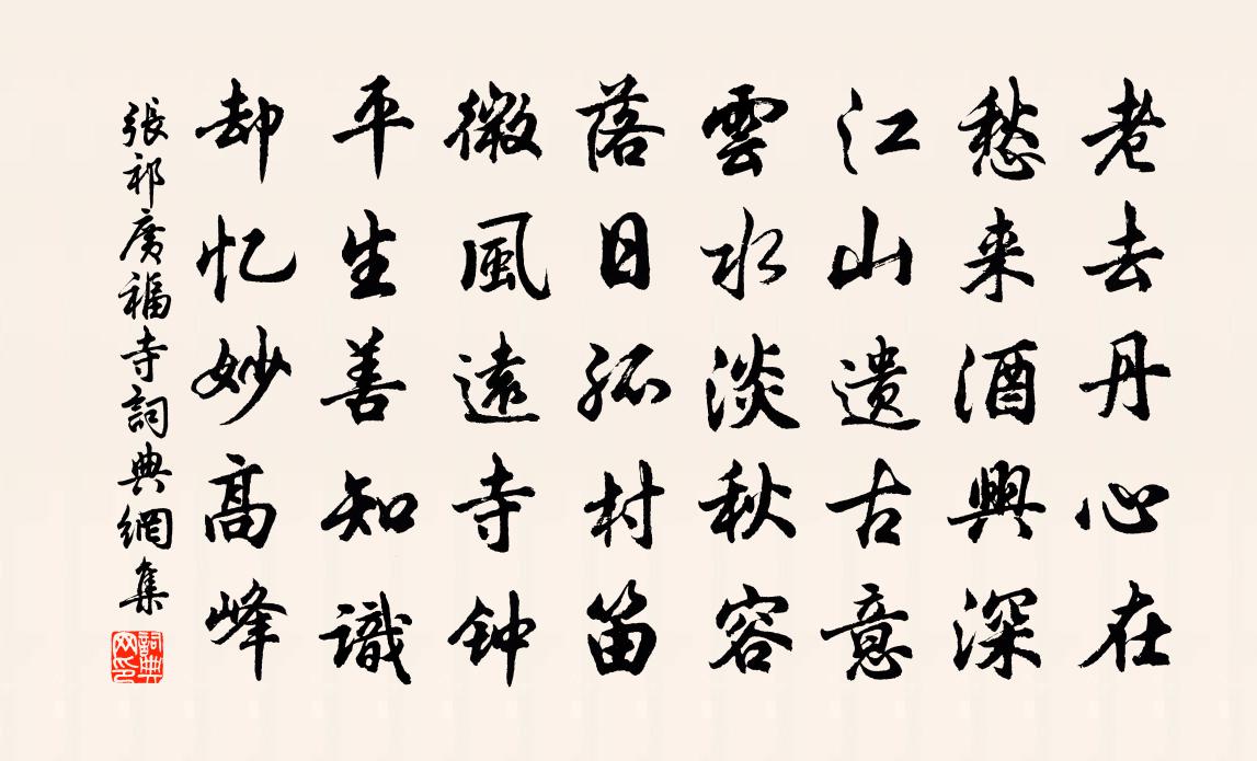 詩詞名句歷史字典書法欣賞書法字典國語詞典說文解字康熙字典古漢語字典標 題 作 者 詩 句 廣福寺作者:張祁 朝代:宋代廣福寺原文老去丹心在,愁來酒興深。江山遺古意,雲水淡秋容。落日孤村笛,微風遠寺鐘。平生善知識,卻憶妙高峰。詩詞問答問:廣福寺的作者是誰?答:張祁問:廣福寺寫於哪個朝代?答:宋代張祁廣福寺書法欣賞廣福寺書法作品詩詞推薦游龍井喻良能〔宋代〕致身通濕大槐夢,快意畋魚紫石潭。何似相攜古蘭若,細看香篆味茶甘。山中方岳〔宋代〕溪村楊柳好藏鴉,春水池塘已吠蛙。詩外共誰千里月,雨中老卻一山花。蝶將夢去客欹枕,燕寄聲來社到家。數掩和益陽趙宰六首廖行之〔宋代〕底事及幽冥,仁人惻隱情。憐渠猶旅骴,為爾返鄉城。泚顙人應化,分香訟亦平。存亡俱惠澤,高義與雲橫。大風謠楊維楨〔元代〕大風起,不終朝。如何三日夜,日日夜夜旋扶搖。卷水覆我舟,卷土覆我窯。烏乎太平玉琯將誰調,五日一風不鳴靈壽木張舜民〔宋代〕曲木天然性,叨名席上珍。節高工礙手,倚壁快扶人。莫問西來意,終為灶下薪。他時俘頡利,拜賜敢忘身。呈嬾翁六首白玉蟾〔宋代〕秋雨織愁成段,暮雲過眼生花。棲鳳亭中寂寞,武夷舊有仙家。漢苑行令狐楚〔唐代〕雲霞五采浮天闕,梅柳千般夾御溝。不上黃花南北望,豈知春色滿神州。憶遠張籍〔唐代〕行人猶未有歸期,萬里初程日暮時。唯愛門前雙柳樹,枝枝葉葉不相離。頌古一百二十一首釋宗杲〔宋代〕天地同根伸一問,未曾抬步已亡家。無陰陽處華重發,玉本無瑕卻有瑕。偈頌二十五釋智遇〔宋代〕金風吹落葉,玉露滴清秋。尀耐寒山子,無言笑點頭。既能明似鏡,何用曲如鉤。題高房山寫山村圖卷仇遠〔宋代〕我家仇山陽,昔有數椽屋。誤落塵市間,讀書學乾祿。井枯灶煙絕,況復問松菊。如此五十年,一出不可復。高侯江村晚秋作李中〔唐代〕高秋水村路,隔岸見人家。好是經霜葉,紅於帶露花。臨罾魚易得,就店酒難賒。吟興胡能盡,風清日又斜。十二月十八日會飲園夫獻桃花二首宋祁〔宋代〕晚秀尚可惜,早開真謂奇。君看早開處,定是向南枝。秋夜寄袁中丞、王員外錢起〔唐代〕一夕盈千念,方知別者勞。衰榮難會面,魂夢暫同袍。片月臨階早,晴河度雁高。應憐蔣生徑,秋露滿蓬蒿。送元厚之資政致仕歸蘇州曾鞏〔宋代〕笑指家園是五湖,畫船東下載圖書。收功玉鉉丹青後,得老銅樓羽翼初。醒醉放懷從野服,登臨乘興屬安車。都門三月晦游道場山宿清公房與成父同行二首鄧文原〔元代〕澗石縈紆紫竹叢,晴雲吹落水晶宮。夜寒身宿群峰頂,花盡春歸萬木中。儻買山田營破屋,時過僧寺駕孤篷。只應深上人見訪憶李端司空曙〔唐代〕雁稀秋色盡,落日對寒山。避事多稱疾,留僧獨閉關。心歸塵俗外,道勝有無間。仍憶東林友,相期久不還。次韻劉元煇初寒夜坐並序方回〔宋代〕山肩寒聳月隨歸,榾柮爐紅閉板扉。跨灶郎來濕課冊,齊眉人為摺深衣。花傳喜信燈如語,草就佳篇字欲飛。舊日智新上人話舊李洞〔唐代〕蟋蟀燈前話舊遊,師經幾夏我經秋。金陵市合月光里,甘露門開峰朵頭。晴眺遠帆飛入海,夜禪陰火吐當樓。相看呈希道兼寄不伐二首吳則禮〔宋代〕不見虎頭墨妙,聊尋燕頷將軍。興來未妨覓句,勝處端須策勛。名句推薦安得倚天劍,跨海斬長鯨。李白《臨江王節士歌》 善歌者,使人繼其聲;善教者,使人繼其志。戴聖《禮記·學記》 半卷紅旗臨易水,霜重鼓寒聲不起。李賀《雁門太守行》 聖人忘情,最下不及情;情之所鍾,正在我輩。劉義慶《世說新語·傷逝》 傷心闊別三千里,屈指思量四五年。韓偓《寒食日重遊李氏園亭有懷》 鋤禾日當午,汗滴禾下土。李紳《古風二首 / 憫農二首》 江湖多風波,舟楫恐失墜。杜甫《夢李白二首·其二》 迢迢新秋夕,亭亭月將圓。陶淵明《戊申歲六月中遇火》 西城楊柳弄春柔。動離憂。淚難收。秦觀《江城子·西城楊柳弄春柔》 風勁角弓鳴,將軍獵渭城。王維《觀獵》