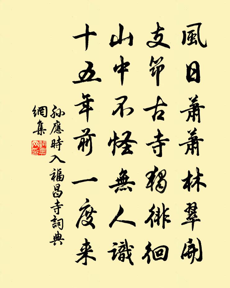 詩詞名句歷史字典書法欣賞書法字典國語詞典說文解字康熙字典古漢語字典標 題 作 者 詩 句 入福昌寺作者:孫應時 朝代:宋代入福昌寺原文風日蕭蕭林翠開,支筇古寺獨徘徊。山中不怪無人識,十五年前一度來。詩詞問答問:入福昌寺的作者是誰?答:孫應時問:入福昌寺寫於哪個朝代?答:宋代孫應時入福昌寺書法欣賞入福昌寺書法作品詩詞推薦西縣道中有短亭,岩穴飛泉隔江灑至,因成二首薛能〔唐代〕風涼津濕共微微,隔岸泉沖石竅飛。爭得巨靈從野性,舊鄉無此擘將歸。一瀑三峰赤日天,路人才見便翛然。誰能江神子(發金陵)方岳〔宋代〕梅花吹夢過溪橋。路迢迢。雪初消。似恁天寒,詩瘦想無柳。聽得草堂人有語,能幾日,是生朝。亂雲深處洗山瓢頌古十九首釋法全〔宋代〕遍身是,通身是,淨潔渾身涴卻屎。拽來露出猛風吹,誰教背手摸枕子。九日席上賦得茱萸韓維〔宋代〕寥落霜園樹,萸房獨照秋。實兼蘭佩結,香近玉卮浮。嗔蕊醒殘醉,紉紅感舊遊。三英佳句在,殊喜繼風流。老馬行方回〔宋代〕十年何啻騎千馬,望風此馬甘為下。老夫與爾共艱難,定非苟且相逢者。憶昔專城鬢欲霜,宇宙茫茫成戰場。指呼寄題瑞昌簿廳景蘇堂墨竹釋道璨〔宋代〕一葉復一葉,世道幾翻覆。一點復一點,書脈要接續。親見長公來,一節不肯曲。見竹如見公,北麓能不俗。回首馮元素輓詩項安世〔宋代〕戎服開清洛,儒書謁阜陵。一朝官御晚,平日壯心冰。此士歸來夜,何人說中興。秋來原上草,蕭索見風棱。雪黃景說〔宋代〕瑤林中有翳桑兒,鼎貴生涯不救飢。願縮天人散花手,放渠奔走趁晨炊。題劉有方御藥翠岩亭強至〔宋代〕購石黃金費,開軒翠玉叢。端居憐象魏,遠意自衡嵩。花弄疏簾日,禽呼靜榻風。移山寧有術,未易笑愚公。劉待詔老子出關圖卷劉意〔宋代〕不馳駿馬駕青牛,西度函關紫氣浮。文字五千傳道德,僅同釋教讓儒流。水龍吟 傅淵道宅上賞紫牡丹張翥〔元代〕紫云何處飛來,仙家別有藏春洞。刻繒紋皺,鏤檀色膩,薰臍香重。穀雨初晴,榆煙新換,楝風微動。是花姑養就寄魏元履劉子翬〔宋代〕世情事虛文,十幅了一書。片言倒肺腑,子獨不佞予。班班眼中秀,學膽誰似渠。平生幾兩屩,踏破牛斗墟。小言寺趙葵〔宋代〕溪繞青山山繞溪,溪山勝處只僧知。支閒古木禪關靜,不到禪關又幾時。天柱庵陳岩〔宋代〕石壁參天駐冷雲,一聲幽鳥忽驚人。庵前庵後山如舊,朽柏年來不再春。送李德遠寺丞奉祠歸臨川陸游〔宋代〕送騎擁東城,煙帆如鳥輕。道行端有命,身隱更須名?旰食煩明主,胡沙暗舊京。臨分一襟淚,不獨為交情。勝景園董嗣杲〔宋代〕名花裊裊草纖纖,台榭隨幽邃勝添。十樣結亭環水樹,一碑述記臥風檐。梅關橋落停{槴邑換睘}鑰,射圃樓空失芙蓉吳芾〔宋代〕誰向澄波上,心將雲錦鋪。無因一寓目,卻憶小西湖。泊姚江王安石〔宋代〕軋軋櫓聲急,蒼蒼江日低。吾行有定止,潮汐自東西。和翁士秀瑞香水仙二首曾協〔宋代〕蝶繞蜂團碧玉叢,紫羅囊水透香風。自從鼻觀銷煩惱,疑在維摩丈室中。滿庭芳佚名〔宋代〕標格清高,性姿雅淡,群芳獨步惟梅。當年秀氣,付作此奇材。不逐東風桃李俗,冰霜里、彈壓春回。還應是,崧名句推薦斷虹霽雨,淨秋空,山染修眉新綠。黃庭堅《念奴嬌·斷虹霽雨》 修竹畔,疏簾里。歌余塵拂扇,舞罷風掀袂。謝逸《千秋歲·詠夏景》 枕中雲氣千峰近,床底松聲萬壑哀。曾公亮《宿甘露寺僧舍》 公乎躍馬揚玉鞭,滅沒高蹄日千里。溫庭筠《拂舞詞 / 公無渡河》 綠陰青子老溪橋。羞見東鄰嬌小。吳文英《西江月·賦瑤圃青梅枝上晚花》 接天蓮葉無窮碧,映日荷花別樣紅。楊萬里《曉出淨慈寺送林子方》 仁也者,人也。合而言之,道也。孟子《孟子·盡心章句下·第十六節》 爭渡,爭渡,驚起一灘鷗鷺。李清照《如夢令·常記溪亭日暮》 一年最好,偏是重陽。吳文英《惜黃花慢·菊》 木謂之華,草謂之榮。佚名《爾雅·釋草》