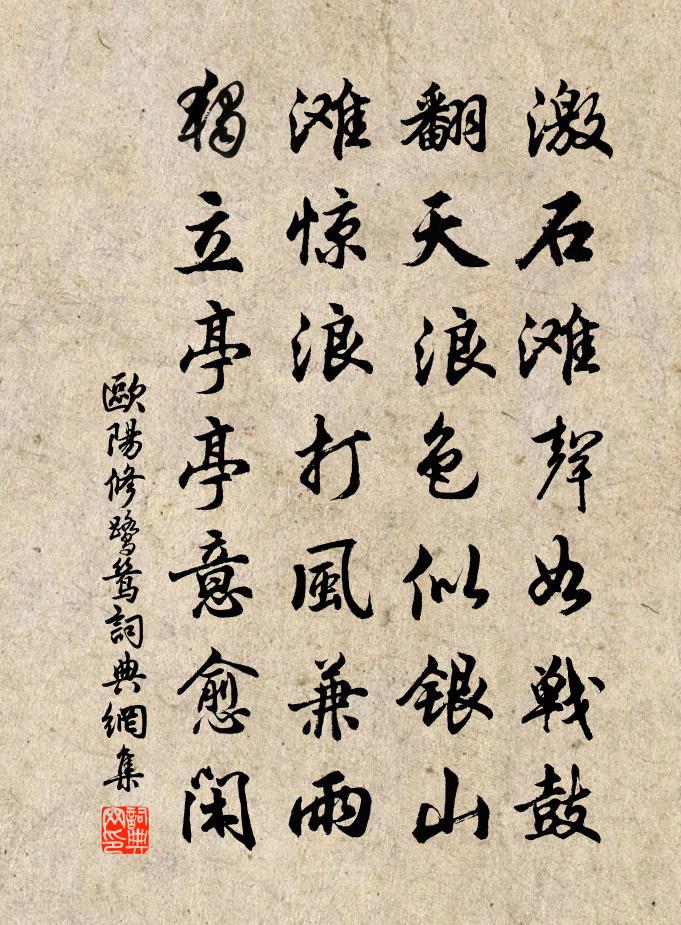 激石灘聲如戰鼓,翻天浪色似銀山。灘驚浪打風兼雨,獨立亭亭意愈閒。