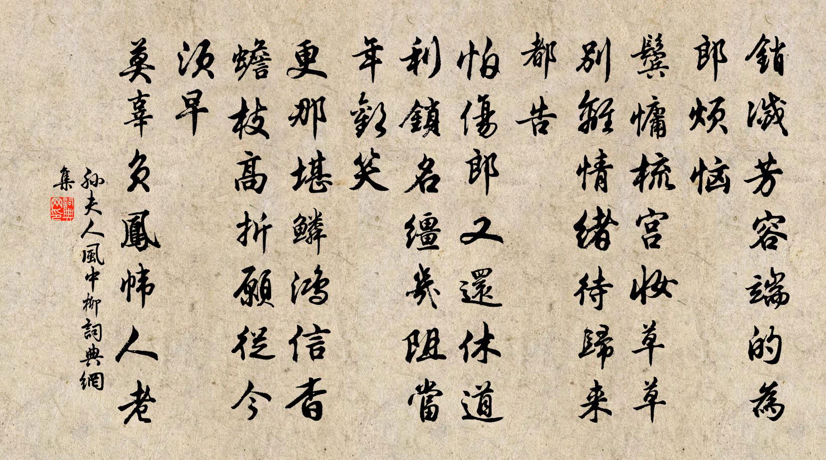詩詞名句歷史字典書法欣賞書法字典國語詞典說文解字康熙字典古漢語字典標 題 作 者 詩 句 風中柳/謝池春作者:孫夫人 朝代:宋代風中柳/謝池春原文銷滅芳容,端的為郎煩惱。鬢慵梳、宮妝草草。別離情緒,待歸來都告。怕傷郎、又還休道。利鎖名韁,幾阻當年歡笑。更那堪、鱗鴻信杳。蟾枝高折,願從今須早。莫辜負、鳳幃人老。詩詞問答問:風中柳/謝池春的作者是誰?答:孫夫人問:風中柳/謝池春寫於哪個朝代?答:宋代問:風中柳/謝池春是什麼體裁?答:詞孫夫人風中柳/謝池春書法欣賞風中柳/謝池春書法作品詩詞推薦滿庭芳元好問〔金代〕偃屈霜青,*層煙碧,□□□古人間。山光林色,常伴住人閒。元有仙風道骨。□心趁、玉筍朝班。歸來賦,不因偈頌三十六首釋如珙〔宋代〕盡大地冷啾啾,逼十方鬧浩浩。放過布袋和尚,穿卻解空鼻孔。東天目施樞〔宋代〕不辭巘險訪龍潭,潭底無窮碧似藍。亂石鳴灘溪過九,飛泉瀉瀑塹分三。雖然道士能相引,不比樵人得盡諳。怊悵寄閻承旨靖軒方回〔宋代〕相逢偶值寄梅人,今歲江南暖未勻。報與玉堂真學士,小詩聊當一枝春。贈琴妓二首陳造〔宋代〕千紙爭傳戛玉詞,一庭渾臥借書郗。從今有問新知識,徑說江城女項斯。臨江仙劉過〔宋代〕滿院花香晴晝永,愔愔亭戶無人。誰將心緒管青春。遊絲知我懶,江柳也眉顰。近水遠山都積恨,可堪芳草如茵。陳主管招飲陳造〔宋代〕鵲拳庭竹語頻頻,忽有書來寂寞濱。盛事許同花燭夜,芳辰仍醉綺羅春。璧聯香合初鳴鳳,霞泛仙觴定脯麟。更辦送襄垣王君歸南陽別墅韓翃〔唐代〕都門霽後不飛塵,草色萋萋滿路春。雙兔坡東千室吏,三鴉水上一歸人。愁眠客舍衣香滿,走渡河橋馬汗新。少婦大觀祭風師六首佚名〔宋代〕明昭惟聲,威備孔時。鏘鏘鳴佩,欽薦牲犧。惟恭惟祗,無愆無達。周旋中禮,肅恭委蛇。玉壺即事杜范〔宋代〕雨過條風著柳芽,淡黃淺綠嫩如花。陂湖漾漾初侵路,蜂燕紛紛各理家。帶郭園林仙苑近,送春船舫繡簾遮。芸窗遠遊文天祥〔宋代〕黃河流活活,太行高巍巍。王屋山以東,百泉山以西。鄒魯盛文獻,燕趙多雄姿。右摩泰山碑,左躡函谷泥。郟鄏天竺戲書釋紹嵩〔宋代〕出郭西湖近,貪看立又行。園林青氣動,日夕白雲生。映竹犬初吠,緣溪鶴自鳴。殷勤下天竺,泉石愜幽情。四月一日夜漏欲盡起坐達旦陸游〔宋代〕春歸不可留,斗柄已崢嶸;老至不可卻,雪鬢森千莖。少年所讀書,廢忘如隔生。舊交死欲盡,存者萬里程。高談衰柳吳仁璧〔唐代〕金風漸利露珠團,廣陌長堤黛色殘。水殿狂游隋煬帝,一千餘里可堪看。自九里平水至雲門陶山歷龍瑞禹祠而歸凡四日陸游〔宋代〕我來恰值暮春初,晝漏微長小雨余。苔蝕秦碑亡舊刻,龍歸禹穴護遺書。燕巢已壘泥猶濕,花片雖殘葉尚疏。到處淳化鄉飲酒三十三章佚名〔宋代〕瞻彼南陔,時物嘉良。有泉清泚,有蘭聲香。晨飲是汲,夕膳是賞。慈顏未悅,我民靡遑。晁園曾幾〔宋代〕晁氏芳菲圃,因依淥水潯。峰巒春著色,桃李晝成陰。可惜花狼籍,仍遭雨滯淫。饒陽供客眼,只有此園林。東宮生日六首乙未林光朝〔宋代〕應律隨豳雅,旋杓建戌方。前星迎霽色,重日麗晨光。笙管青霞外,宮庭碧玉傍。本支周道盛,羽翼漢圖昌。左右送從子令憲西歸魏了翁〔宋代〕古來明戒有弦鉤,伯父胡為苦好修。累爾南行數千里,我之自怪爾何尤。萬太博知惠州祖無擇〔宋代〕惠州君未到,聽我送君吟。去路九韶石,鄰封八桂林。下車秋色老,望闕海雲深。善政多餘暇,無忘惠好音。名句推薦搖鏡,則不得為明;搖衡,則不得為正韓非及後人《韓非子·飾邪》 不茶不飯,不言不語,一味供他憔悴。蜀妓《鵲橋仙·說盟說誓》 楊花落盡子規啼,聞道龍標過五溪。李白《聞王昌齡左遷龍標遙有此寄》 金風細細。葉葉梧桐墜。晏殊《清平樂·金風細細》 天下不患無臣,患無君以使之。天下不患無財,患無人以分之。管仲《管子·牧民》 不論平地與山尖,無限風光盡被占羅隱《蜂》 桃李待日開,榮華照當年。李白《長歌行》 玉門山嶂幾千重,山北山南總是烽。王昌齡《從軍行七首》 大難不死,必有後祿。馮夢龍《喻世明言·卷二十一》 昨夜星辰昨夜風,畫樓西畔桂堂東。李商隱《無題·昨夜星辰昨夜風》