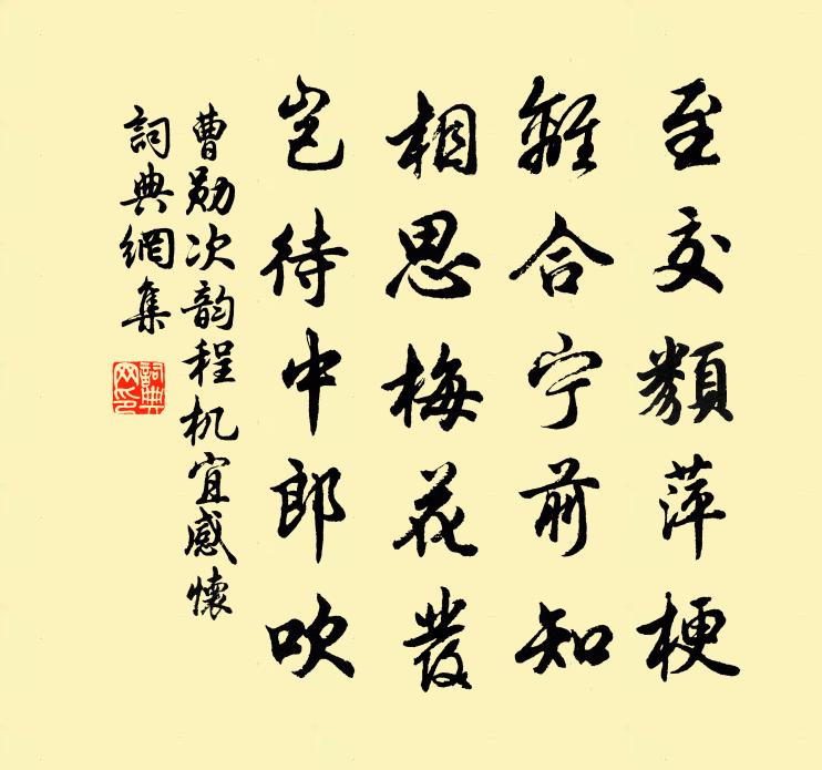 詩詞名句歷史字典書法欣賞書法字典國語詞典說文解字康熙字典古漢語字典標 題 作 者 詩 句 次韻程機宜感懷作者:曹勛 朝代:宋代次韻程機宜感懷原文至交類萍梗,離合寧前知。相思梅花發,豈待中郎吹。詩詞問答問:次韻程機宜感懷的作者是誰?答:曹勛問:次韻程機宜感懷寫於哪個朝代?答:宋代曹勛次韻程機宜感懷書法欣賞次韻程機宜感懷書法作品詩詞推薦題貴州南山岩曾豐〔宋代〕崒嵂窮頭與漢齊,谽谺深處著招提。居焉若寢瓊為室,登者如仙玉作梯。雲竅旁通吞日月,煙蘿倒拔掛虹蜺。我來留別關東舊遊薛能〔唐代〕我去君留十載中,未曾相見及花紅。他時住得君應老,長短看花心不同。題扇二十四首曹勛〔宋代〕庭萱戢戢漏新春,檻外梅花冷帶雲。與客對床風撼竹,一燈殊喜細論文。五家林四首張鎡〔宋代〕岸轉欣逢撆撆兒,蹙成千步中央委員琉璃。沒波豈但尋魚吃,水不能濡只我知。玉台觀杜甫〔唐代〕浩劫因王造,平台訪古游。彩雲蕭史駐,文字魯恭留。宮闕通群帝,乾坤到十洲。人傳有笙鶴,時過此山頭。送春有感五邁〔宋代〕東君行趣裝,桃李事如夢。蝶懶欲息游,鶯老不好弄。殘紅正可憐,更禁風雨送。榆莢羞獨飛,卻惱楊花共。去年邵公濟求泰定山房十詩盡山亭蘇籀〔宋代〕蟻封於何險,醯雞豈必嗤。須彌一目了,亭中大然之。孔叢子引遺諺先秦無名〔先秦〕堯舜千鍾。孔子百觚。子路嗑嗑。尚飲十榼。姑孰官舍許渾〔唐代〕草生宮舍似閒居,雪照南窗滿素書。貧後始知為吏拙,病來還喜識人疏。青雲豈有窺梁燕,濁水應無避釣魚。不待蓬屋一首王阮〔宋代〕和檐十尺庇堂東,疎漏從來儘是蓬。日影碎如秋葉下,雨聲灑似夜船中。竹因蠹盡多垂地,箬到枯時半掩空。此處從貫道求雙幅圖吳則禮〔宋代〕東郎平生筆五色,戲遣秀句為奇石。好絹自作凌亂光,萬里須論才咫尺。大兒小兒何足夸,右丞北苑有等差。孤舟上山采蘼蕪兩漢樂府〔兩漢〕上山采蘼蕪,下山逢故夫。長跪問故夫,新人復何如?新人雖完好,未若故人姝。顏色類相似,手爪不相如。新人金沙台呂祖儉〔宋代〕謫居無地寄幽懷,□有高台自漢開。紫極晨光招我望,錦江春色逐誰來。賡歌惟憶多炎裔,作賦應憐乏賈才。人物江亭晚眺張紹文〔宋代〕登高便可豁雙明,吟外還能見物情。南北盛衰關大數,英雄得失總虛名。莫雲千里鄉心遠,寒雁一聲秋意清。江上玉樓春歐陽修〔宋代〕西湖南北煙波闊。風裡絲簧聲韻咽。舞餘裙帶綠雙垂,酒入香腮紅一抹。杯深不覺琉璃滑。貪看六么花十八。明朝元應善利真人祠唐仲友〔宋代〕丹邱壤千里,水旱固所司。吾民實可矜,有守孰不祈。應汝捷影響,樂歲免阻飢。萬民齊叫閽,天子遠亦知。春社日祀事既畢轎中得三絕魏了翁〔宋代〕輾然馮軾受風吹,吏皂前驚雨濕衣。豈識主人非崛強,一川生意索褰幃。雨傘釋道濟〔宋代〕一竿翠竹,巧匠批欒。條條有眼,節節皆穿。四大假合,柄在人手。歸家放下,並不爭先。真饒瓮瀉盆傾下,一搭青泥雪中和德麟韻李廌〔宋代〕君笑吾痴絕,吾知自不痴。遠遊陪勝士,歸橐有新詩。笑覺山途近,寒因酒力遲。相從畏嘲謔,別後復懷思。自西懸趨南鄭道中雜詠三首李新〔宋代〕矮陌穹廬青匝地,垂楊步幛綠藏橋。無端驚耳西江漲,十里雄聲學海潮。名句推薦大江流日夜,客心悲未央。謝朓《暫使下都夜發新林至京邑贈西府同僚》 動失之繁,靜失之寡。王通《中說·卷十·關朗篇》 潦倒不通世務,愚頑怕讀文章。曹雪芹《紅樓夢·第三回》 蔡女菱歌移錦纜,燕姬春望上瓊鉤。上官儀《詠畫障》 雁引愁心去,山銜好月來。李白《與夏十二登岳陽樓》 恨入空帷鸞影獨,淚凝雙臉渚蓮光,薄情年少悔思量。顧敻《浣溪沙·荷芰風輕簾幕香》 照野瀰瀰淺浪,橫空隱隱層霄。蘇軾《西江月·頃在黃州》 長風萬里送秋雁,對此可以酣高樓。李白《宣州謝朓樓餞別校書叔雲 / 陪侍御叔華登樓歌》 魯酒不可醉,齊歌空復情。李白《沙丘城下寄杜甫》 倚遍闌乾,只是無情緒。李清照《點絳唇·閨思》