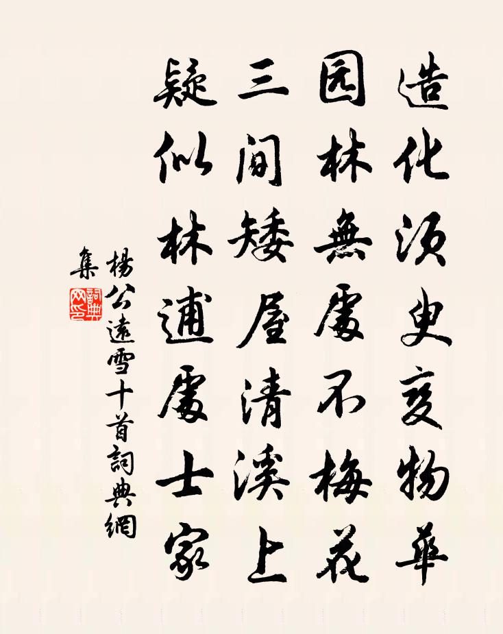詩詞名句歷史字典書法欣賞書法字典國語詞典說文解字康熙字典古漢語字典標 題 作 者 詩 句 雪十首作者:楊公遠 朝代:宋代雪十首原文造化須臾變物華,園林無處不梅花。三間矮屋清溪上,疑似林逋處士家。詩詞問答問:雪十首的作者是誰?答:楊公遠問:雪十首寫於哪個朝代?答:宋代楊公遠雪十首書法欣賞雪十首書法作品詩詞推薦維摩贊釋惟一〔宋代〕凜然夷齊之風,悠然巢許之態。橫作竺乾之孽,崛起釋門之害。口吧吧地說盡萬千,究竟不知有這一解。次韻李參政秋懷十絕魏了翁〔宋代〕穉金老火戰重圍,京洛緇塵點客衣。輸卻東園南閣老,水花闌檻夕陽稀。訴衷情(宮怨)謝絳〔宋代〕銀缸夜永影長孤。香草續殘爐。倚屏脈脈無語,粉淚不成珠。雙粲枕,百嬌壺。憶當初。君恩莫似,秋葉無情,欲四月一日同潘何小酌張耒〔宋代〕今晨一杯酒,相屬送歸春。明年東風至,何處復迎新。懸知柯山下,猶作未知人。來者事如夢,未至難預論。且使興龍節致語口號陳師道〔宋代〕劍佩聲來合玉除,騏驎煙上暗金鋪。近臣先識天顏喜,九奏初知晝景舒。東海為田將幾見,南山稱壽已三呼。欲知句張釜〔宋代〕風緩帆舒捲。次韻答陣夢錫十首陳造〔宋代〕九重聖孝絕今古,矞雲麗晝南山高。台合不無補袞手,付我五畝耘艾蒿。次韻似表弟卜居惠山李彌遜〔宋代〕梁溪舊隱吾家紳,石苔猶銷松間門。向來兄弟寄觴詠,日月轉轂相朝昏。自君之別各千里,萬金誰與通寒溫。棣華分水縣舍夜遇大雪朱翌〔宋代〕揮扇解衣真早計,果然一夕變春陰。屋頭瓦裂風掀戶,床上珠跳雪滿衾。我自不妨高枕臥,人今更有惜花心。此行南溪詩李渤〔唐代〕玄岩麗南溪,新泉發幽色。岩泉孕靈秀,雲煙紛崖壁。斜峰信天插,奇洞固神辟。窈窕去未窮,環回勢難極。玉池寄北山順法師二首陳師道〔宋代〕山下游塵不污人,耳邊溪水去猶聞。羨君身世渾無事,坐看青山過白雲。偈頌八十七首釋慧開〔宋代〕鬧市紅塵,入里垂手。纏涉思惟,劈脊便摟。詠雪得光字張嵲〔宋代〕東皇攜春來,屬車載霓裳。迴風作妙舞,雜佩鳴珠璫。千官玉筍班,再拜稱瑤觴。酒罷各分端,圭琮粲琳琅。浩蕩曾達臣輓詞二首楊萬里〔宋代〕議論千千古,胸懷一一奇。非關時棄我,不肯我於時。老鶴雲間意,長松雪外姿。平生獨知命,冷眼看人痴。夕霽杜陵登樓寄韋繇李白〔唐代〕浮陽滅霽景,萬物生秋容。登樓送遠目,伏檻觀群峰。原野曠超緬,關河紛雜重。清暉映竹日,翠色明雲松。蹈海後江行十絕岳珂〔宋代〕人生最好是歸來,六月火雲溶雪醅。散發晞風須一醉,月明攜簟又涼台。悼白雲王冕〔元代〕濁世儒名多浪得,先生高隱冠當今。注書已發程朱蘊,講道重明孔孟心。白日山林增氣象,清風江海振希音。少微奉和御製甘雨應祈夏竦〔宋代〕少臯九秋當季月,成湯六禱動靈心。中宵甘澍均豐浸,盡日層雲結遠陰。銷去驕陽為瑞重,招來嘉應感人深。側身次韻答菊莊湯伯起武衍〔宋代〕數弓蔬地一方池,吾愛吾廬只自知。蘆碧補交楊柳缺,檉紅攙上藕花遲。翠陰圍合疑無日,涼意蕭騷剩有詩。君欲偈頌七十二首釋祖欽〔宋代〕言發非聲,色前不物。當機覿面全提,豈在拈槌豎拂。山河大地,不礙眼光,萬象森羅,形端影直。名句推薦妖嬈艷態,妒風笑月,長殢東君。李清照《慶清朝·禁幄低張》 樓頭客子杪秋後,日落君山元氣中。陳與義《登岳陽樓》 駸駸嬌眼開仍,悄無人至還凝佇。文徵明《青玉案·庭下石榴花亂吐》 信宿漁人還泛泛,清秋燕子故飛飛。杜甫《秋興八首》 古剎疏鍾度,遙嵐破月懸。李賀《南園十三首》 莫道讒言如浪深,莫言遷客似沙沉。劉禹錫《浪淘沙九首》 蓄疑敗謀,怠忽荒政佚名《尚書·周書·周官》 對酒捲簾邀明月,風露透窗紗。蘇軾《少年游·潤州作》 煢煢白兔,東走西顧。佚名《古艷歌》 寒食不多時,牡丹初賣。晁沖之《感皇恩·寒食不多時》