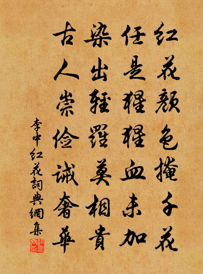 詩詞名句歷史字典書法欣賞書法字典國語詞典說文解字康熙字典古漢語字典標 題 作 者 詩 句 紅花作者:李中 朝代:唐代紅花原文紅花顏色掩千花,任是猩猩血未加。染出輕羅莫相貴,古人崇儉誡奢華。詩詞問答問:紅花的作者是誰?答:李中問:紅花寫於哪個朝代?答:唐代問:紅花是什麼體裁?答:七絕李中紅花書法欣賞紅花書法作品注釋全唐詩:卷749-6詩詞推薦山中吟陳允平〔宋代〕日出華山陽,月出廬山崗。巫山雲漠漠,雁山煙蒼蒼。春日古道傍作杜牧〔唐代〕萬古榮華旦暮齊,樓台春盡草萋萋。君看陌上何人墓,旋化紅塵送馬蹄?原壤歌先秦無名〔先秦〕貍首之斑然。執女手之卷然。答贊寧天目僧〔宋代〕山中人事違,天眼中修定。我本無根株,只將筍為命。依韻和歐陽永叔秋懷擬孟郊體見寄二首梅堯臣〔宋代〕秋思公何高,堆積自嵱嵷。出為悲秋辭,萬仞見孤聳。念我老於詩,我發實種種。而後傷故人,故人多作冢。陰風再作十絕寄胡伯負兵侍仲方尚書李元實〔宋代〕澹翁直氣貫三才,入座雲仍漸上台。料想而今聞底事,中心應亦念渠回。寒士吟方回〔宋代〕小貪咂蚊蠅,大貪噬豺狼。此類殊不少,毒虐紛披猖。獨彼寒士者,自身無衣裳。唧唧如蟋蟀,與人憂雪霜。平生午熱登多稼亭五首楊萬里〔宋代〕柳外花邊忽颯然,好風一點破愁顏。岸巾獨倚千尋樹,閒看南雲度北山。和朱公掞禱雨五龍廟李復〔宋代〕太師占歲驗律管,氣來姑洗聲猶短。野欠告病三月余,公堂嚴齋五日滿。相招禱雨陟南山,出城鞭馬追飛繖。林鳩雨中花(武康秋雨池上)毛滂〔宋代〕池上山寒欲霧。竹暗小窗低戶。數點秋聲侵短夢,檐下芭蕉雨。白酒浮蛆雞啄黍。問陶令、幾時歸去。溪月嶺雲紅頌古十二首釋法泰〔宋代〕多子塔前衣付後,更傳何物示於人。雙珠迸出剎竿倒,直得寒光徹四鄰。書事晁說之〔宋代〕一江如鼎魚龍沸,我欲逃生何所之。今古興亡有同恨,乾陵火照奉天時。士穎弟作真率會次韻樓鑰〔宋代〕何羨祖希情好隆,朱陳累世意交通。舅甥巾屨頻相接,兄弟樽罍喜更同。參坐幸容攻愧子,主盟全賴適齋翁。日來句陶弼〔宋代〕轉葉香隨風,舒花影凌日。喜翟穎先輩至有感宋祁〔宋代〕門下客逾落,胡為君見從。墜餘仍顧甑,寒罷始知松。休計流光邁,聊欣此地逢。已甘漂似梗,寧止啞如鍾。仕路用清秋鶴髮翁韻賦小書招潔堂馬廷鸞〔宋代〕幽居抱孤明,懷古思舊京。渴望寶連山,老桂不勝清。踏雲行劉處玄〔元代〕子母相逢,自然明道。出離物彀無生老。茅齋公竹每為鄰,清居幽闃仙家好。敬信高明,真歡無惱。各人性命修宜宿雄江統制衙董嗣杲〔宋代〕往分蓮社供,歸向草廬眠。山寨差更鼓,春江走戰船。風光隨處別,鬢影倩誰憐。花柳西湖曲,招邀憶去年。送李侍郎歸衡州二首王炎〔宋代〕道重物自輕,心清內無欲。未定胸中見,難行天下獨。冠蓋上青雲,著鞭競馳逐。南山有德人,一笑遺寵辱。巋然上元漫興李呂〔宋代〕天上元宵放月明,張燈何苦浪經營。一毬積日方呈巧,千片輕綃僅湊成。里巷禽呼傾坐去。街衢蟻聚側身行。誰人名句推薦一片春愁待酒澆。江上舟搖,樓上簾招。蔣捷《一剪梅·舟過吳江》 六朝文物草連空,天淡雲閒今古同。杜牧《題宣州開元寺水閣閣下宛溪夾溪居人》 小姑織白紵,未解將人語。李白《湖邊採蓮婦》 昨夜吳中雪,子猷佳興發。李白《答王十二寒夜獨酌有懷》 行雲歸楚峽,飛夢到揚州。晁補之《臨江仙·綠暗汀洲三月暮》 不忍覆余觴,臨風淚數行納蘭性德《菩薩蠻·催花未歇花奴鼓》 昔有佳人公孫氏,一舞劍器動四方。杜甫《觀公孫大娘弟子舞劍器行》 人怕出名豬怕壯曹雪芹《紅樓夢·第八十三回》 白馬繞旌旗,悲鳴相追攀。李白《豫章行》 高樓送客不能醉,寂寂寒江明月心。王昌齡《芙蓉樓送辛漸二首》